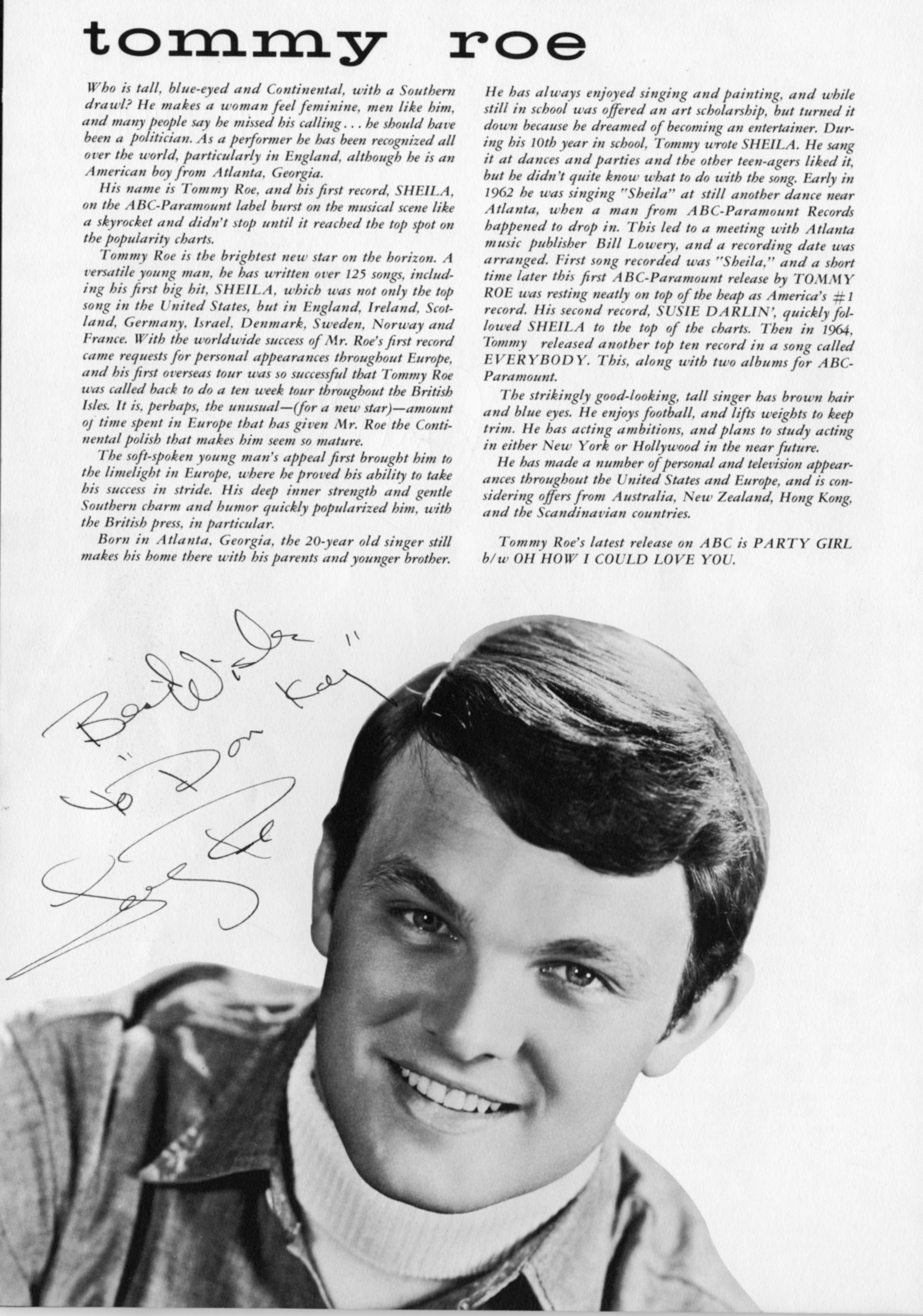 Tommy RoeTommy Roe Tommy Roe American rock and pop singer-songwriter (born 1942) For the English footballer, see Tommy Roe (footballer). Thomas David Roe (born May 9, 1942) is an American rock and pop singer-songwriter.[1] Quick facts Background information, Born ... Tommy Roe Roe in 1970 Background information Born Thomas David Roe (1942-05-09) May 9, 1942 (age 83) Atlanta, Georgia, U.S. Genres Rock and roll pop bubblegum[1] Occupations Singer, songwriter Instruments Vocals, guitar Years active 1959–2018, 2022–present Labels Judd Records, ABC Paramount Records, Monument Records, MGM Records, His Master's Voice Website tommyroe.com Close Best-remembered for his hits "Sheila" (1962), "Sweet Pea" (1966) and "Dizzy" (1969), Roe was "widely perceived as one of the archetypal bubblegum artists of the late 1960s, but cut… (Source: Wikipedia)