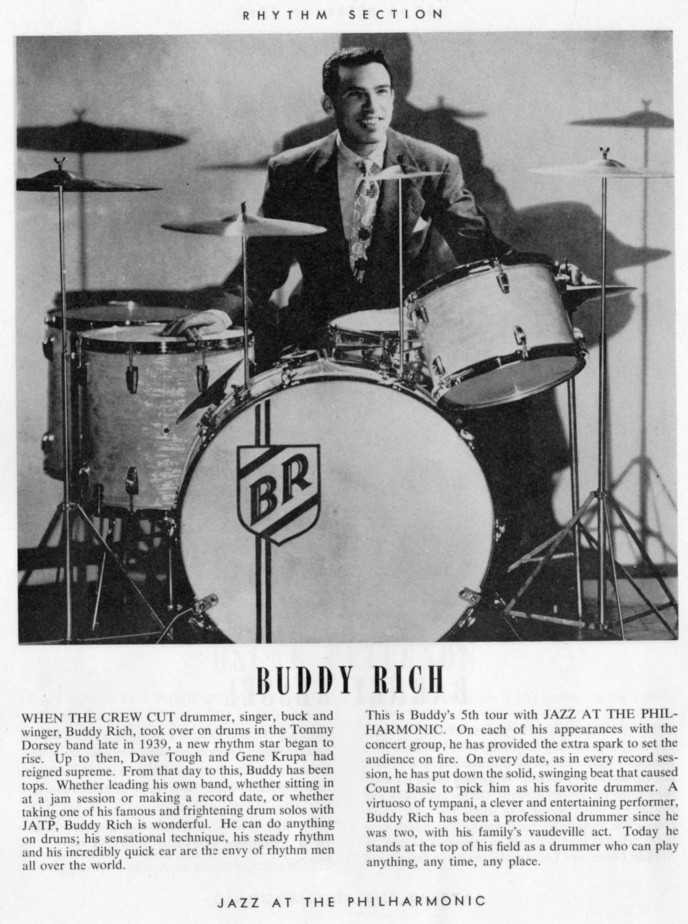 Buddy RichBuddy Rich Buddy Rich American jazz drummer and bandleader (1917–1987) "Mr. Drums" redirects here; for one of the two albums with this title, see Mr. Drums: Buddy Rich & His Band Live on King Street, San Francisco. "Buddy Rich Band" also redirects here; for the album, see Buddy Rich Band (album). Bernard "Buddy" Rich (September 30, 1917 – April 2, 1987)[1] was an American jazz drummer, songwriter, conductor, and bandleader. He is considered one of the most influential drummers of all time.[2] Quick facts Background information, Also known as ... Buddy Rich Rich at the Arcadia Ballroom in 1947 Background information Also known as Traps The Drum Wonder Mr. Drums Born Bernard Rich (1917-09-30)September 30, 1917 Brooklyn, New York, U.S.… (Source: Wikipedia)