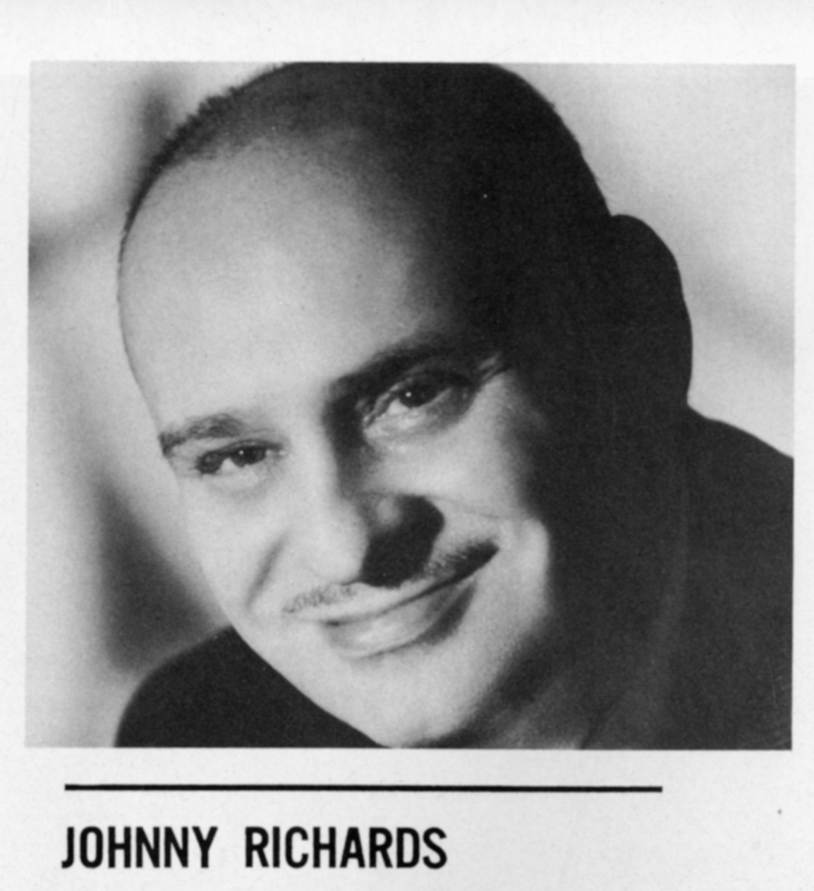 Johnny RichardsJohnny Richards Johnny Richards American jazz arranger and composer (1911–1968) Johnny Richards (born Juan Manuel Cascales, November 2, 1911 – October 7, 1968) was an American jazz arranger and composer scoring numerous sound tracks for television and film.[2] He was a pivotal composer/arranger for cutting edge, adventurous performances and recording sessions by Stan Kenton's big band in the 1950s and early 1960s; such as Cuban Fire!, Kenton's West Side Story and Adventures in Time.[2] Quick facts Background information, Born ... Johnny Richards Clockwise from left: Eddie Sauter, Edwin Finckel, George Handy, Richards, Neal Hefti, and Ralph Burns at the Museum of Modern Art, New York, c. 1947[1] Background information Born Juan Manuel Cascales (1911-11-02)November 2, 1911 Querétaro, Mexico Died October… (Source: Wikipedia)