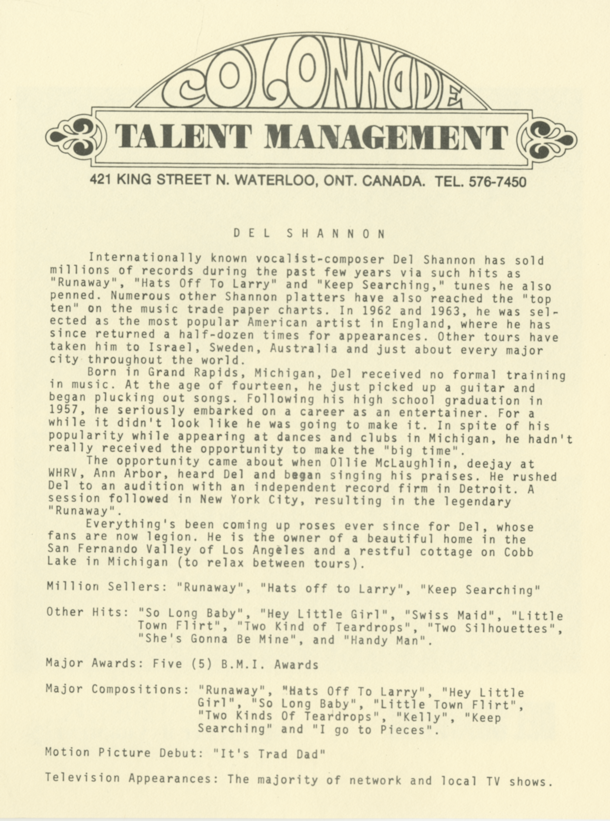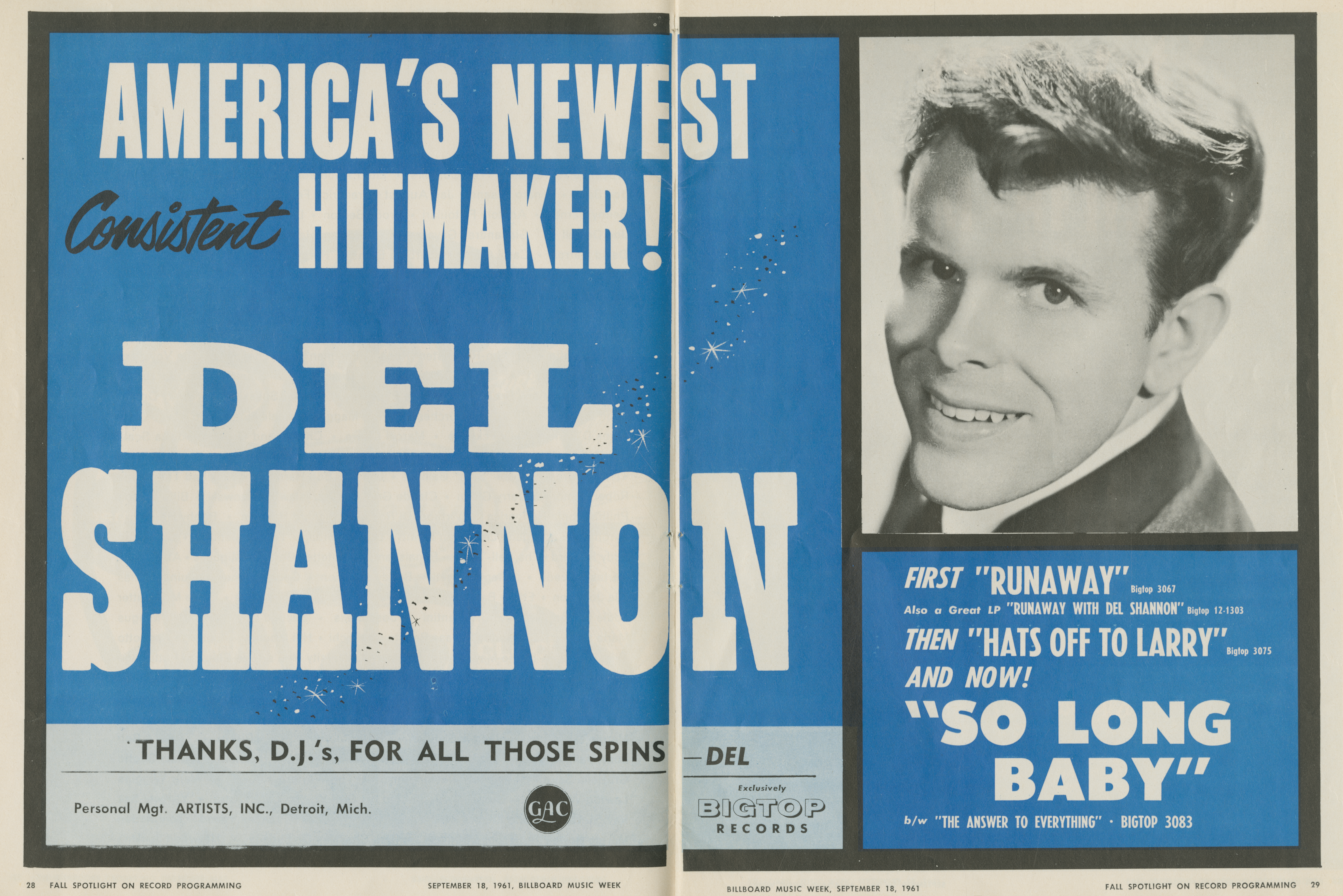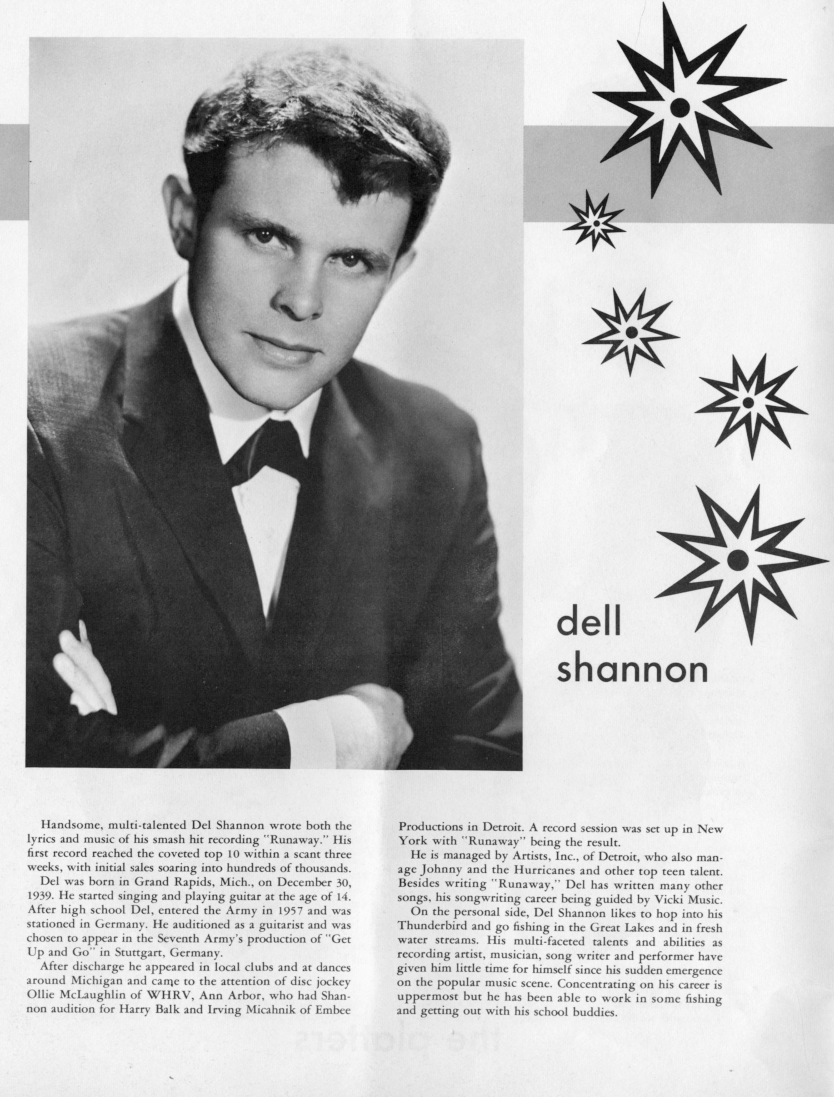![]() Photo of Del Shannon in 1965. Image by Amy Records, via Wikimedia Commons. Licensed Public domain |