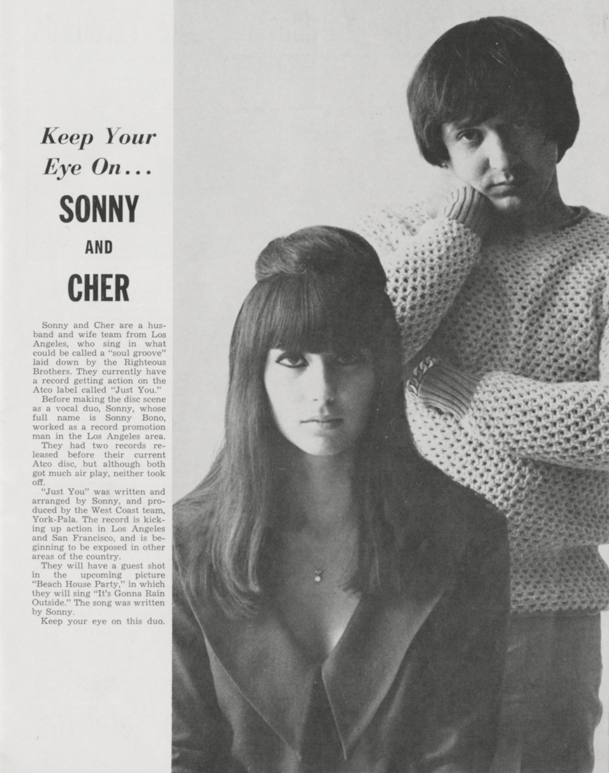 Sonny & CherSonny & Cher Sonny & Cher American pop music duo Sonny & Cher were an American pop and entertainment duo composed of husband-and-wife Sonny Bono and Cher. Rising to fame in the mid-1960s, the pair became one of the decade's most recognizable acts with a string of hit singles, including "Baby Don't Go," "I Got You Babe," "But You're Mine," "What Now My Love" and "The Beat Goes On." Quick facts Background information, Origin ... Sonny & Cher Sonny & Cher in 1966 Background information Origin Los Angeles, California, U.S. Genres Pop pop rock folk rock Years active 1964–1977[a] Labels Vault (1964) Reprise (1964–1965) Atco/Atlantic (1965–1967) MCA/Kapp (1971–1974) Warner Bros. (1977) Past members Sonny Bono † Cher Close The couple… (Source: Wikipedia)