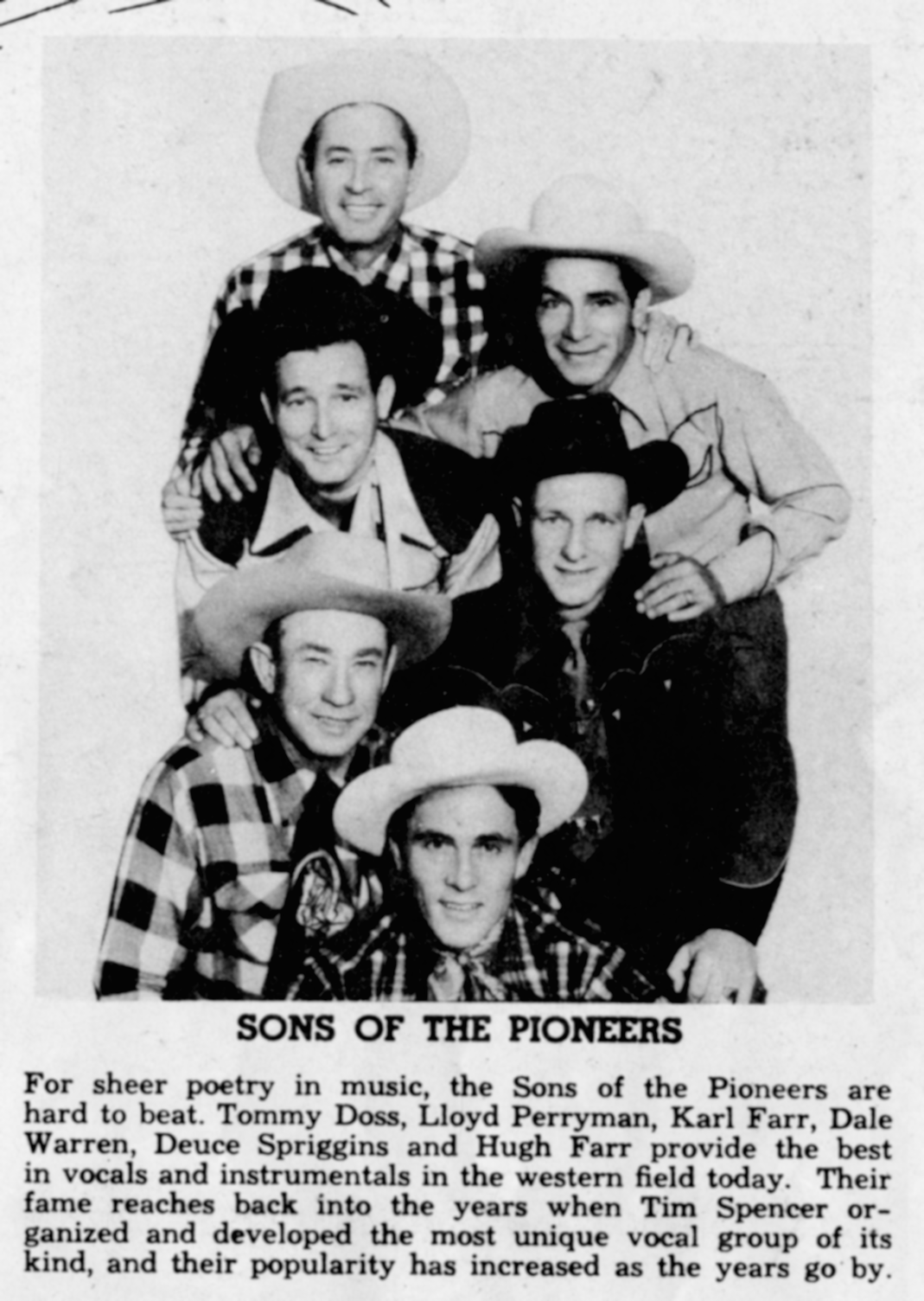 The Sons Of The PioneersSons of the Pioneers Sons of the Pioneers American western singing group For the film, see Sons of the Pioneers (film). For the 2000 album by The Workhorse Movement, see Sons of the Pioneers (album). The Sons of the Pioneers are one of the United States' earliest Western singing groups.[1] Known for their vocal performances, their musicianship, and their songwriting,[2] they produced innovative recordings that have inspired many Western music performers and remained popular through the years.[3] Since 1933, through many changes in membership, the Sons of the Pioneers have remained one of the longest-surviving country music vocal groups.[4] Quick facts Genres, Years active ... Sons of the Pioneers Genres Country, Western Years active 1933–present Labels Decca, RCA Victor, Vocalion… (Source: Wikipedia)