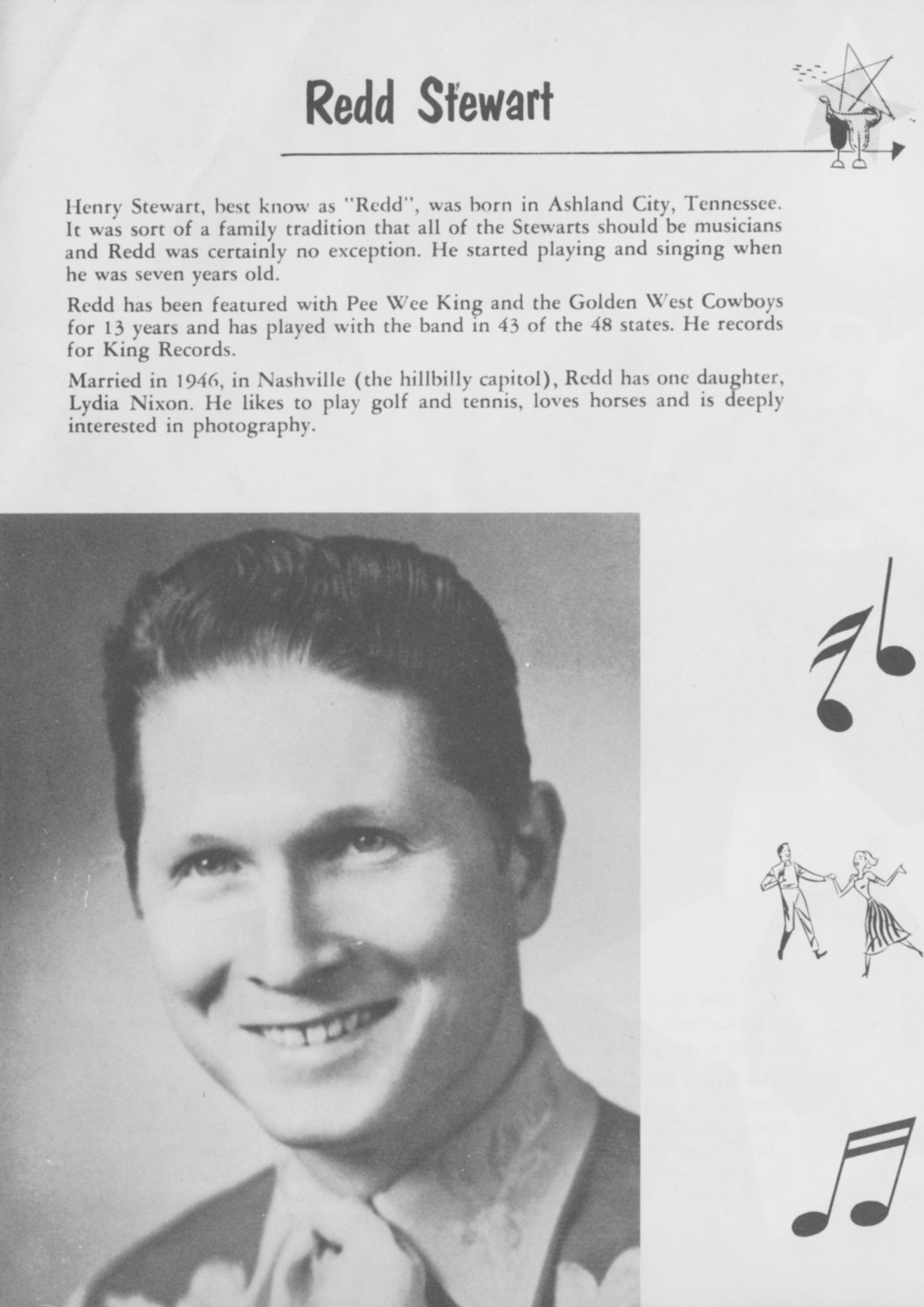 Redd StewartRedd Stewart Redd Stewart American singer-songwriter Henry Ellis Stewart (May 27, 1923 – August 4, 2003), better known as Redd Stewart, was an American country music songwriter and recording artist who co-wrote "Tennessee Waltz" with Pee Wee King in 1948.[1] This article needs additional citations for verification. (March 2017) Quick facts Background information, Born ... Redd Stewart Background information Born Henry Ellis Stewart (1923-05-27)May 27, 1923 Ashland City, Tennessee, United States Died August 4, 2003(2003-08-04) (aged 80) Louisville, Kentucky, United States Genres Country Occupation Singer-songwriter Close Biography He was born in Ashland City, Tennessee, United States.[2] While still a child, his family moved to Louisville, Kentucky.[2] At an early age, he learned to play several musical instruments such as the… (Source: Wikipedia)