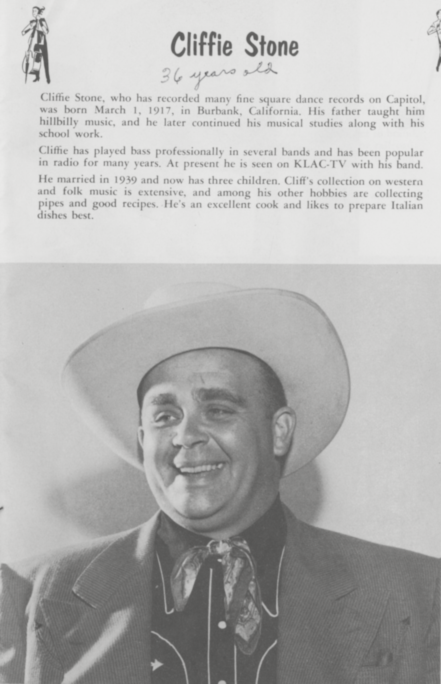![]() Publicity photo of Cliffie Stone, circa 1952. Image by Unknown authorUnknown author, via Wikimedia Commons. Licensed Public domain |