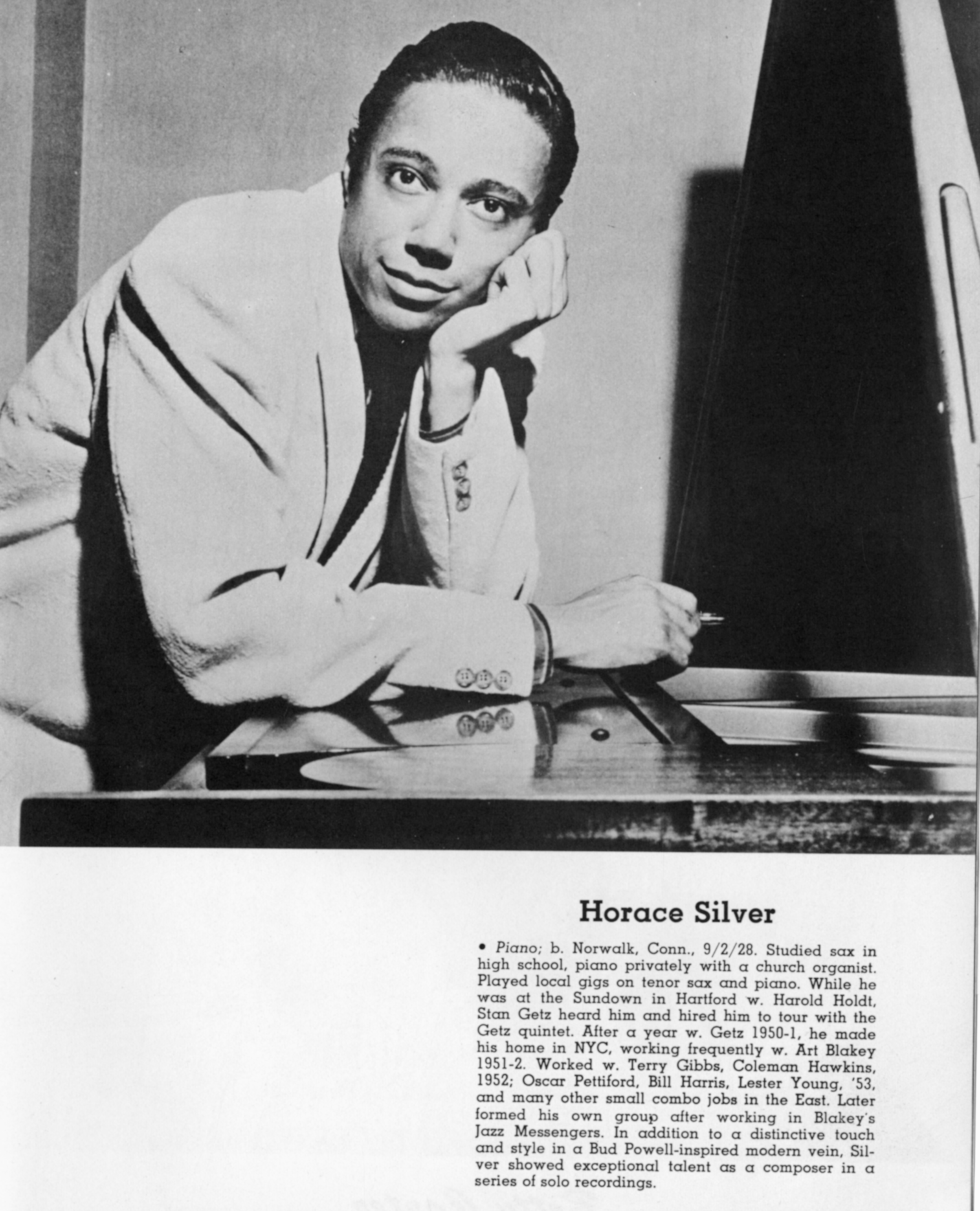 Horace SilverHorace Silver Horace Silver American jazz pianist and composer (1928–2014) Horace Ward Martin Tavares Silver[note 1] (September 2, 1928 – June 18, 2014) was an American jazz pianist, composer, and arranger, particularly in the hard bop style that he helped pioneer in the 1950s. Quick facts Background information, Born ... Horace Silver Portrait by Dmitri Savitski, 1989 Background information Born (1928-09-02)September 2, 1928 Norwalk, Connecticut, U.S. Died June 18, 2014(2014-06-18) (aged 85) New Rochelle, New York, U.S. Genres Jazz, hard bop, mainstream jazz, soul jazz, jazz fusion Occupations Musician, composer, arranger Instrument Piano Years active 1946–2004 Labels Blue Note, Silveto, Emerald, Columbia, Impulse!, Verve Website horacesilver.com Close After playing tenor saxophone and piano at school in Connecticut, Silver got his… (Source: Wikipedia)
