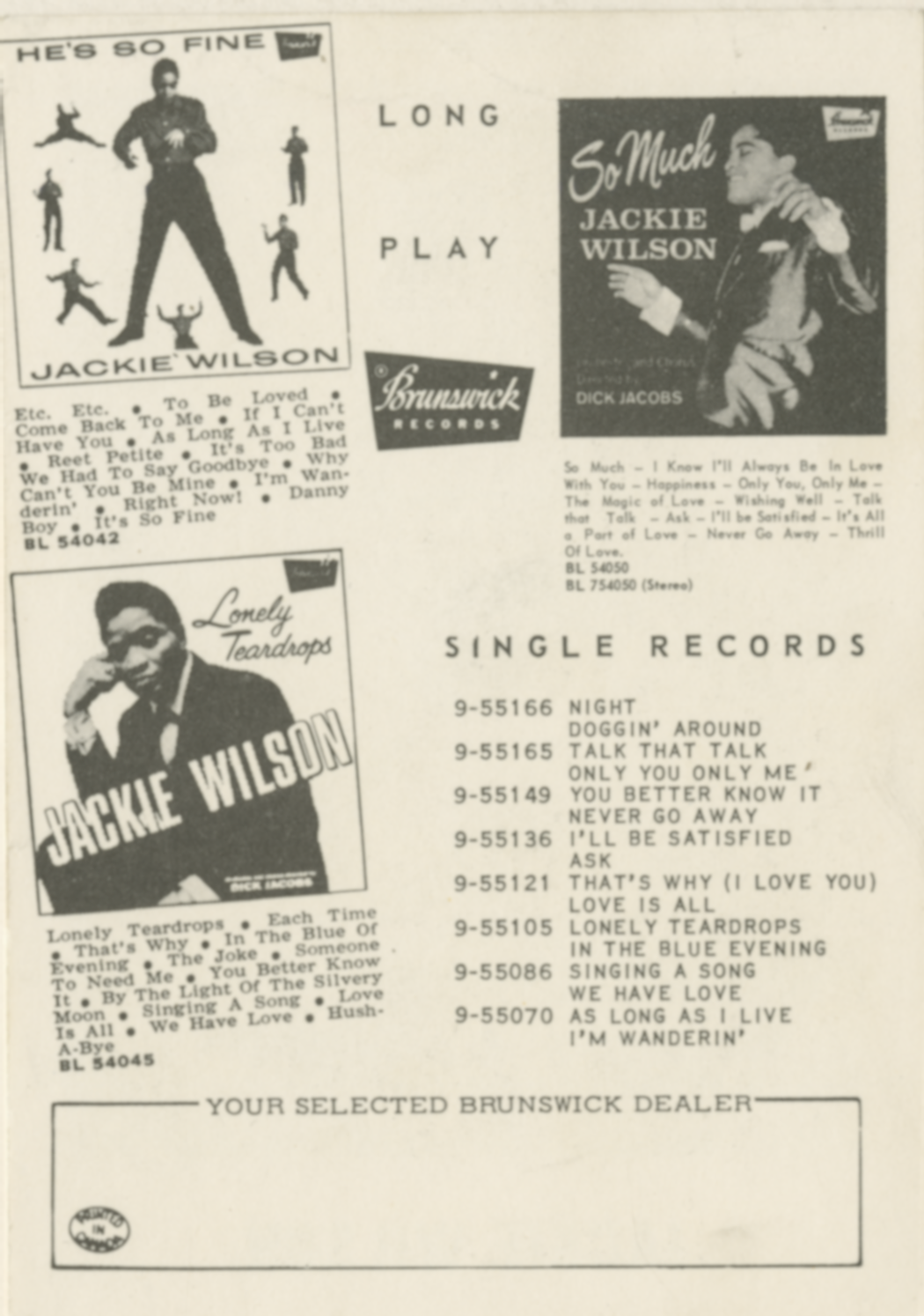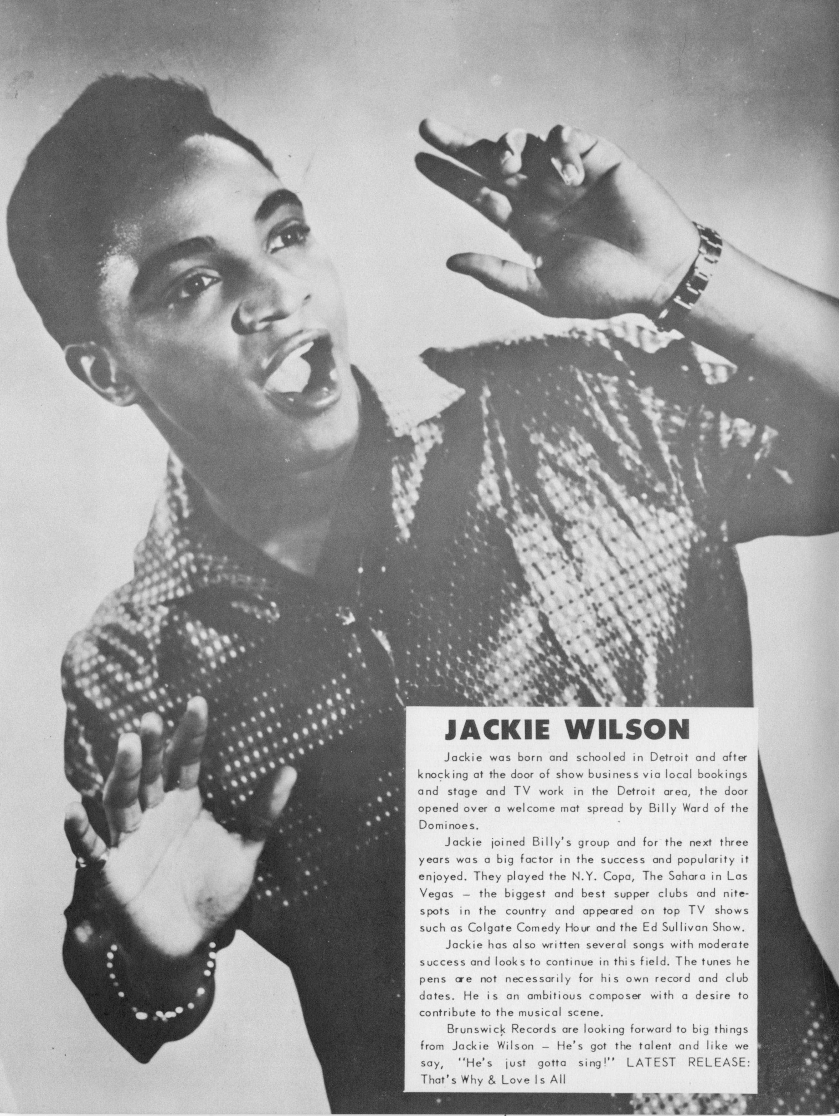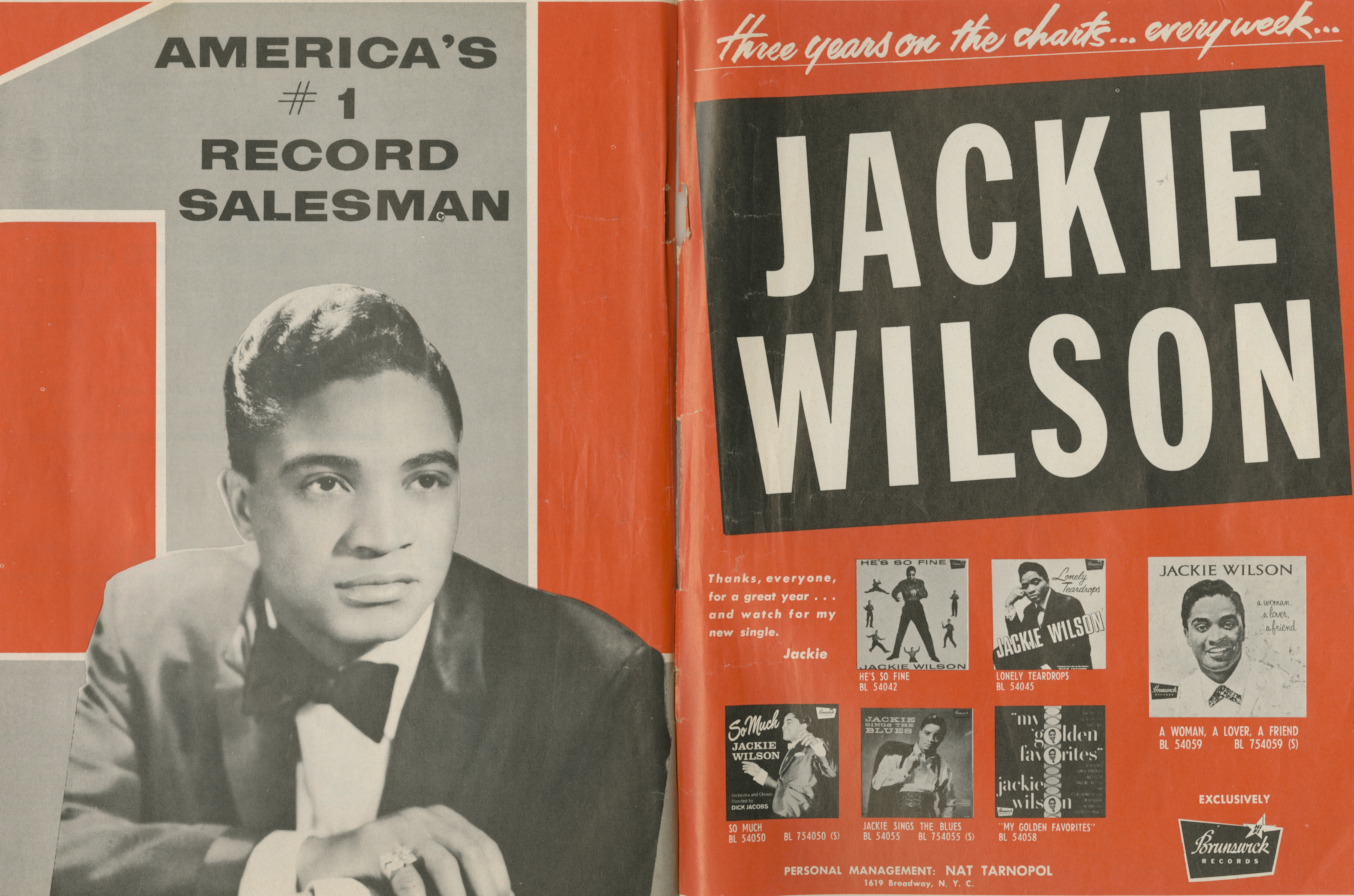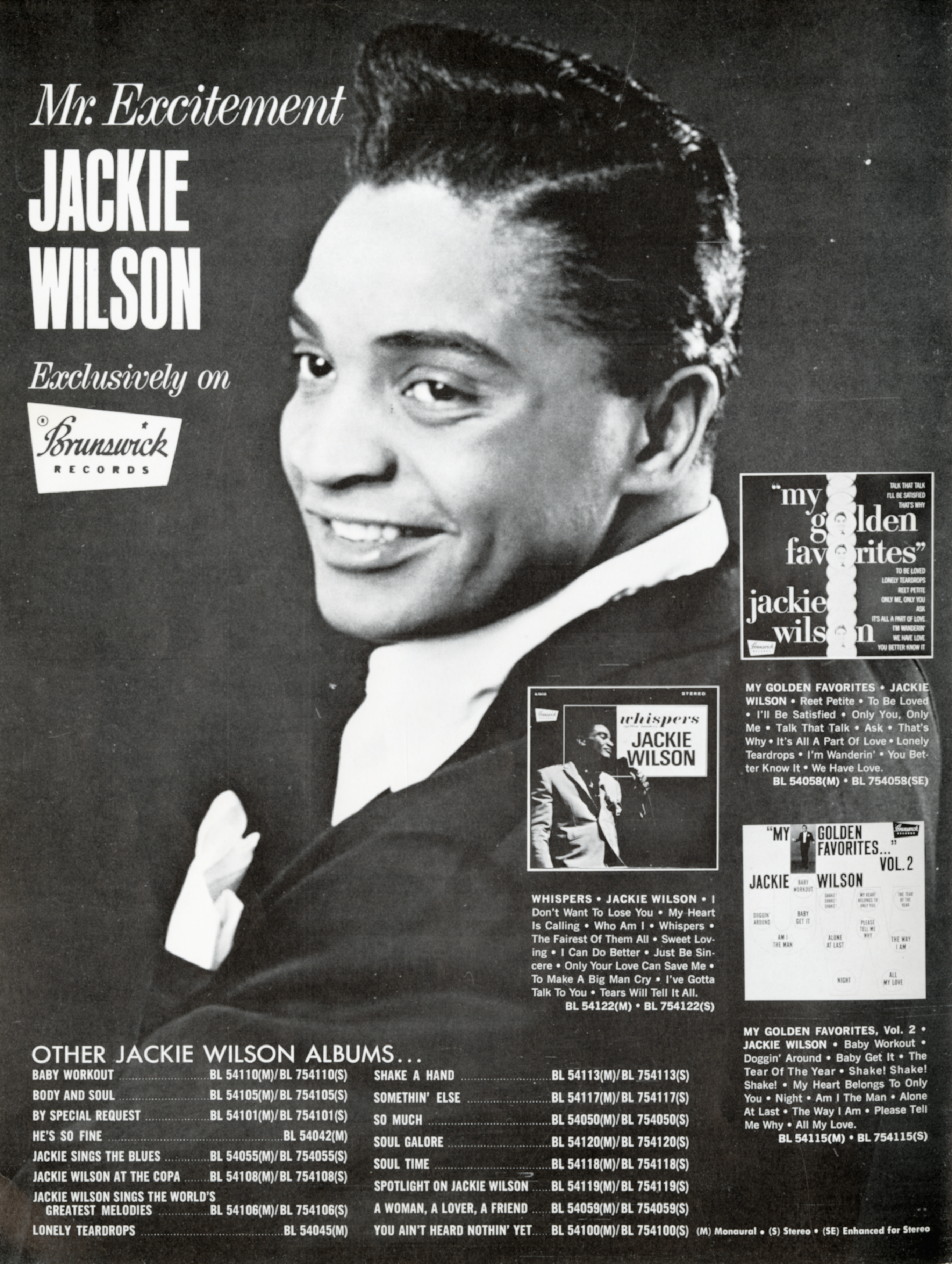 ![]() Photo of Jackie Wilson from a Brunswick Records ad. Image by Brunswick Records, via Wikimedia Commons. Licensed Public domain |