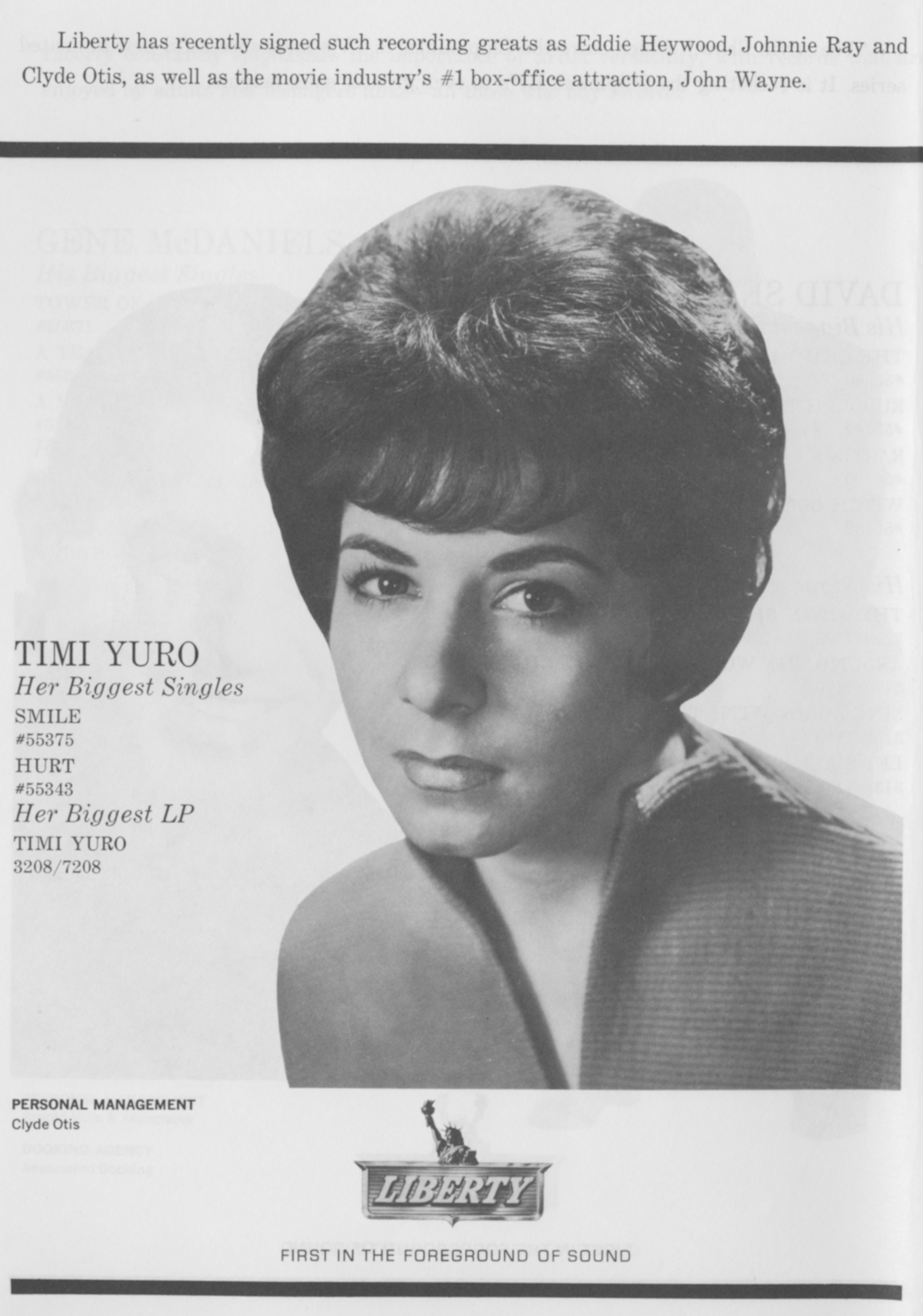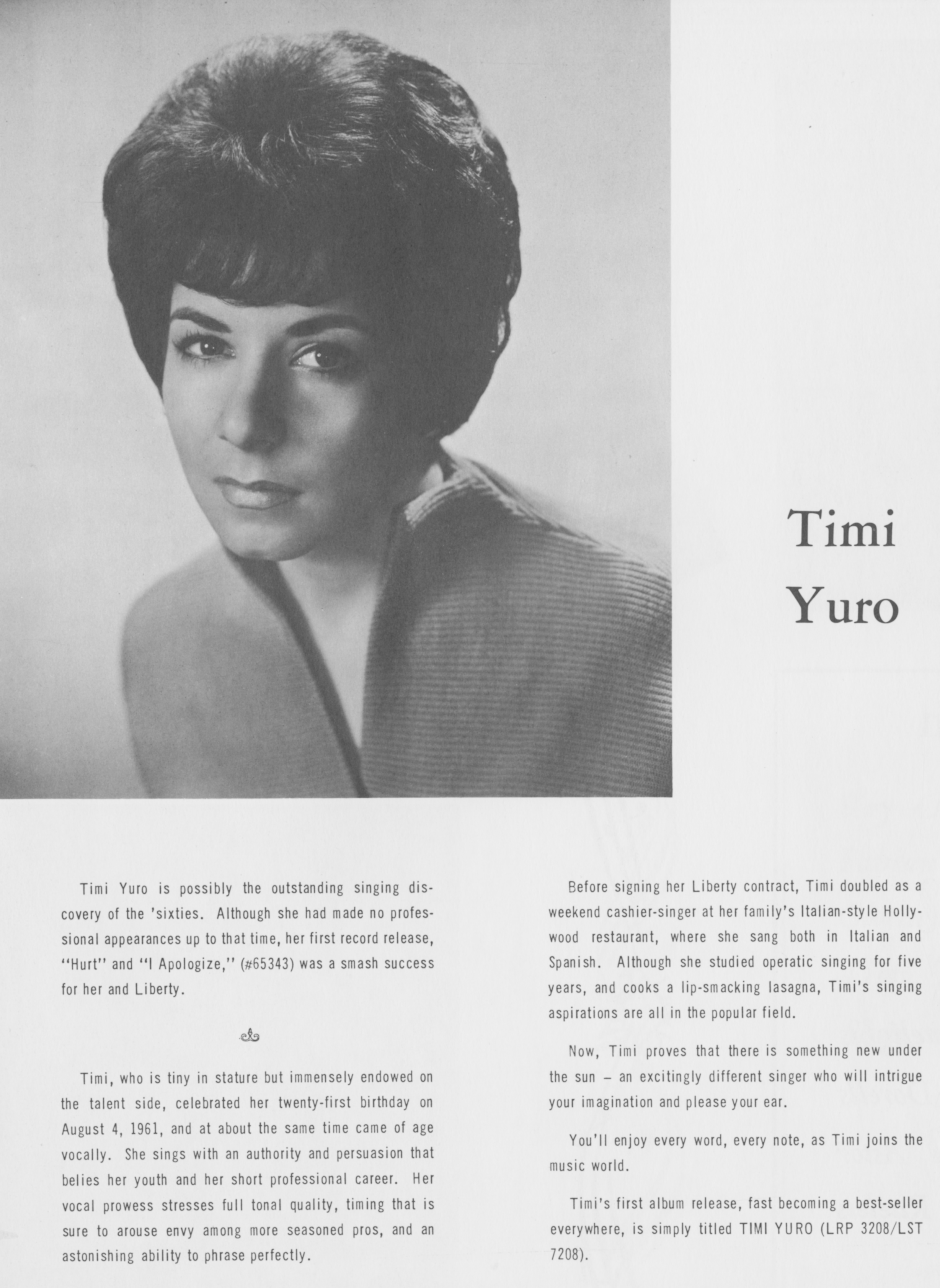 Timi YuroTimi Yuro Timi Yuro American singer (1940–2004) Rosemary Victoria Yuro (August 4, 1941 – March 30, 2004), known professionally as Timi Yuro, was an American singer. Sometimes called "the little girl with the big voice",[1] she is considered to be one of the first blue-eyed soul stylists of the rock era. Yuro possessed a contralto vocal range.[2] According to one critic, "her deep, strident, almost masculine voice, staggered delivery and the occasional sob created a compelling musical presence".[3] This article needs additional citations for verification. (May 2024) Quick facts Background information, Born ... Timi Yuro Timi Yuro in 1963 Background information Born Rosemary Victoria Yuro (1941-08-04)August 4, 1941 Chicago, Illinois, U.S. Origin Los Angeles, California, U.S. Died March 30, 2004(2004-03-30)… (Source: Wikipedia)