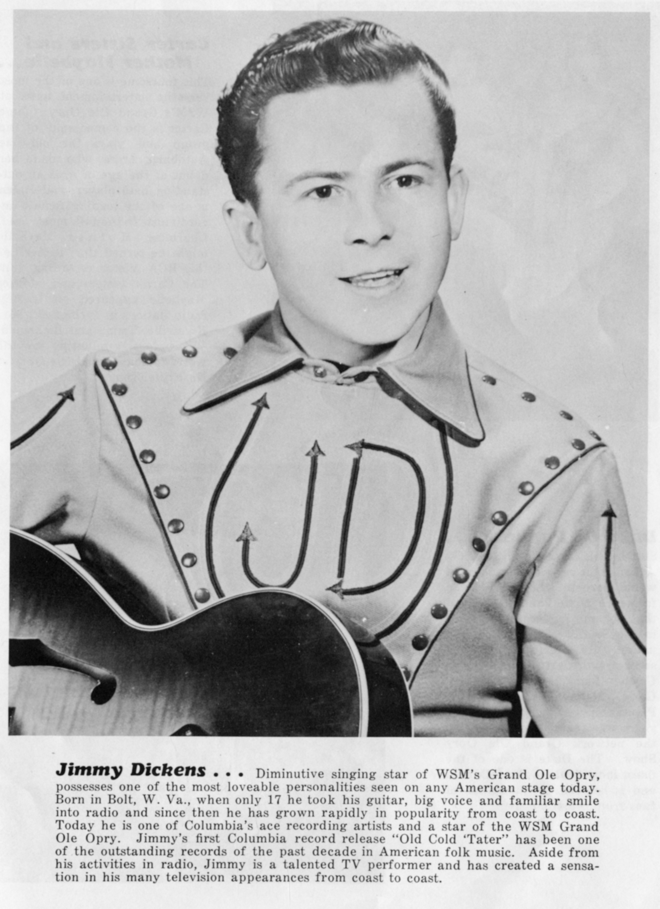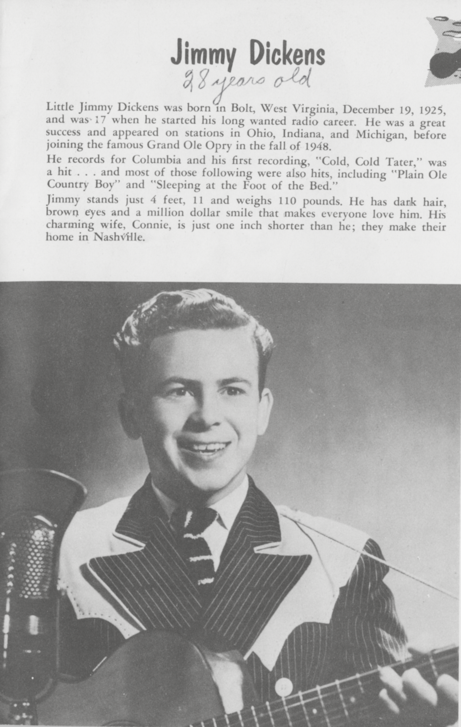 Dickens "Little" JimmyLittle Jimmy Dickens Little Jimmy Dickens American country music singer-songwriter (1920–2015) James Cecil Dickens (December 19, 1920 – January 2, 2015), better known by his stage name Little Jimmy Dickens, was an American country music singer and songwriter famous for his humorous novelty songs, his small size (4'10" [150 cm]), and his rhinestone-studded outfits (which he is given credit for introducing into live country music performances).[1] He started as a member of the Grand Ole Opry in 1948 and was inducted into the Country Music Hall of Fame in 1983.[2] Before his death, he was the oldest living member of the Grand Ole Opry. Quick facts Background information, Also known as ... Little Jimmy Dickens Dickens in 1971 Background information… (Source: Wikipedia)