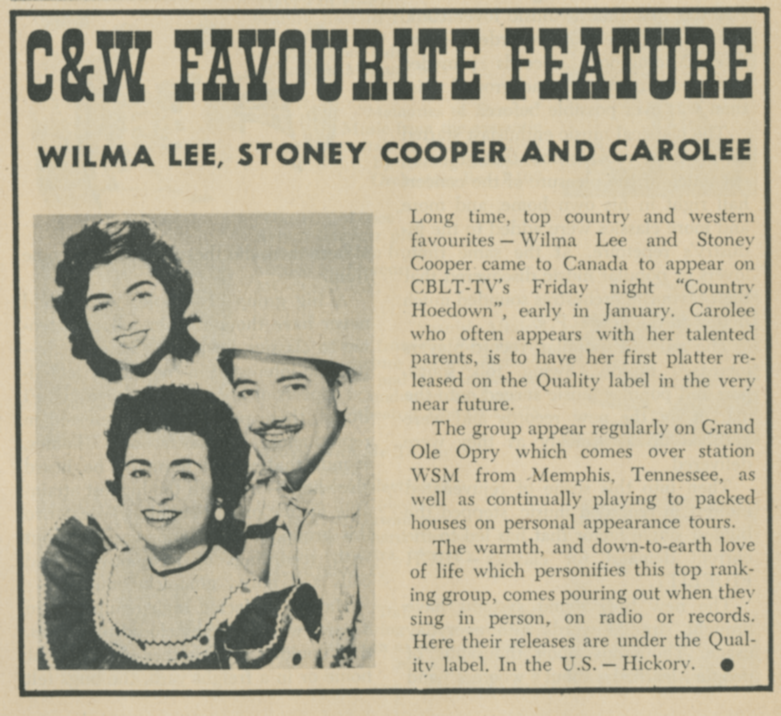 ![]() Newspaper photograph of Wilma Lee Cooper and Stoney Cooper Image by Not named, via Wikimedia Commons. Licensed Public domain |