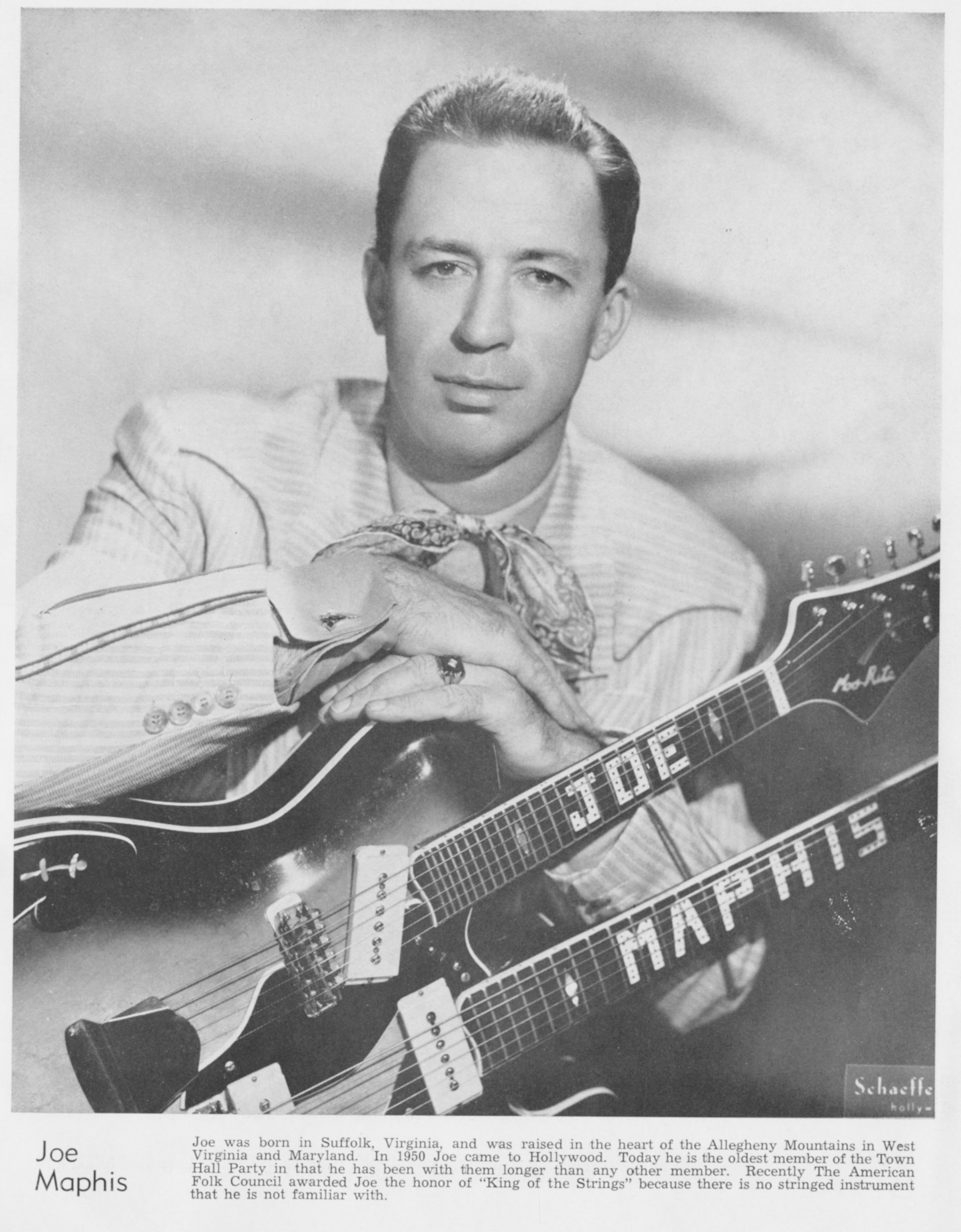 Joe MaphisJoe Maphis Joe Maphis American country music guitarist (1921–1986) Otis Wilson "Joe" Maphis[1] (/ˈmeɪfɪs/ MAY-fis; May 12, 1921 – June 27, 1986),[2] was an American country music guitarist. He married singer Rose Lee Maphis in 1953 and they performed together. This article needs additional citations for verification. (March 2016) Quick facts Born, Died ... Joe Maphis Born Otis Wilson Maphis (1921-05-12)May 12, 1921 Suffolk, Virginia, U.S. Died June 27, 1986(1986-06-27) (aged 65) Nashville, Tennessee, U.S. Genres Country Instrument Guitar Label Columbia Close One of the flashiest country guitarists of the 1950s and 1960s, Joe Maphis was known as "The King of the Strings".[3] Biography Early life Maphis was born in Suffolk, Virginia, United States.[2] His family moved to Cumberland, Maryland,… (Source: Wikipedia)