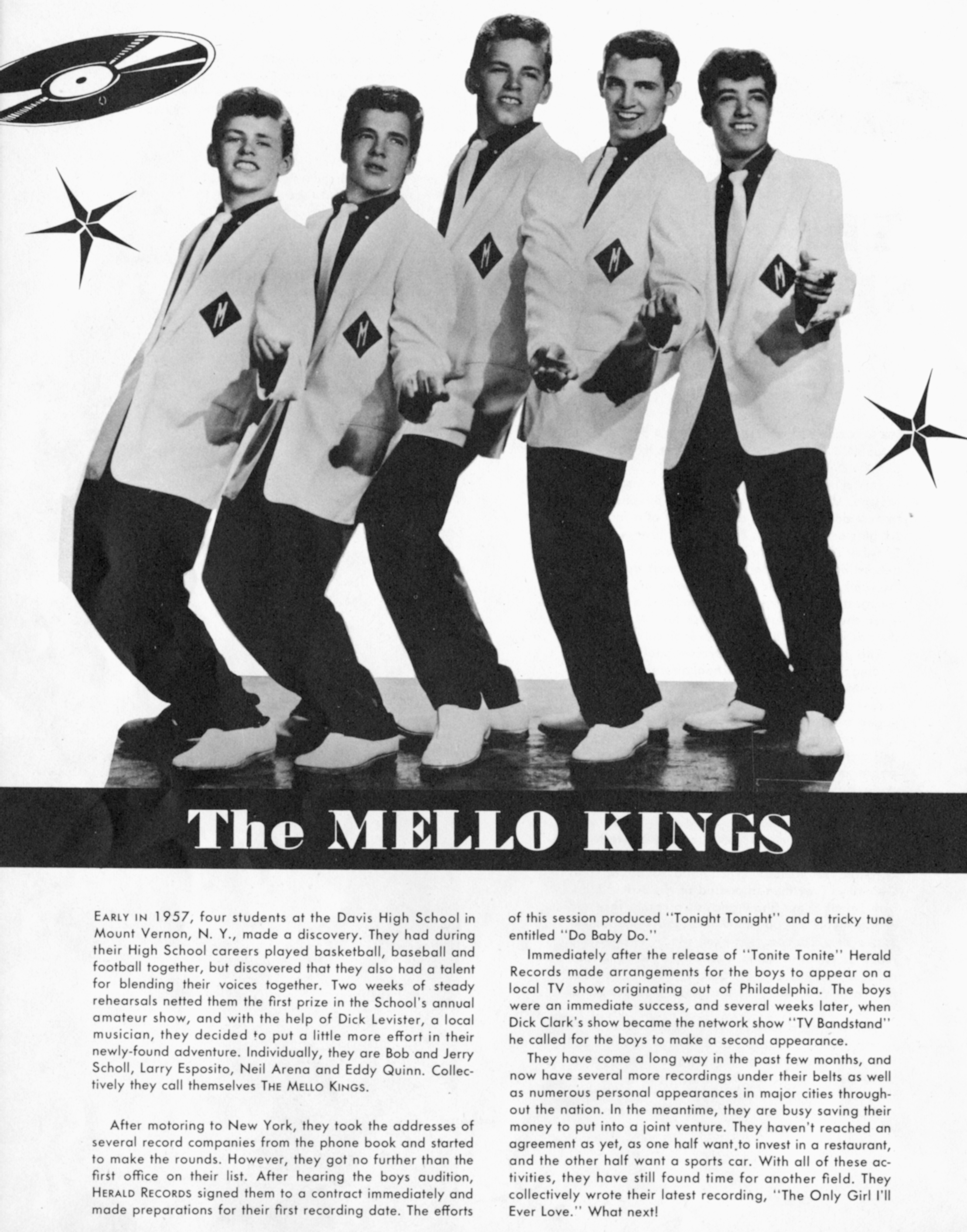 The Mello-KingsThe Mello-Kings The Mello-Kings Add article description The Mello-Kings were an American doo-wop group, who became popular in the late 1950s with their song, "Tonite, Tonite" (1957).[1] This article needs additional citations for verification. (December 2021) The group consisted of brothers Jerry and Bob Scholl, Eddie Quinn, Neil Arena and Larry Esposito. The quintet was formed in 1956 at a high school in Mount Vernon, New York, United States, under the guidance of manager Dick Levister. Originally named the Mellotones, the group was signed to the Herald label.[2] "Tonite, Tonite" was written by Billy Myles, a staff composer for the label.[3] The group was forced to change its name after the single's release, as another group had already claimed Mellotones.[2]… (Source: Wikipedia)