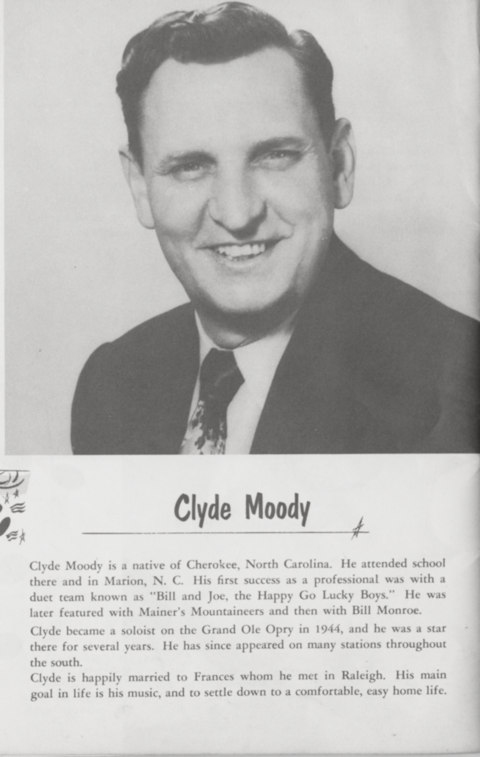 Clyde MoodyClyde Moody Clyde Moody American singer-songwriter Clyde Leonard Moody (September 19, 1915 – April 7, 1989),[1] also known as the "Hillbilly Waltz King" and sometimes as "The Genial Gentleman of Country Music" was one of the great founders of American Bluegrass music. Early life and career Born in Cherokee, North Carolina, United States,[1] Moody got his start in the late 1930s in the string band J. E. Mainer's Mountaineers.[1] In September 1940 he joined Bill Monroe's Blue Grass Boys on the Grand Ole Opry.[1] Moody's guitar style was unique, with him finger picking with his thumb and index finger.[2] Moody also had a mellow voice that was a good contrast to Bill Monroe's voice. He appeared on Monroe's first solo… (Source: Wikipedia)