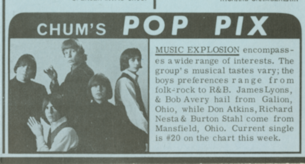 The Music ExplosionThe Music Explosion The Music Explosion American garage rock band The Music Explosion was an American garage rock band from Mansfield, Ohio, discovered and signed by record producers Jerry Kasenetz and Jeffry Katz. Quick facts Background information, Origin ... The Music Explosion Background information Origin Mansfield, Ohio, United States Genres Garage rock, psychedelic rock Years active 1966–1969, 1980–present Labels Laurie Records, Attack Records Past members Jamie Lyons (deceased) Don Atkins Rick Nesta Bob Avery Burton Stahl (deceased) Dane Donohue Charles Barker (deceased) Close The quintet is best known for their number two hit, "Little Bit O' Soul". The single was given gold record status by the RIAA.[1] Written by British songwriters John Carter and Ken Lewis, who had previously written… (Source: Wikipedia)