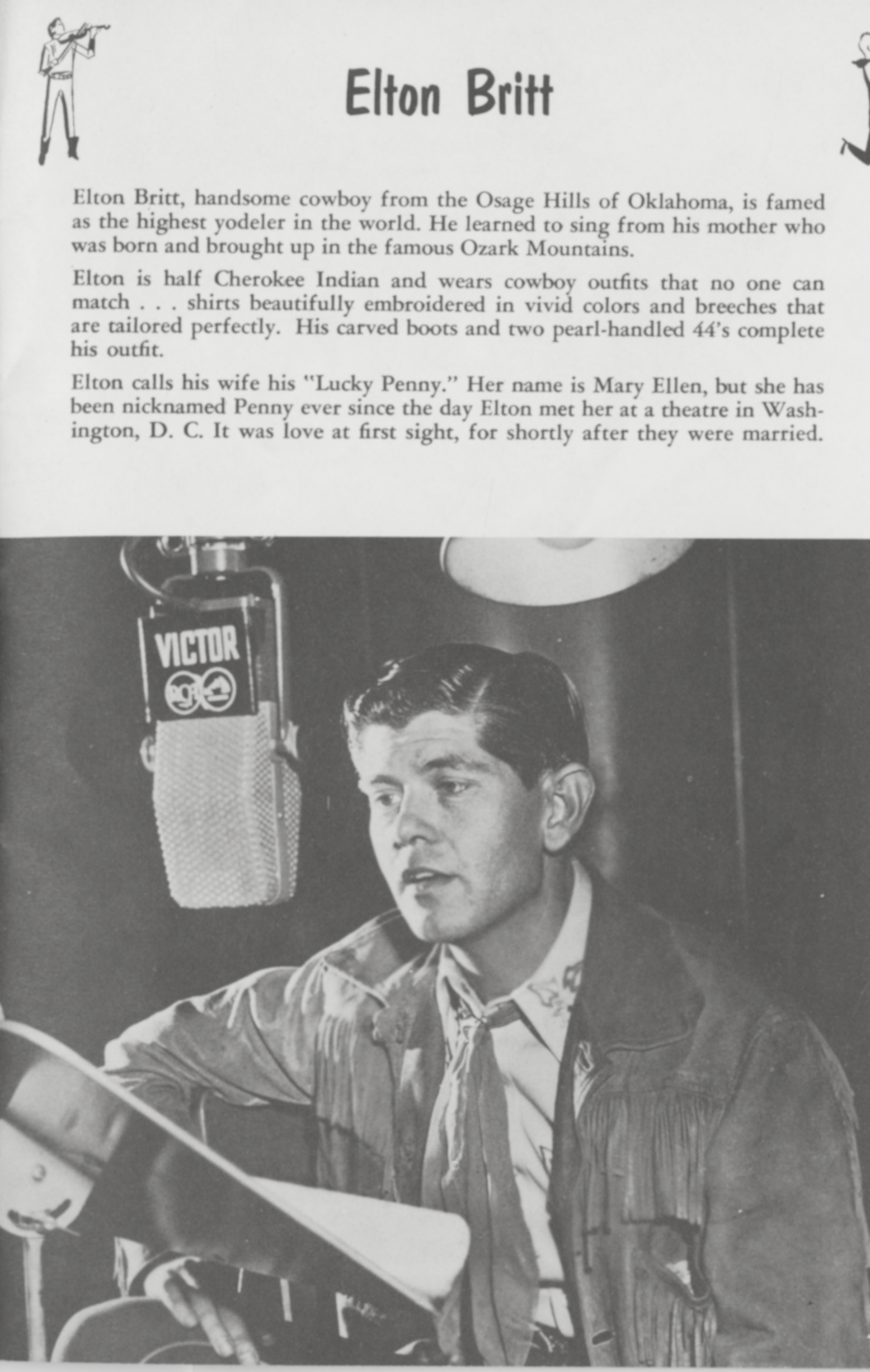 Publicity photo of singer, songwriter and musician Elton Britt. Image by Jolly Joyce Agency-management/photographer-James J. Kriegsmann, New York., via Wikimedia Commons. Licensed Public domain |