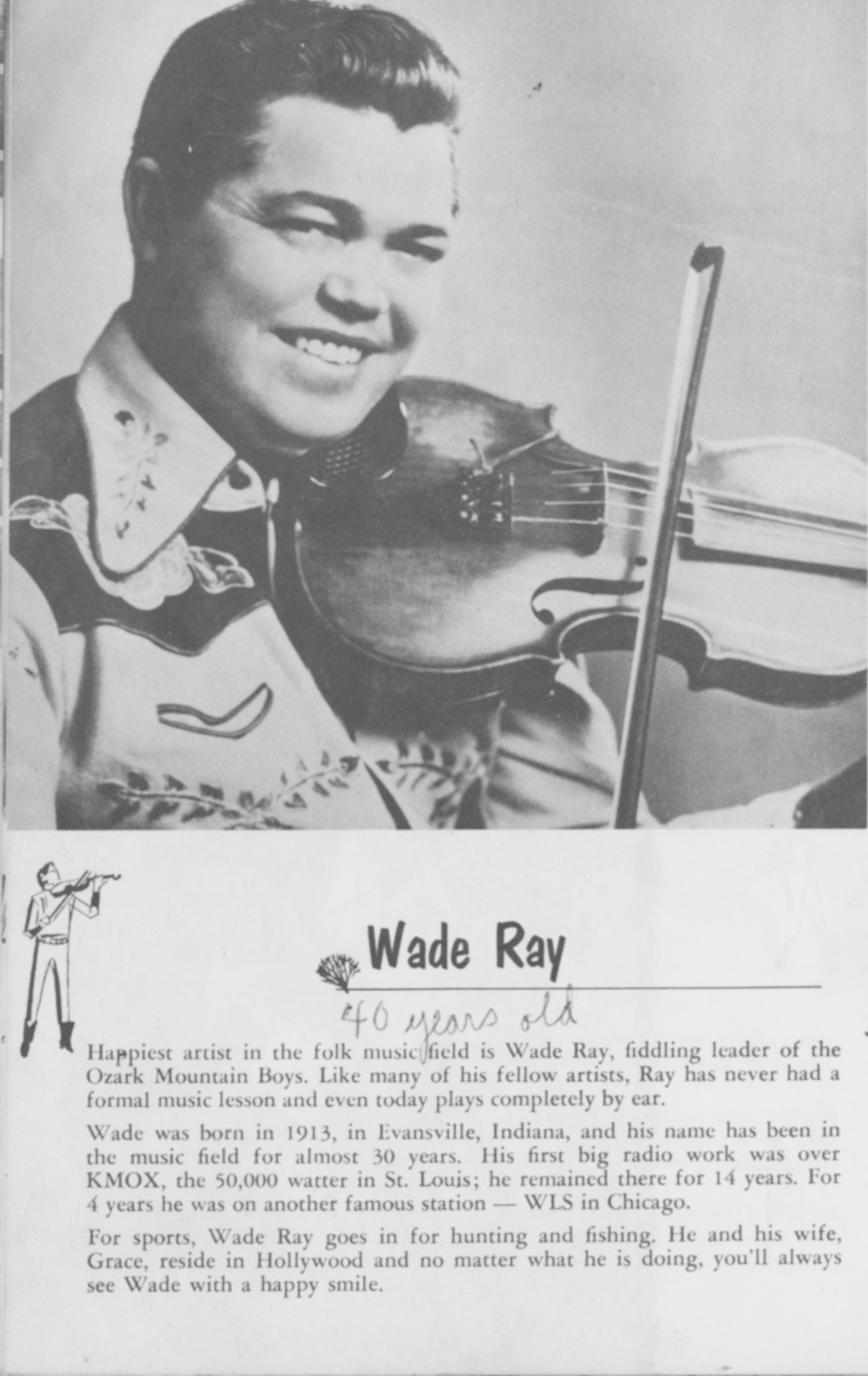 Wade RayWade Ray Wade Ray Musical artist Wade Ray (April 13, 1913 in Evansville, Indiana – November 11, 1998 in Sparta, IL) was an American Western Swing fiddler and vocalist.[1] His bands, the Wade Ray Five, Wade Ray And His Ozark Mountain Boys, etc., included musicians such as Kenneth Carllile and Curly Chalker. He retired to Sparta, Illinois in 1979 where he died in 1998.[1] Quick facts Background information, Born ... Wade Ray Wade Ray on the Cover of Idaho Red album Background information Born Lyman Wade Ray (1913-04-13)April 13, 1913 Griffin, Indiana U.S. Died November 11, 1998(1998-11-11) (aged 85) Sparta, IL, U.S. Genres Western Swing Instruments Vocals, fiddle Close Discography Singles "Are You Fer It?" B "Walk Softly", Wade Ray… (Source: Wikipedia)