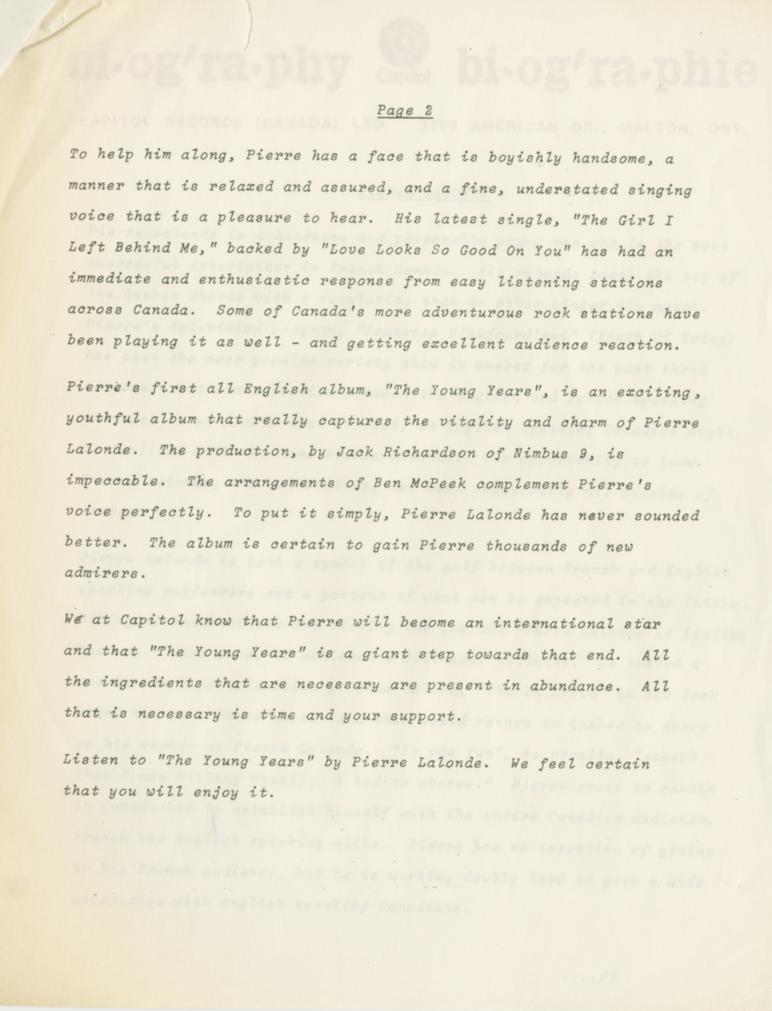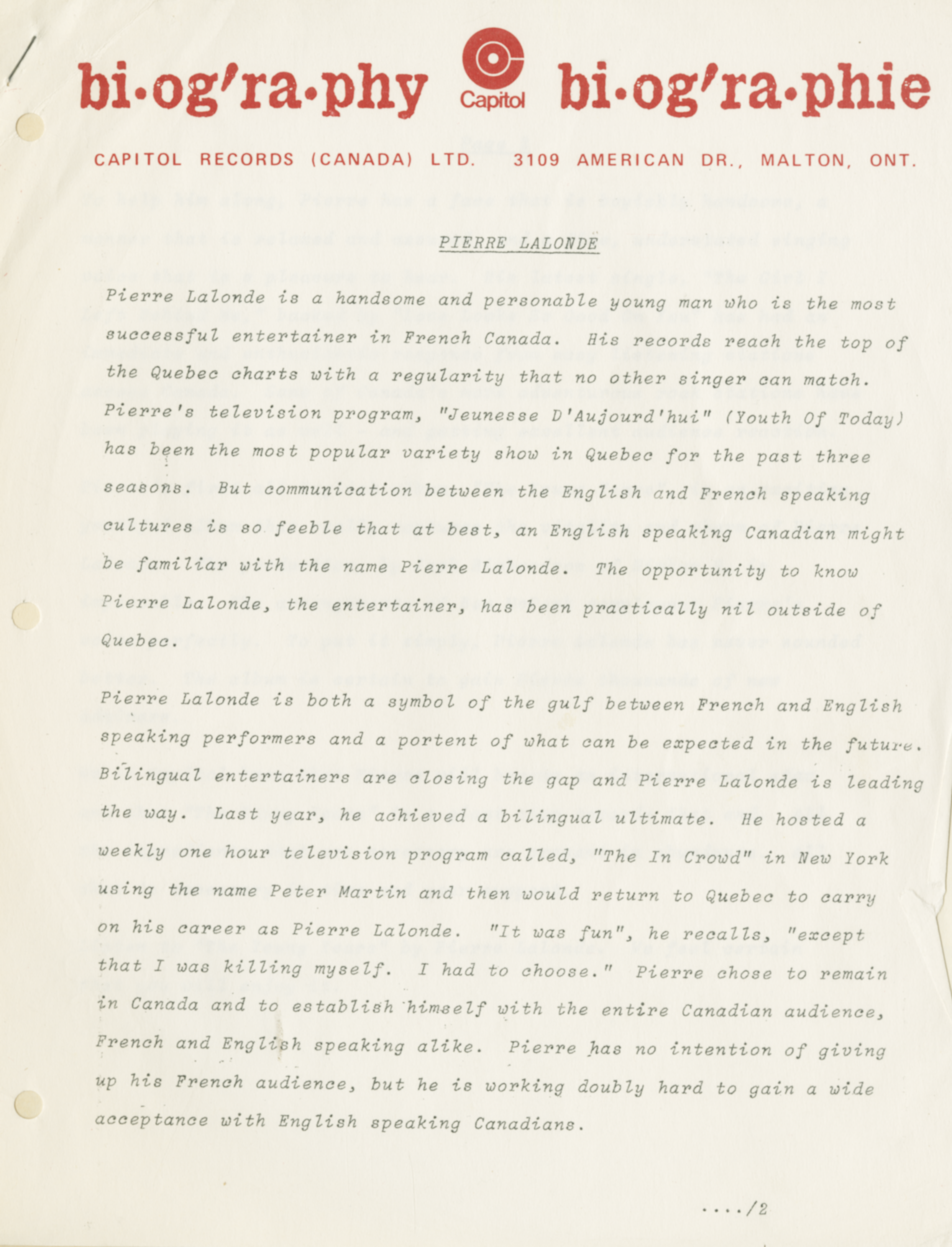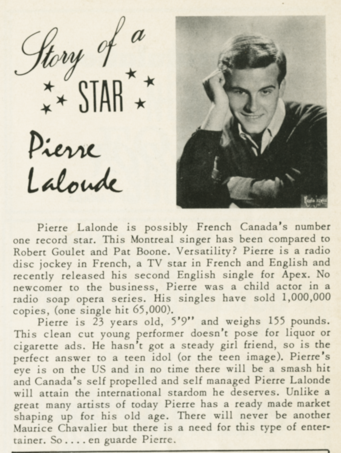 Pierre LalondePierre Lalonde Pierre Lalonde Canadian entertainer (1941–2016) Pierre Lalonde (January 20, 1941 – June 21, 2016) was a Canadian singer and television host, who was sometimes also billed as Peter Martin in the United States. This article needs additional citations for verification. (November 2016) Quick facts Born, Died ... Pierre Lalonde Born (1941-01-20)January 20, 1941 Montreal, Quebec, Canada Died June 21, 2016(2016-06-21) (aged 75) Hudson, Quebec Other names Peter Martin Occupations Singer, television host Known for Jeunesse d'aujourd'hui The Peter Martin Show Spouse Clare Lalonde (née Lewis)[1] Children 4 Close The son of Jean Lalonde, a popular singer in the 1940s, Lalonde attended high school in the United States but returned to Canada in 1960, where he worked at radio… (Source: Wikipedia)