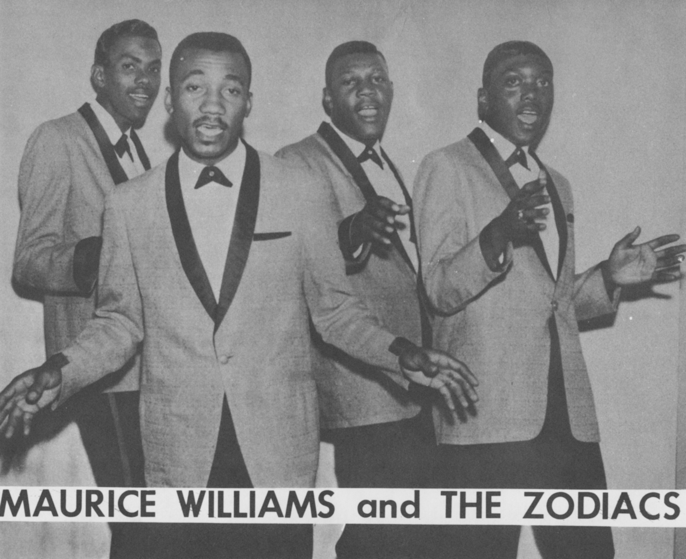 ![]() Publicity photo of Maurice Williams(middle of first row) and the Zodiacs in 1960. Image by Unknown, via Wikimedia Commons. Licensed Public domain |