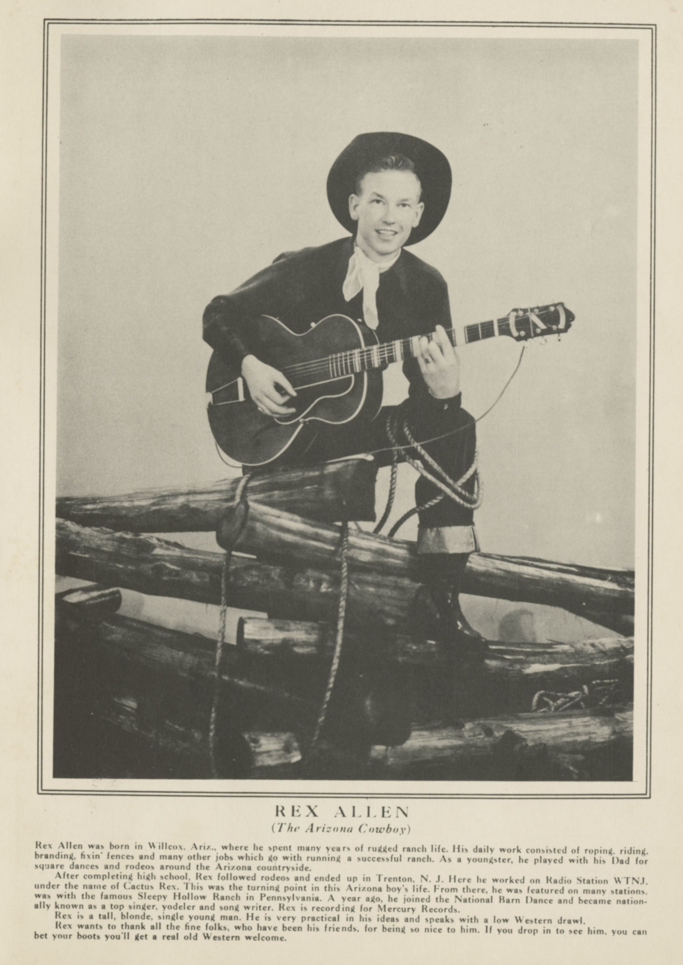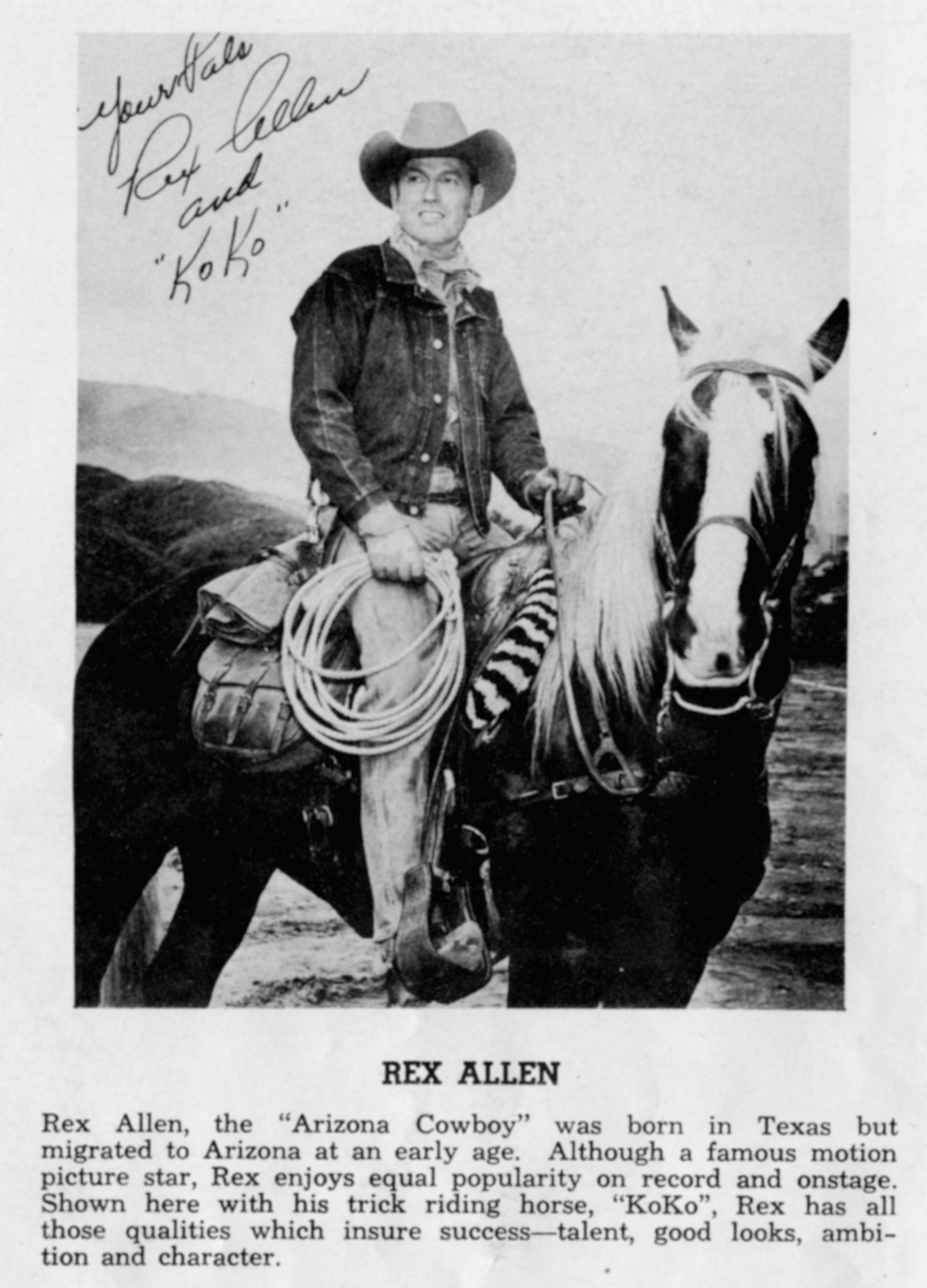 Rex AllenRex Allen Rex Allen American film actor, singer and songwriter (1920–1999) For his son, the American country music singer, see Rex Allen Jr. For the American healthcare architect, see Rex Whitaker Allen. Rex Elvie Allen Sr. (December 31, 1920 – December 17, 1999),[1] known as "The Arizona Cowboy," was an American film and television actor, singer and songwriter; he was also the narrator of many Disney nature and Western productions. For his contributions to the film industry, Allen received a motion pictures star on the Hollywood Walk of Fame in 1975, located at 6821 Hollywood Boulevard.[2][3] Quick facts Born, Died ... Rex Allen Allen and Koko, 1952 Born Rex Elvie Allen (1920-12-31)December 31, 1920 Willcox, Arizona, U.S. Died December 17,… (Source: Wikipedia)