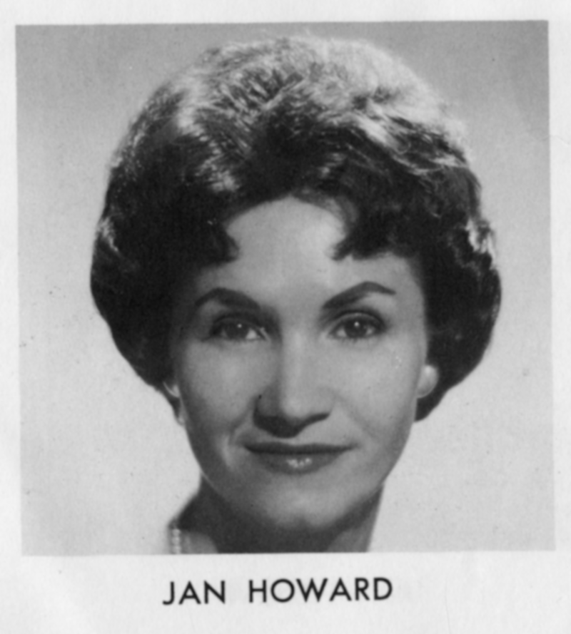 Jan HowardJan Howard Jan Howard American writer and country music singer (1929–2020) Jan Howard (born Lula Grace Johnson; March 13, 1929 – March 28, 2020)[1] was an American author, country music singer and songwriter. As a singer, she placed 30 singles on the Billboard country songs chart, was a Grand Ole Opry member and was nominated for several major awards. As a writer, she wrote poems and published an autobiography. She was married to country songwriter Harlan Howard. Quick facts Born, Died ... Jan Howard Howard at the Grand Ole Opry in 2001 Born Lula Grace Johnson (1929-03-13)March 13, 1929 West Plains, Missouri, U.S. Died March 28, 2020(2020-03-28) (aged 91) Gallatin, Tennessee, U.S. Resting place Spring Hill Cemetery (Nashville, Tennessee) Occupations… (Source: Wikipedia)