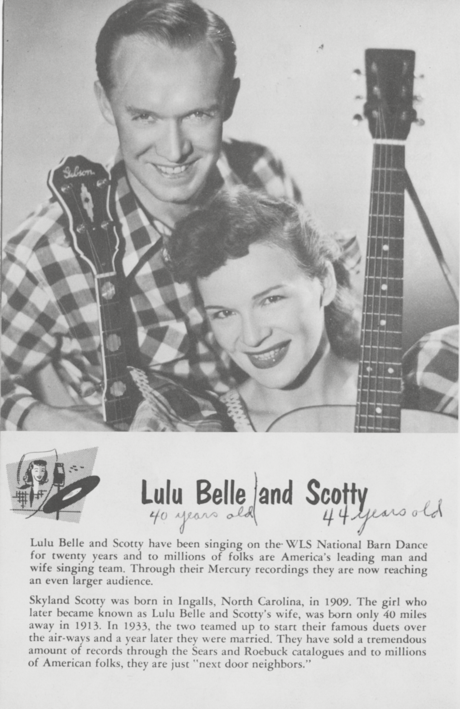 Lulu Belle & ScottyLulu Belle and Scotty Lulu Belle and Scotty American country music duo Myrtle Eleanor Cooper (December 24, 1913 – February 8, 1999) and Scott Greene Wiseman (November 8, 1909 – January 31, 1981),[1] known professionally as Lulu Belle and Scotty, were one of the major country music acts of the 1930s and 1940s, dubbed The Sweethearts of Country Music.[2] Lulu Belle and Scotty in 1949 Career Myrtle Eleanor Cooper (Lulu Belle) was born in Boone, North Carolina, United States;[2] Wiseman was from Spruce Pine, North Carolina.[2] Lulu Belle and Scotty enjoyed enormous national popularity thanks to their regular appearances on National Barn Dance on WLS-AM in Chicago,[2] a rival to WSM-AM's Grand Ole Opry. Barn Dance enjoyed a large radio… (Source: Wikipedia)