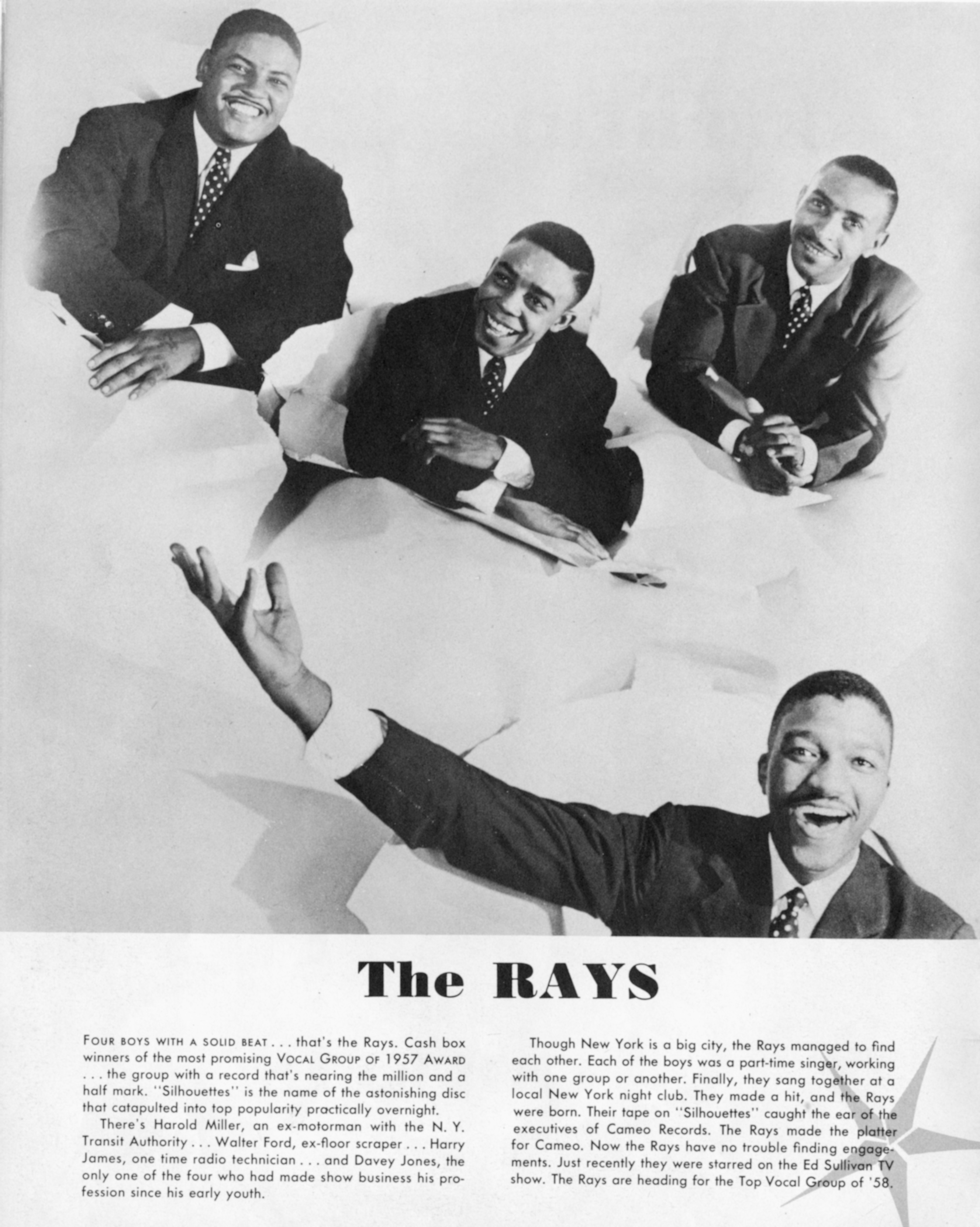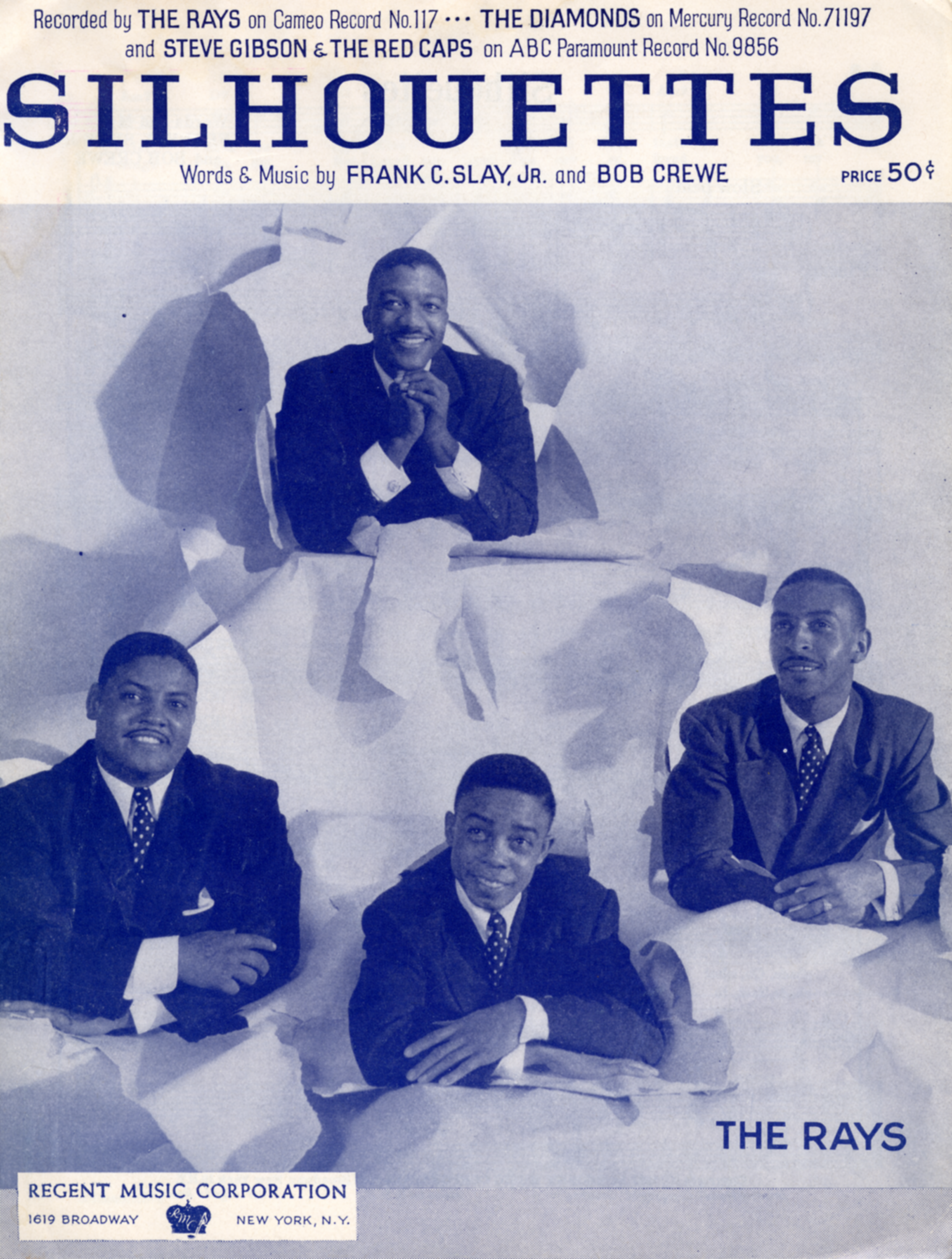 The RaysThe Rays The Rays American musical group For the professional baseball team, see Tampa Bay Rays. For other uses of "Ray", see Ray (disambiguation). The Rays were an American group formed in New York City in 1955, and active into the early 1960s.[1] They first recorded for Chess Records. Their biggest hit single was "Silhouettes", a moderately-slow doo-wop piece of pop music that reached number 3 on the Billboard Hot 100 in 1957 on Cameo after being initially released on the small XYZ Records.[1] It sold over one million copies, and was awarded a gold disc.[2] The song was written by Bob Crewe and Frank Slay, Jr.[2] Also on XYZ, they had a minor hit with "Mediterranean Moon" a mid-chart… (Source: Wikipedia)