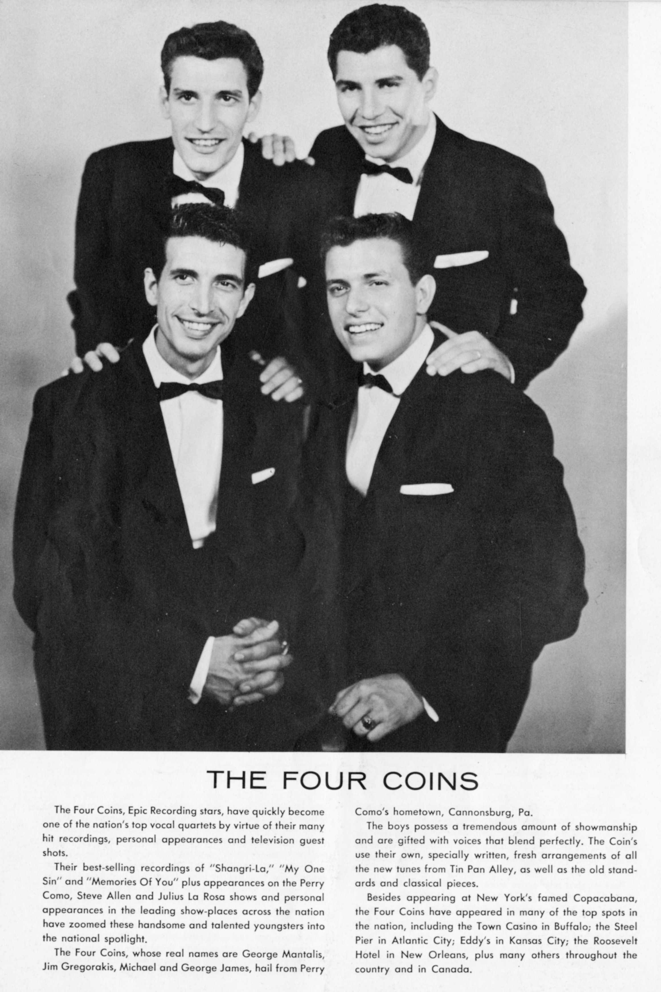 The Four CoinsThe Four Coins The Four Coins American vocal group The Four Coins were a popular American vocal group, consisting of Jimmy Gregorakis, George Mantalis, and brothers George and Jack Mahramas. They were all of Greek heritage and came from Canonsburg, Pennsylvania.[1] A local orchestra leader, Lee Barrett, took them to audition in Cincinnati, Ohio and this led to their cutting some high-charting records and appearing on television. This also led to a recording contract with Columbia Records recording on the Epic label.[2] The group in 1954 The group used the name the Four Keys until they learned another vocal group had it under copyright. They then became The Four Coins.[2] They appeared in the 1957 Warner Brothers rock and roll… (Source: Wikipedia)