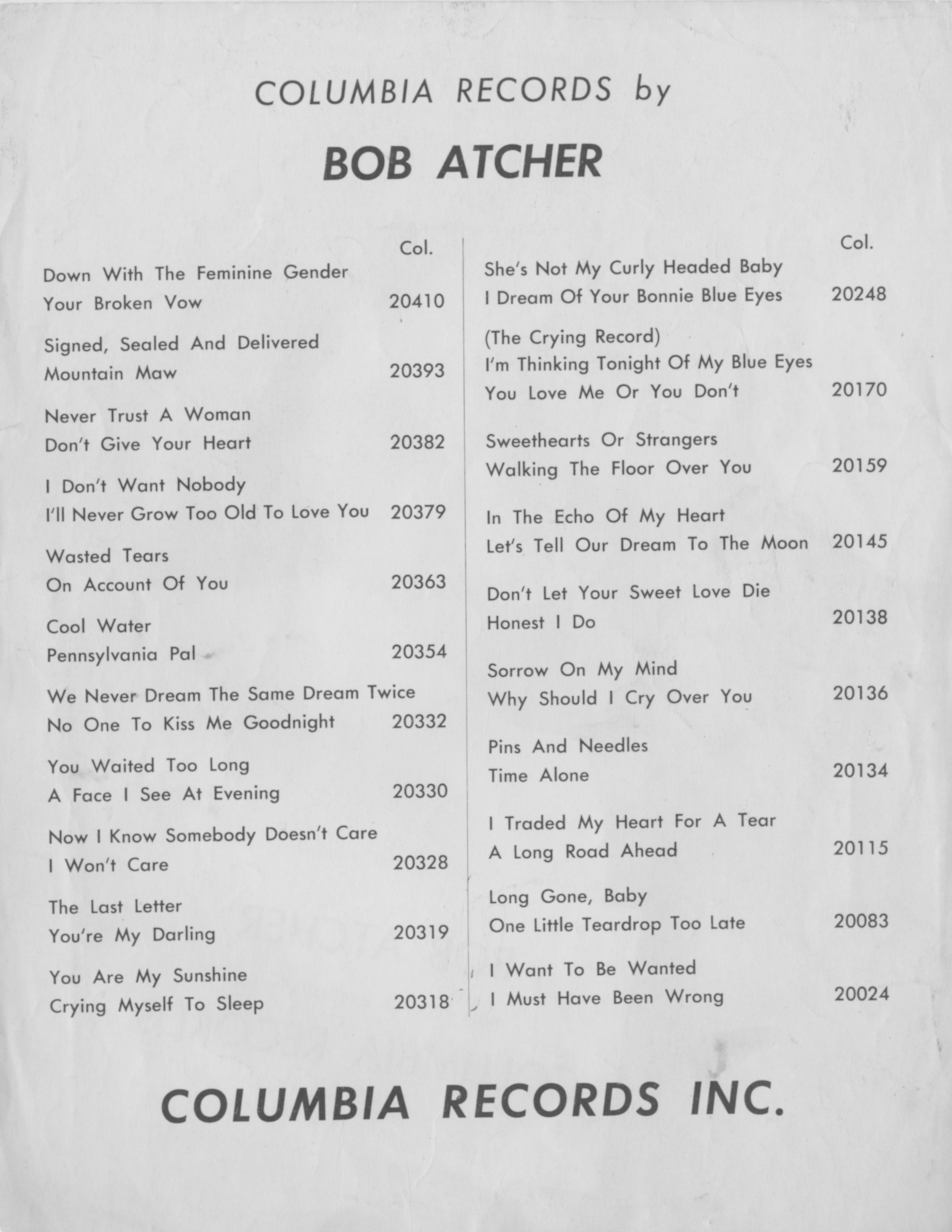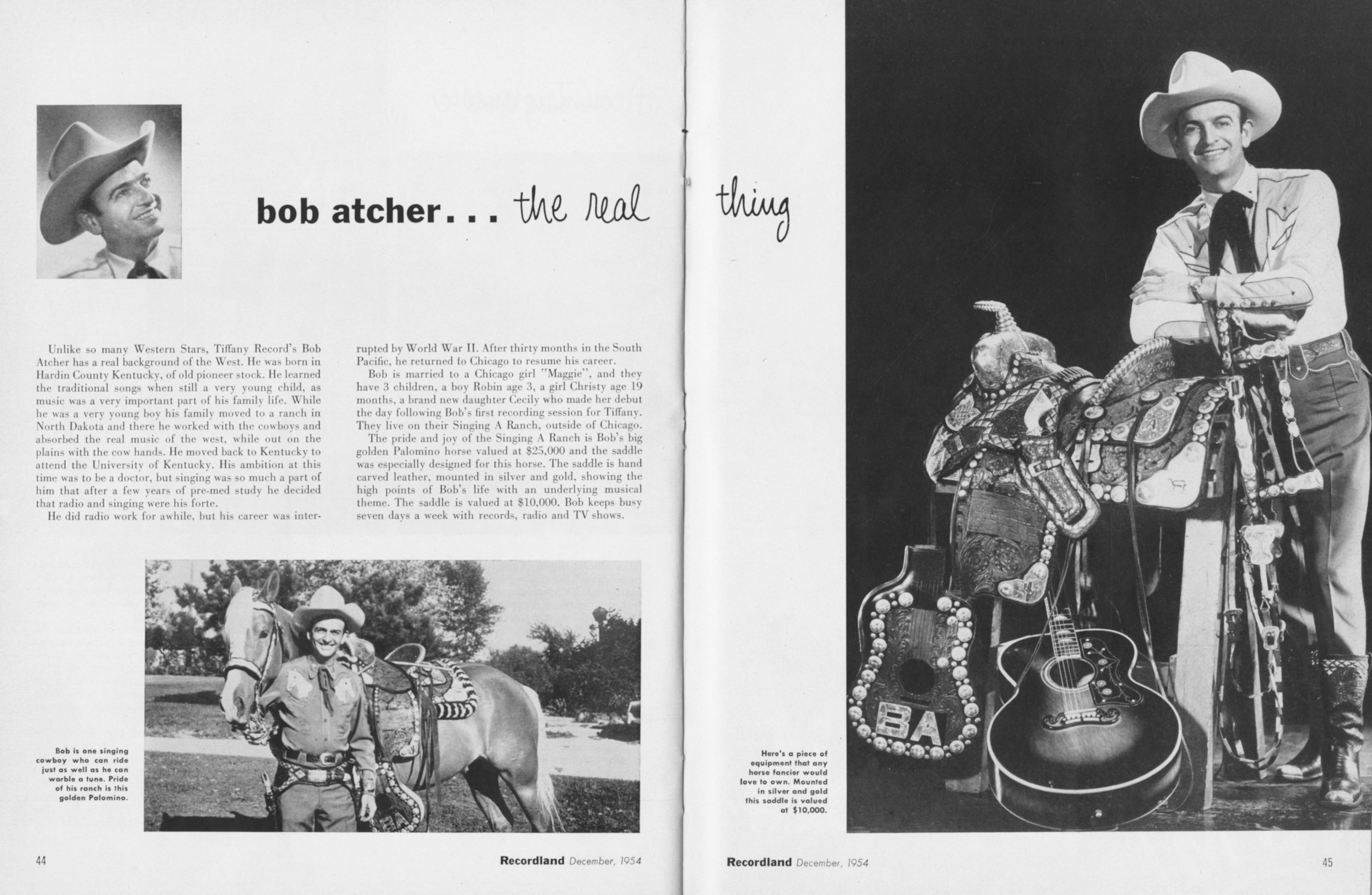 Bob AtcherBob Atcher Bob Atcher James Robert Owen "Bob" Atcher was an American country musician James Robert Owen "Bob" Atcher (May 11, 1914[1] – October 31, 1993)[2] was an American country musician. Quick facts Background information, Born ... Bob Atcher Atcher as the host of Meadow Gold Ranch, a children's show on WENR-TV in the early 1950s. Background information Born James Robert Owen Atcher May 11, 1914 (1914-05-11) Hardin County, Kentucky, US Died October 31, 1993(1993-10-31) (aged 79) Prospect, Kentucky, US Genres Country Instruments Guitar, fiddle Years active 1937-1966 Labels ARC, Okeh Records, Columbia Records, Capitol Records, Kapp Records Close Biography Atcher was born in Hardin County, Kentucky, United States,[1] and learned violin and guitar from his father, who was a… (Source: Wikipedia)
