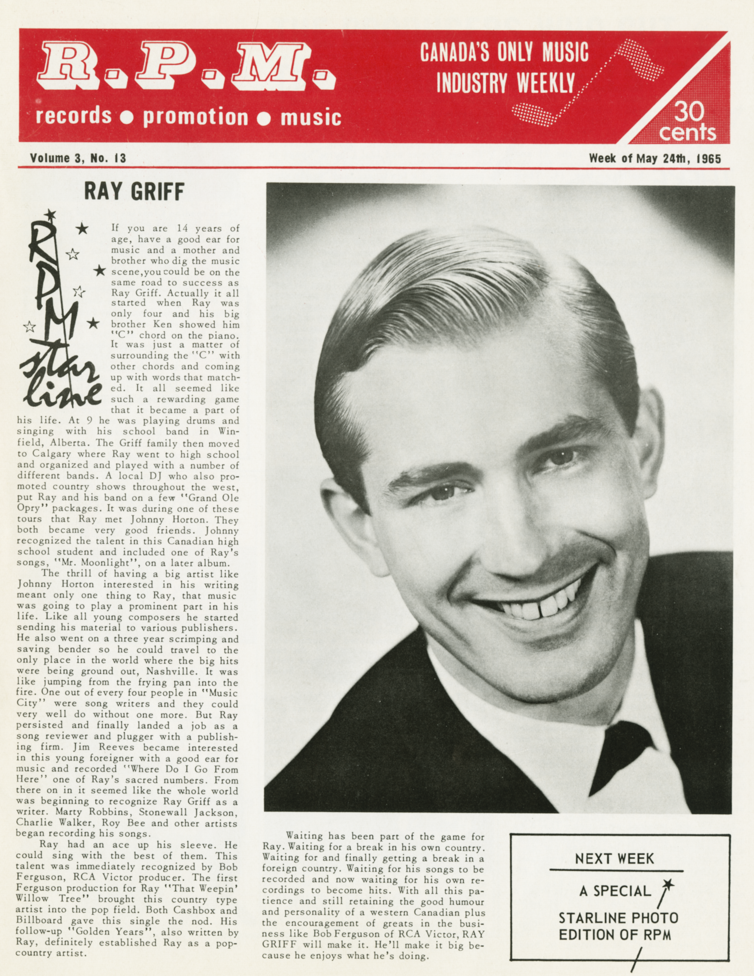 Ray GriffRay Griff Ray Griff Canadian singer-songwriter (1940–2016) John Raymond David Griff[1] (April 22, 1940 – March 9, 2016)[2][3] was a Canadian country music singer and songwriter, born in Vancouver and raised in Toronto. His songwriting credits reached over 2500 songs, many of which were recorded by Nashville's top recording artists.[4] This article needs additional citations for verification. (March 2020) Quick facts Background information, Born ... Ray Griff Griff in 1969 Background information Born John Raymond David Griff (1940-04-22)April 22, 1940 Vancouver, British Columbia, Canada Died March 9, 2016(2016-03-09) (aged 75) Genres Country Occupation Singer-songwriter Instrument Vocals Years active 1964–2016 Labels Dot, Capitol, GRT Formerly of George Hamilton IV, Jerry Lee Lewis Close Early life and career Griff was born in… (Source: Wikipedia)