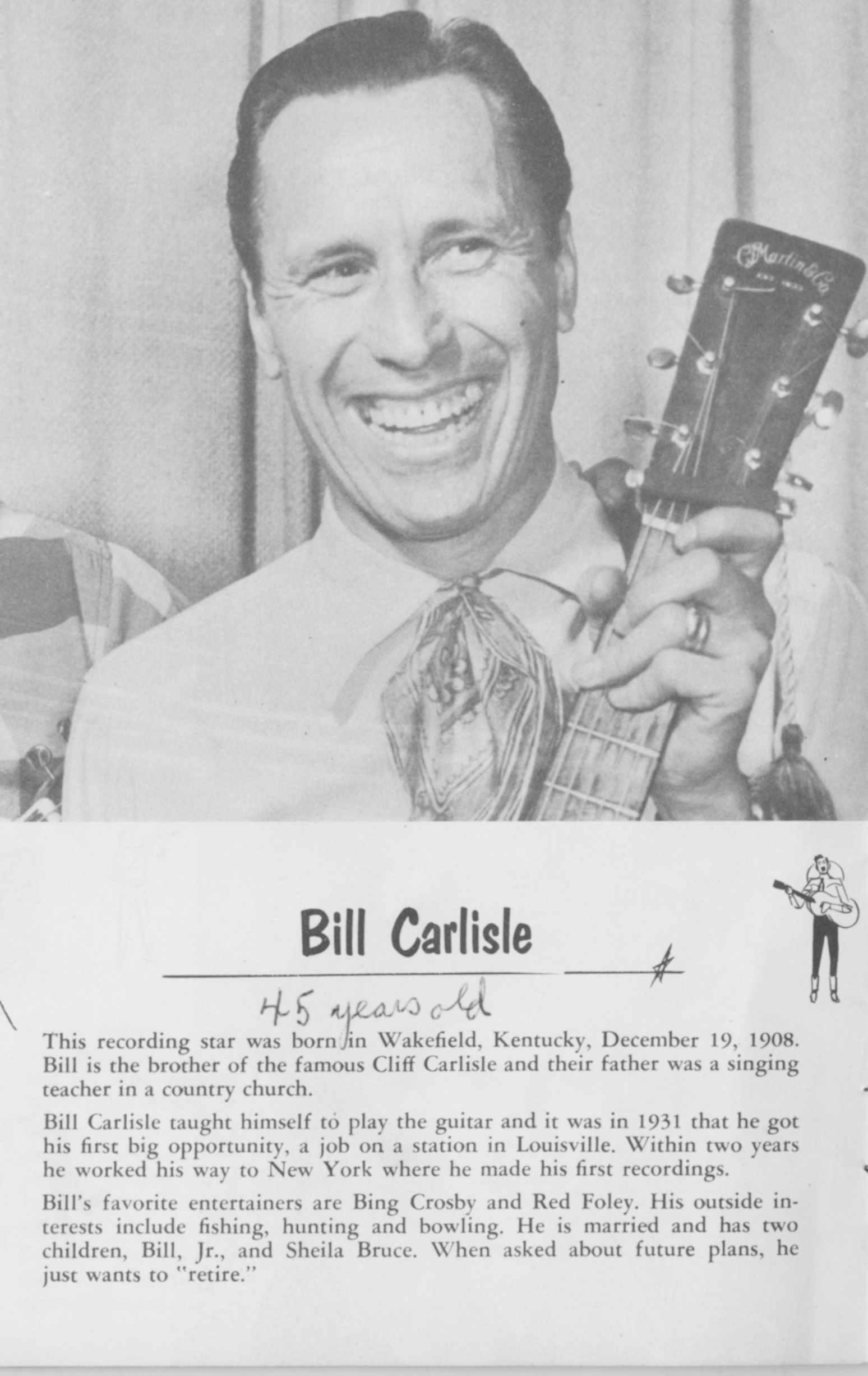 Bill CarlisleBill Carlisle Bill Carlisle American singer-songwriter This article is about the country music singer. For 'Wild Bill' Carlisle the train robber, see William L. Carlisle. William Toliver Carlisle (December 19, 1908 – March 17, 2003), better known as Bill Carlisle and Jumpin' Bill Carlisle, was an American country music singer, songwriter, comedian, and guitarist popular in the late 1940s and 1950s but who influenced the genre for more than 50 years. He is a member of the Country Music Hall of Fame. Quick facts Background information, Also known as ... Bill Carlisle Carlisle in the 1970s Background information Also known as Jumpin' Bill Carlisle Born William Tolliver Carlisle (1908-12-19)December 19, 1908 Origin Wakefield, Kentucky, United States Died March 17, 2003(2003-03-17)… (Source: Wikipedia)
