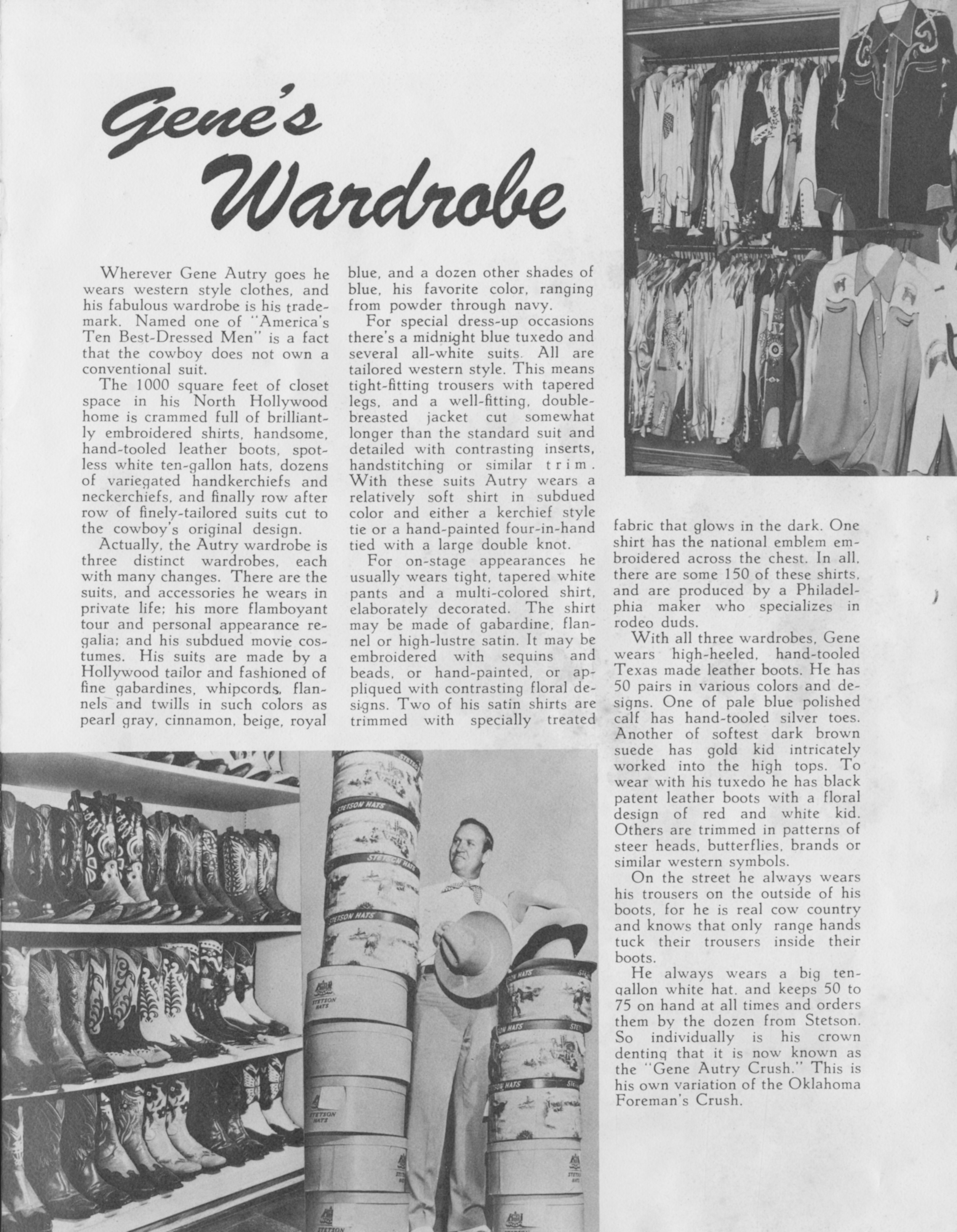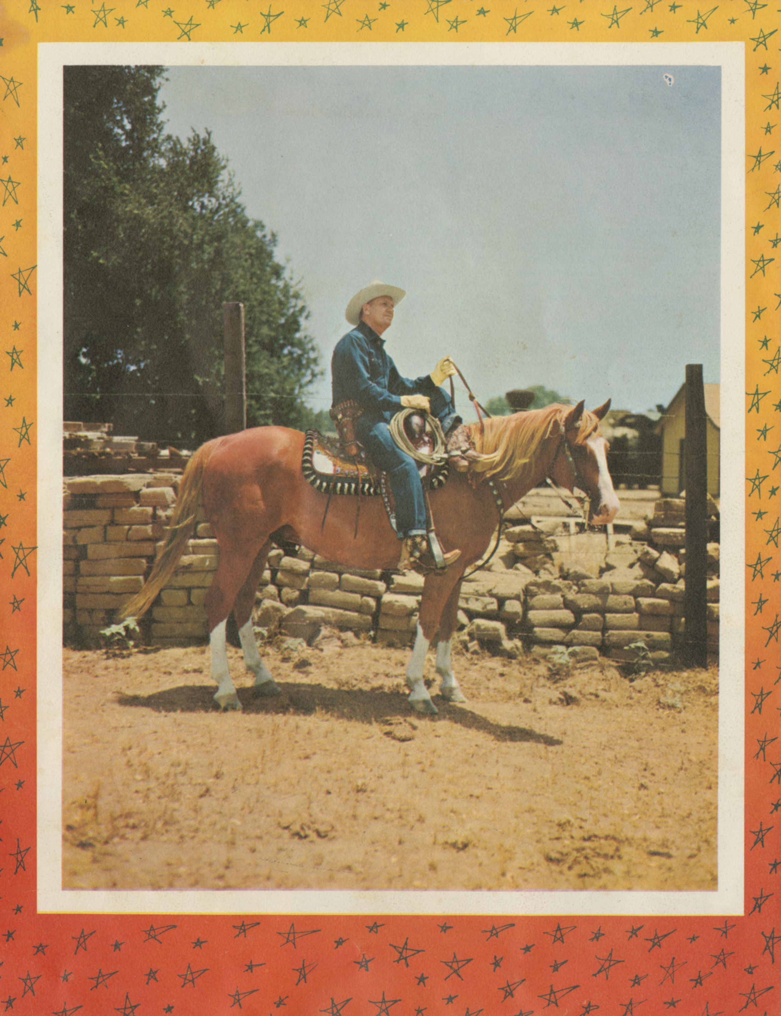![]() Gene Orvon Autry, 29 Sep 1907 - 2 Oct 1998. Color carbro print, 41 x 34 cm (16 1/8 x 13 3/8"). Image by Harry Warnecke / Robert F. Cranston, via Wikimedia Commons. Licensed Public domain |