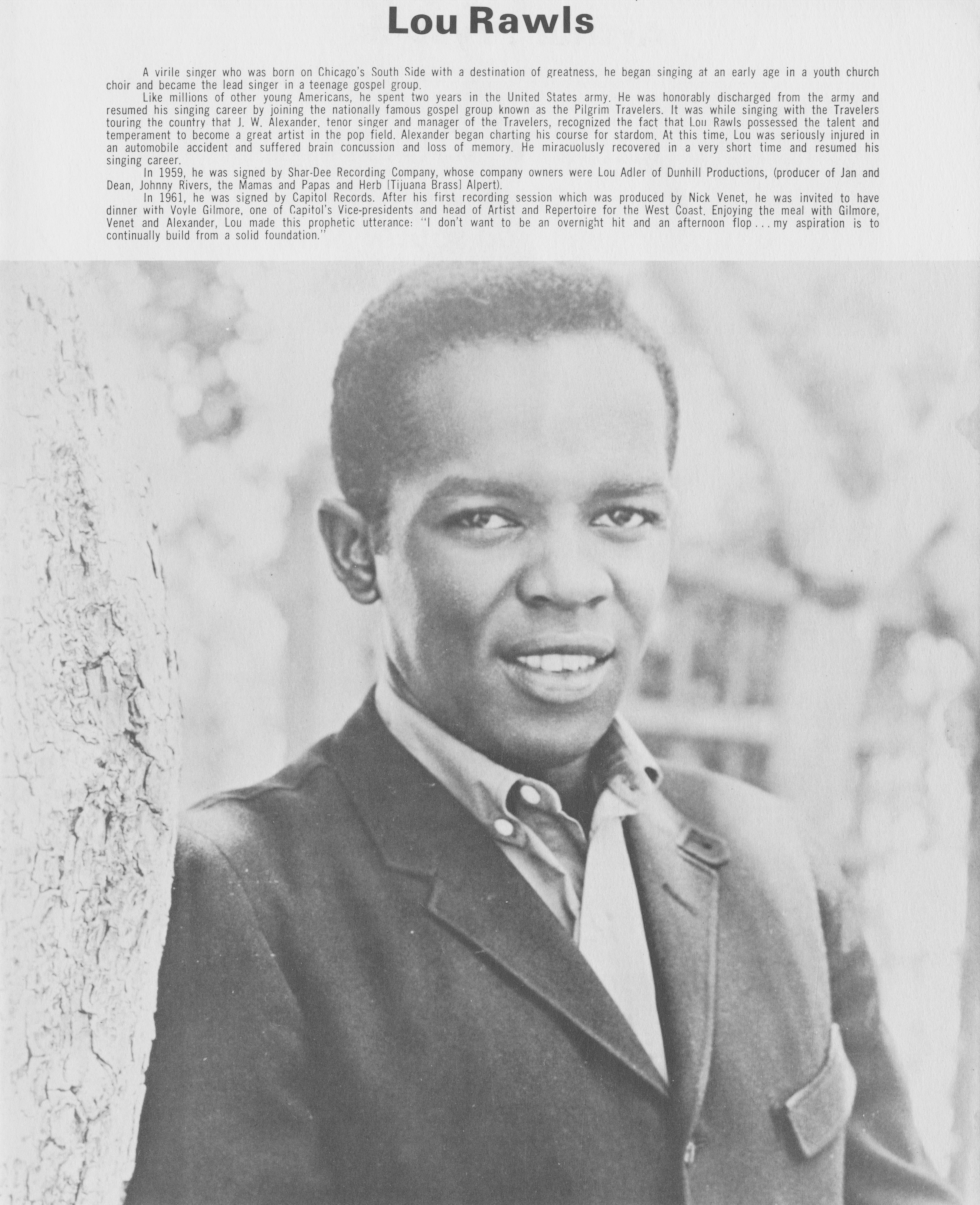 Lou RawlsLou Rawls Lou Rawls American singer (1933–2006) Louis Allen Rawls (December 1, 1933 – January 6, 2006) was an American baritone singer.[1] He released 61 albums, sold more than 40 million records,[2] and had numerous charting singles, most notably the song "You'll Never Find Another Love Like Mine". He also worked as a film, television, and voice actor. He was a three-time winner of the Best Male R&B Vocal Performance Grammy Award. Quick facts Born, Died ... Lou Rawls Rawls in 1984 Born Louis Allen Rawls (1933-12-01)December 1, 1933 Chicago, Illinois, U.S. Died January 6, 2006(2006-01-06) (aged 72) Los Angeles, California, U.S. Resting place Forest Lawn Memorial Park (Hollywood Hills) Occupations Singer record producer composer actor Years active 1941–2006 Musical… (Source: Wikipedia)