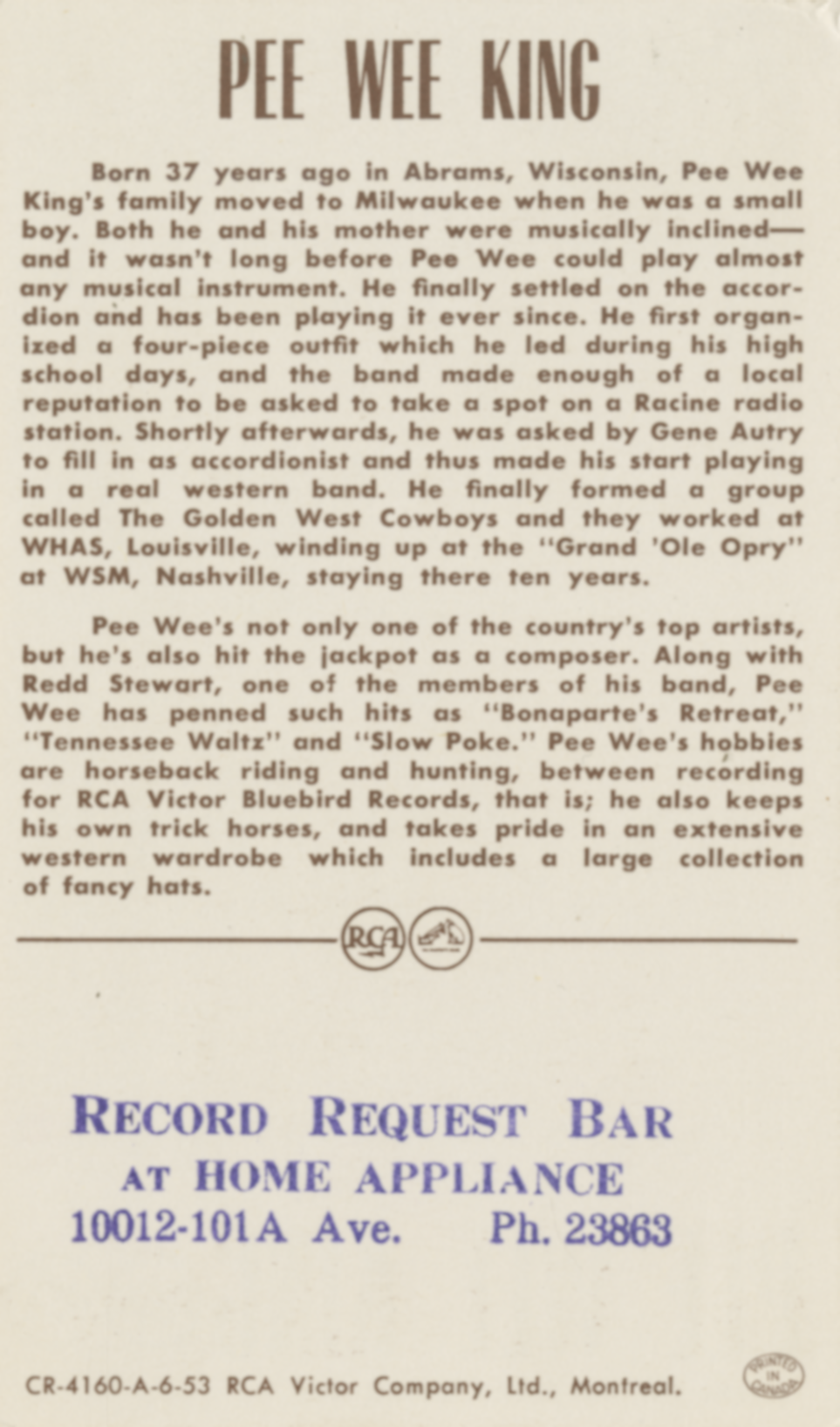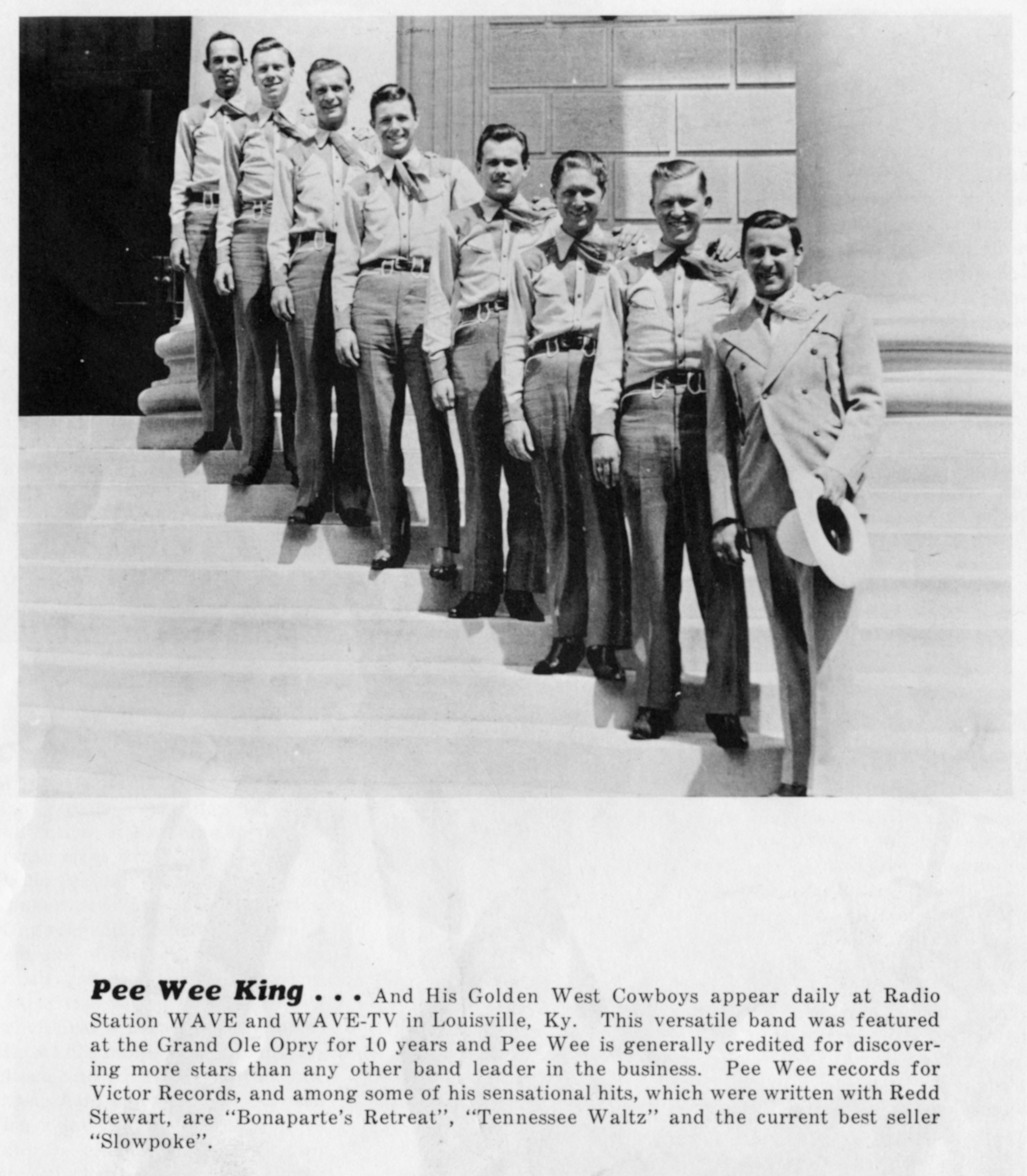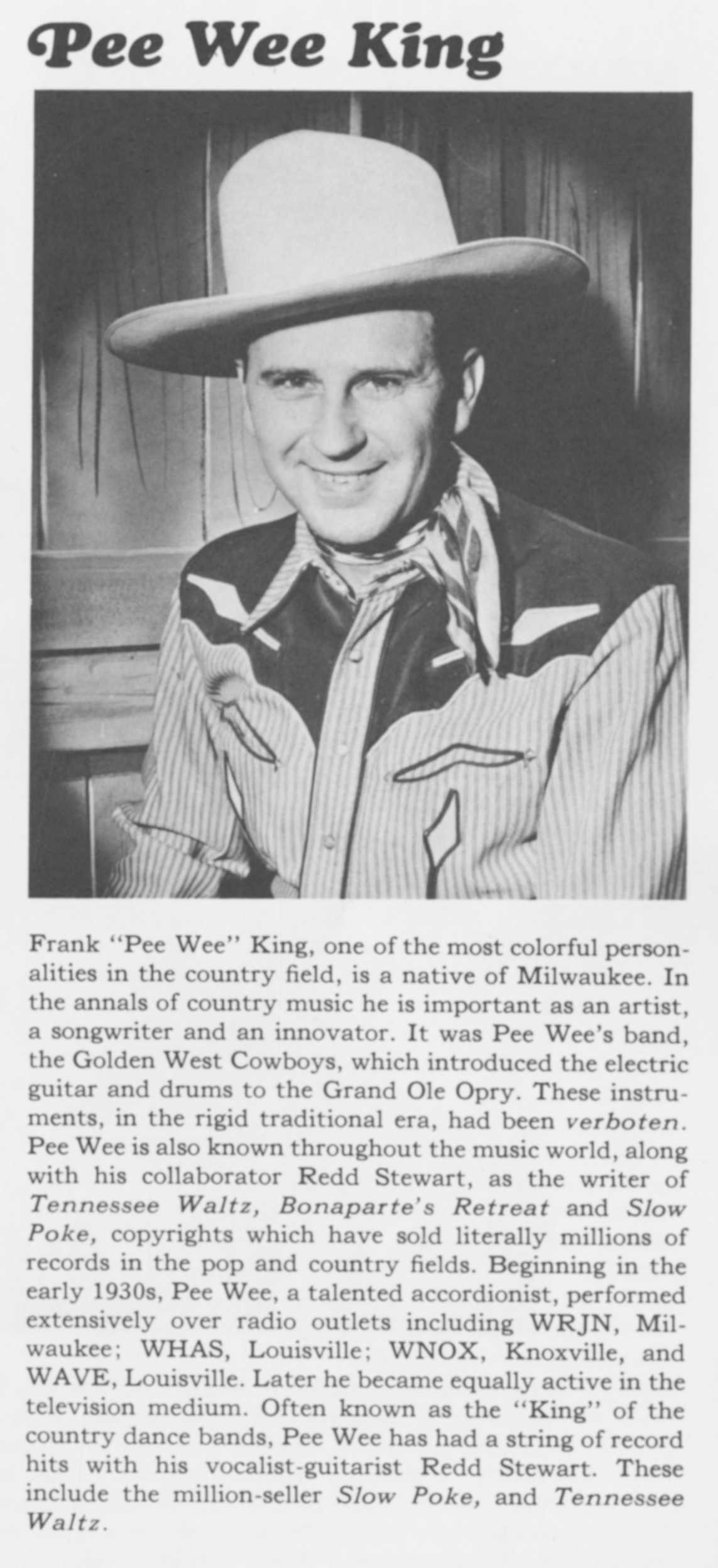 King Pee Wee And His Western Swing BandPee Wee King Pee Wee King American country music songwriter and recording artist (1914–2000) Julius Frank Anthony Kuczynski[1] (February 18, 1914 – March 7, 2000),[2] known professionally as Pee Wee King, was an American country music songwriter and recording artist best known for co-writing "Tennessee Waltz". Quick facts Background information, Born ... Pee Wee King Pee Wee King c. 1944 Background information Born Julius Frank Anthony Kuczynski (1914-02-18)February 18, 1914 Abrams, Wisconsin, United States Died March 7, 2000(2000-03-07) (aged 86) Louisville, Kentucky, United States Genres Country Occupation Singer-songwriter Instruments Accordion, fiddle Years active 1930s–1969 Close Pee Wee King is credited with bringing the musicians union to the Grand Ole Opry — he was one of the first musicians in Nashville… (Source: Wikipedia)