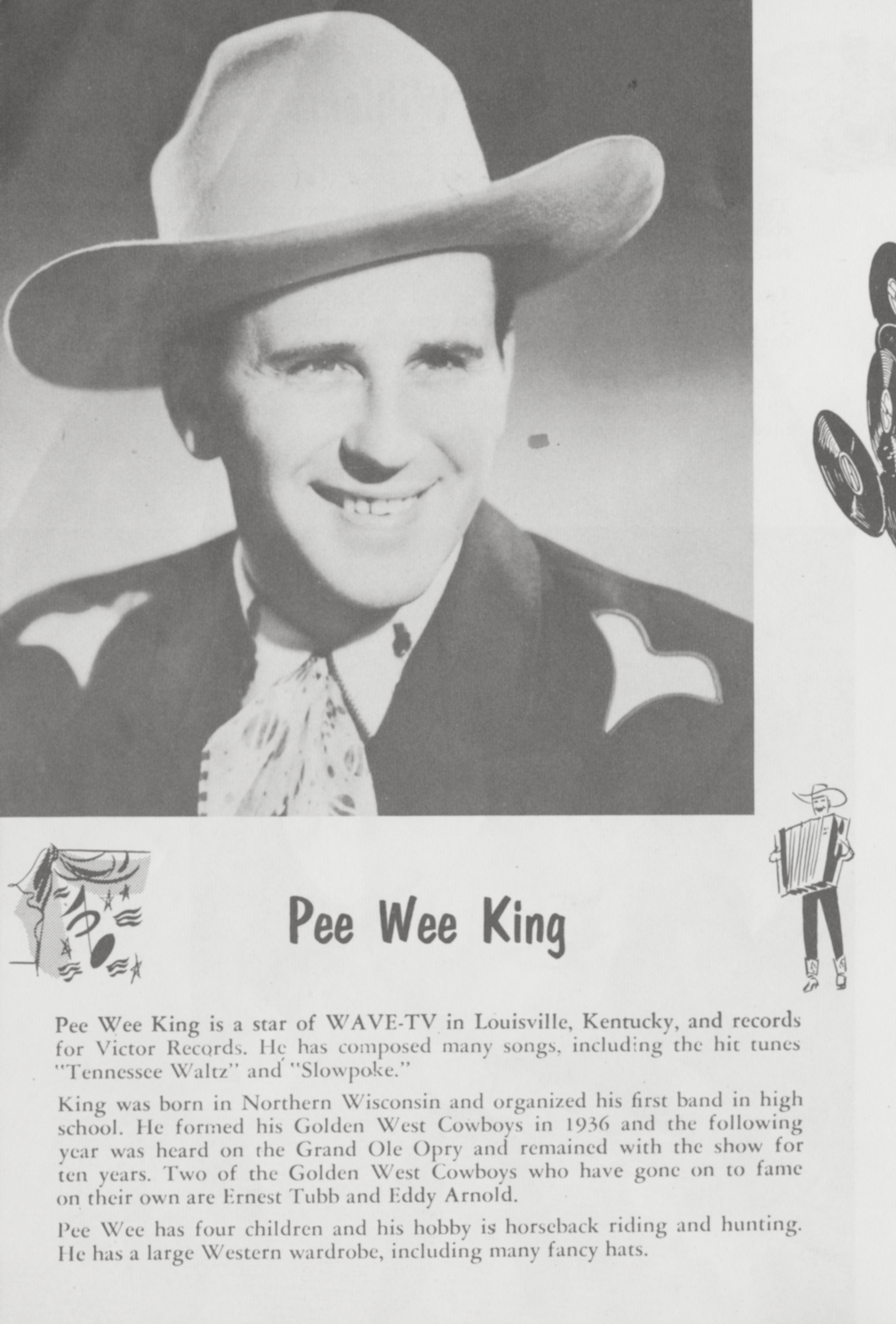 ![]() Pee Wee King Image by Unknown authorUnknown author, via Wikimedia Commons. Licensed Public domain |