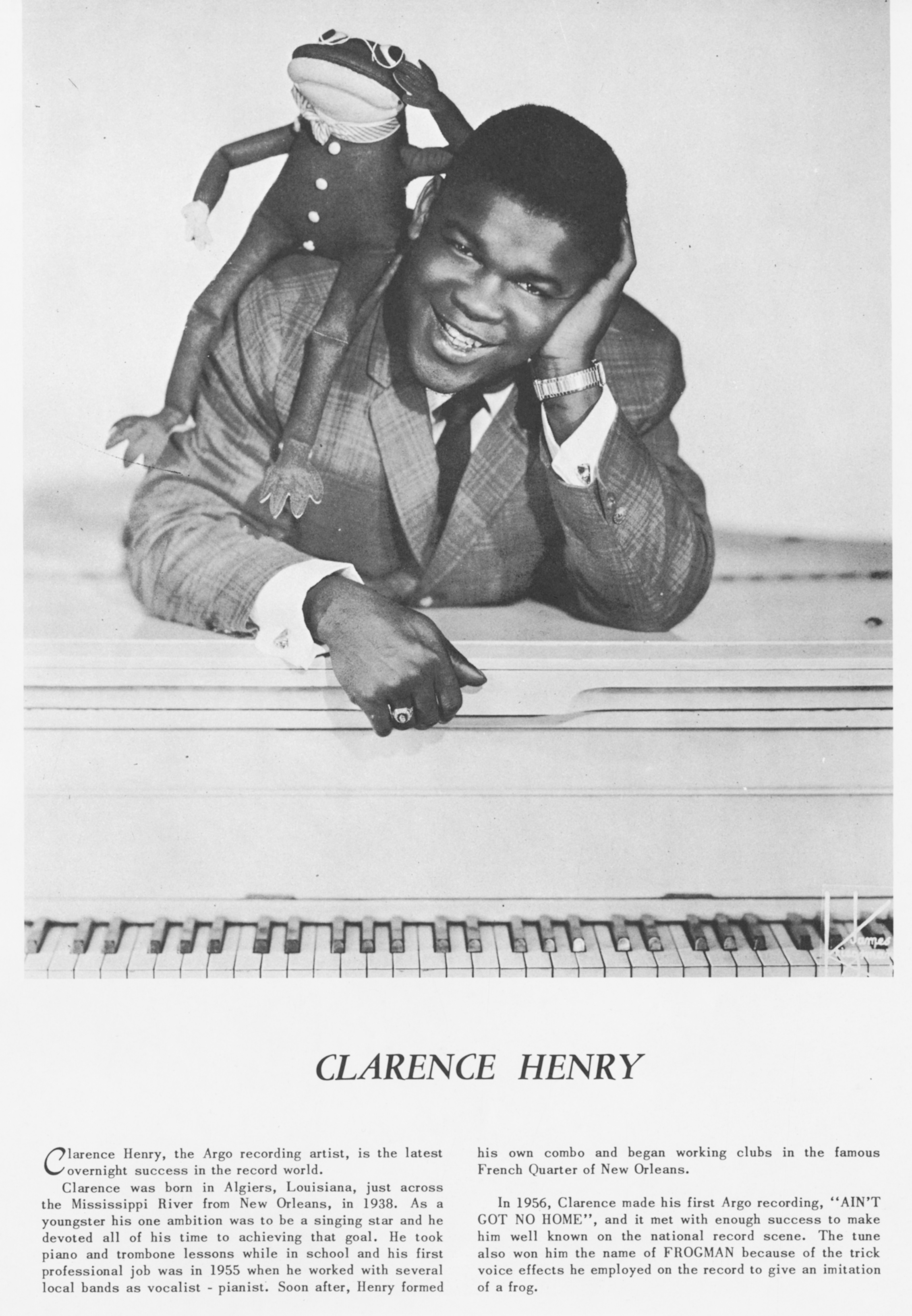 Henry Frogman ClarenceClarence "Frogman" Henry Clarence "Frogman" Henry American singer (1937–2024) This article is about the rhythm and blues artist. For other people with the same name, see Clarence Henry. Clarence Henry II (March 19, 1937 – April 7, 2024), known as Clarence "Frogman" Henry, was an American rhythm and blues singer and pianist, best known for his hits "Ain't Got No Home" (1956) and "(I Don't Know Why) But I Do" (1961).[1] This article needs additional citations for verification. (April 2024) Quick facts Background information, Born ... Clarence "Frogman" Henry Henry in 1997 Background information Born Clarence Henry II (1937-03-19)March 19, 1937 New Orleans, Louisiana, U.S. Died April 7, 2024(2024-04-07) (aged 87) New Orleans, Louisiana, U.S. Genres Rhythm and blues Occupation… (Source: Wikipedia)