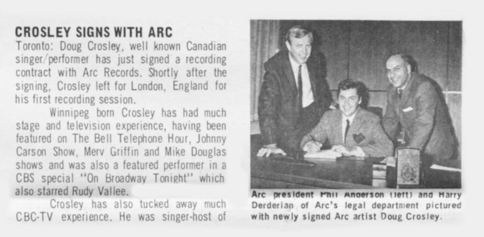 Doug CrosleyThe Doug Crosley Show The Doug Crosley Show 1973 Canadian TV series or program The Doug Crosley Show is a Canadian music variety television series which aired on CBC Television in 1973. Quick facts Genre, Created by ... The Doug Crosley Show Genre music variety Created by Perry Rosemond Written by Tom Ashmore Omar Williams Presented by Doug Crosley Country of origin Canada Original language English No. of seasons 1 Production Producer Larry Brown Production location Winnipeg Running time 30 minutes Original release Network CBC Television Release 16 June (1973-06-16) – 21 July 1973 (1973-07-21) Close Premise Doug Crosley had appeared in stage productions and on television series such as Juliette. For his own 1973 series, Crosley adopted country music… (Source: Wikipedia)