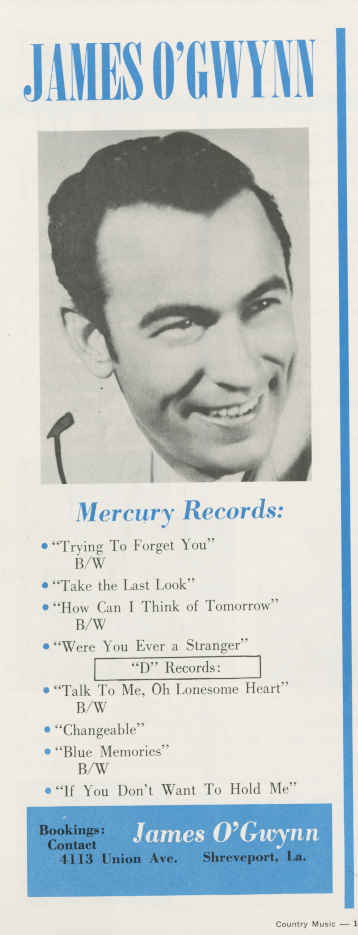 James O'GwynnJames O'Gwynn James O'Gwynn American country singer-songwriter (1928–2011) James Leroy O'Gwynn (January 26, 1928 – January 19, 2011) was an American country music singer. Between 1958 and 1962, he recorded for the D Records and Mercury labels, charting six times on the Hot Country Songs charts. His work on the D Records label was produced by Pappy Daily, best known for producing George Jones. Quick facts Born, Origin ... James O'Gwynn Born James Leroy O'Gwynn (1928-01-26)January 26, 1928[1] Winchester, Mississippi Origin Winchester, Mississippi, U.S. Died January 19, 2011(2011-01-19) (aged 82)[2] Hattiesburg, Mississippi, U.S. Genres Country Occupation Singer Instrument Vocals Years active 1958–1962 Labels D, Mercury, United Artists, Plantation Close O'Gwynn's highest-peaking single came during his Mercury career, when he reached… (Source: Wikipedia)