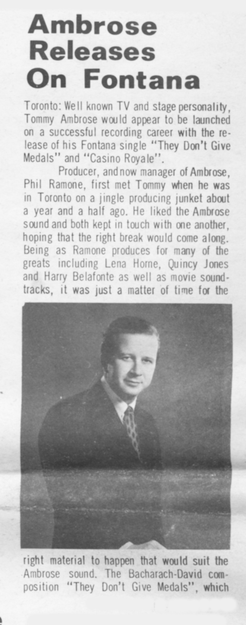Tommy AmbroseTommy Ambrose Tommy Ambrose Canadian singer-songwriter Thomas Ambrose (born 19 October 1939) is a Canadian singer-songwriter. Quick facts Born, Genres ... Tommy Ambrose Born Thomas Ambrose (1939-10-19) 19 October 1939 (age 86) Toronto, Ontario, Canada Genres country music, lounge music, easy listening, gospel music, jazz, jingles Occupation Singer-songwriter Years active 1957-2016 Close Tommy Ambrose was born in Toronto, Ontario, Canada. At age four he began gospel singing at "Youth for Christ" rallies at Massey Hall, Maple Leaf Gardens, and elsewhere under the direction of Charles B. Templeton.[1] Until he was sixteen he performed on gospel radio shows on 590 CKEY and 1010 CFRB. Turning to popular music he made his CBC TV debut on Cross-Canada Hit Parade. Shortly after that… (Source: Wikipedia)
