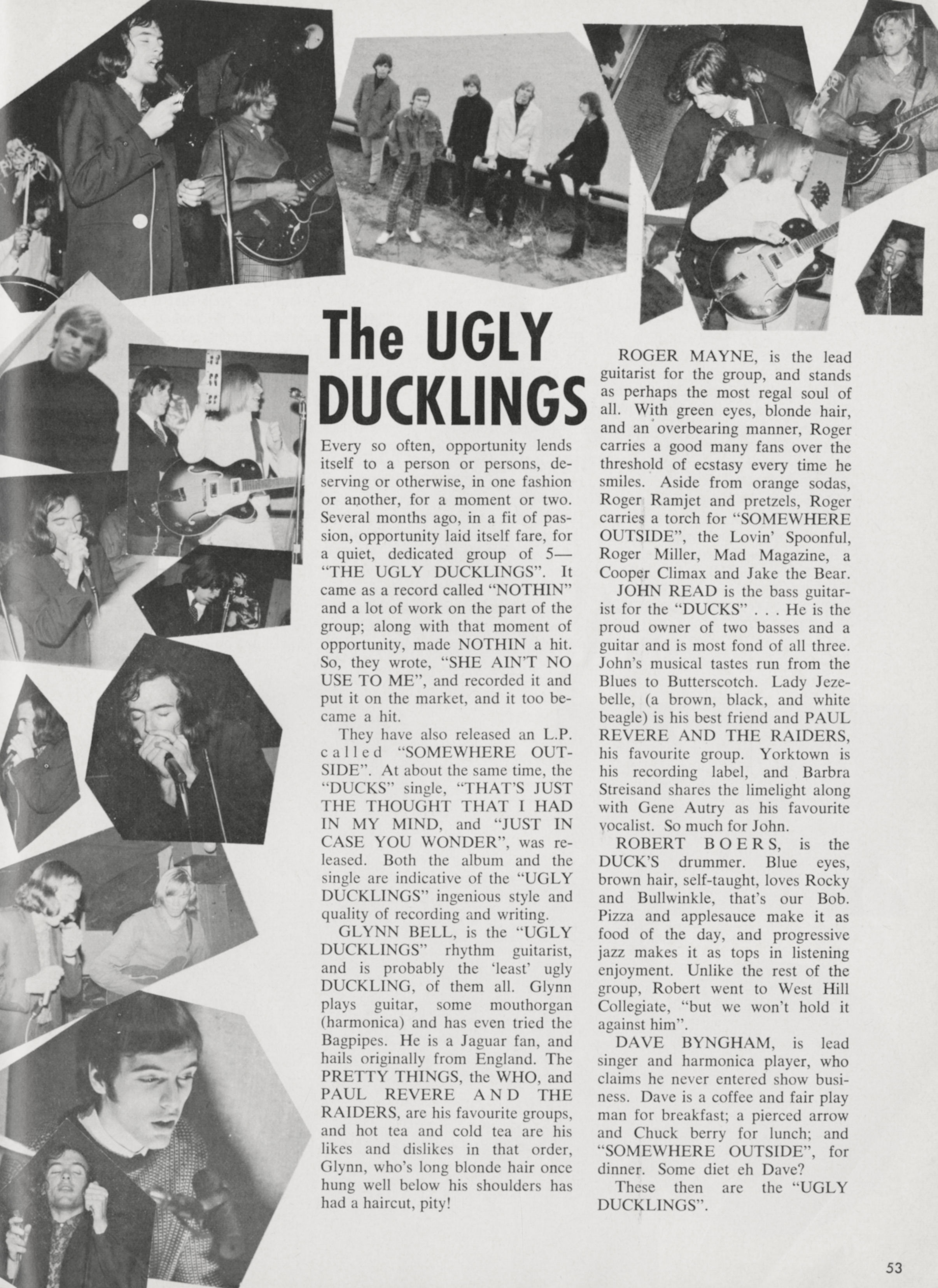 The Ugly DucklingsThe Ugly Ducklings The Ugly Ducklings Canadian garage rock band The Ugly Ducklings were a Canadian five-piece garage rock group based in Toronto, Ontario, Canada, most notable during the mid-1960s. Not to be confused with Ugly Duckling (hip hop group). This article needs additional citations for verification. (October 2021) Quick facts Origin, Genres ... The Ugly Ducklings Origin Toronto, Ontario, Canada Genres Rock, garage rock, proto-punk Years active 1965–1974, 1979–1982, 1986, 1988, 1999–2002 Close They released six singles in 1966 and 1967 on the Yorktown and Yorkville labels, and one album, Somewhere Outside in 1967. In the summer and fall of 1967, the band's fifth single "Gaslight" became a Top 40 hit across Canada, peaking at No. 17 on the… (Source: Wikipedia)