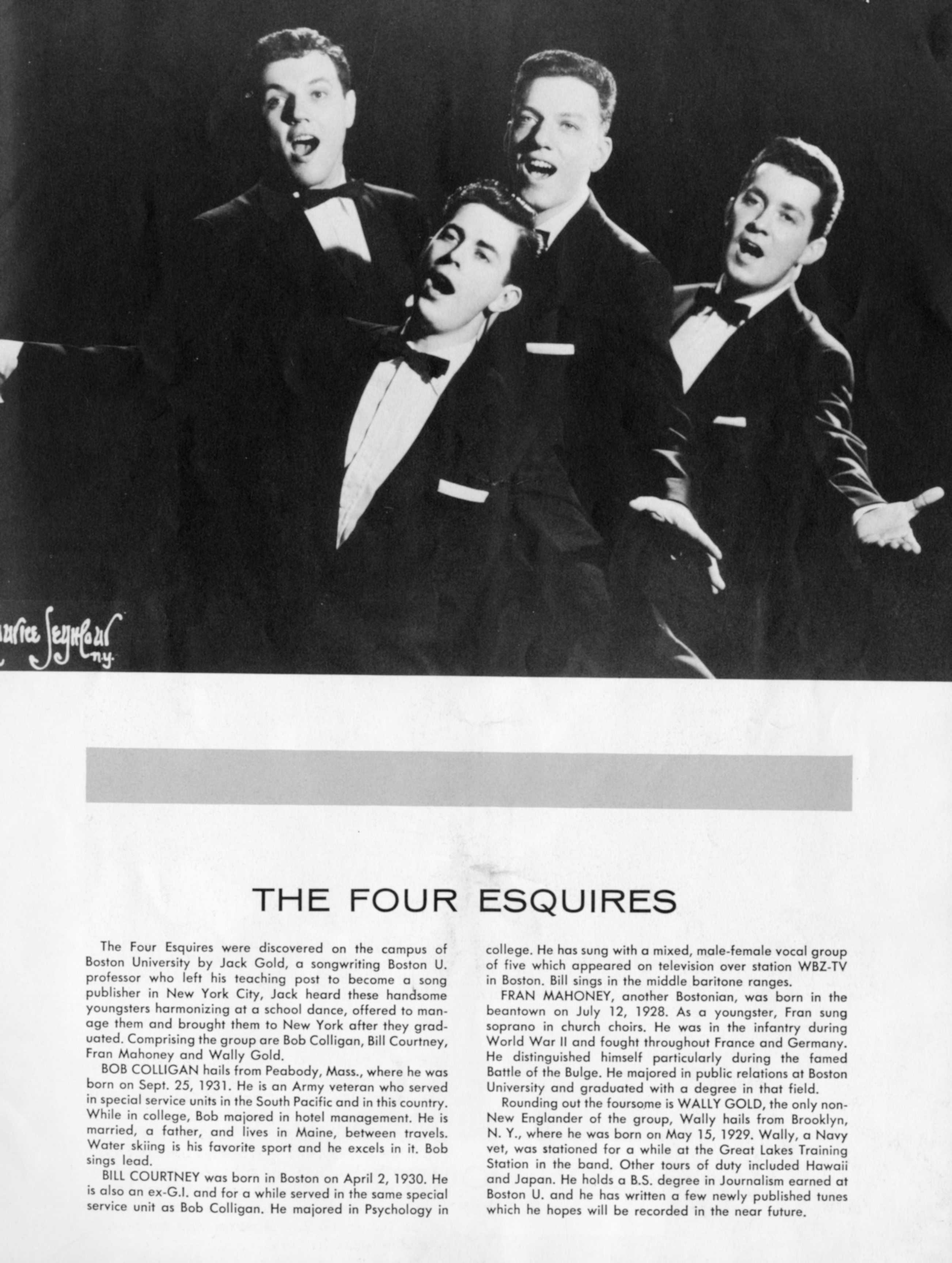 ![]() Photo of the musical group The Four Esquires. Image by Paris Records, via Wikimedia Commons. Licensed Public domain |