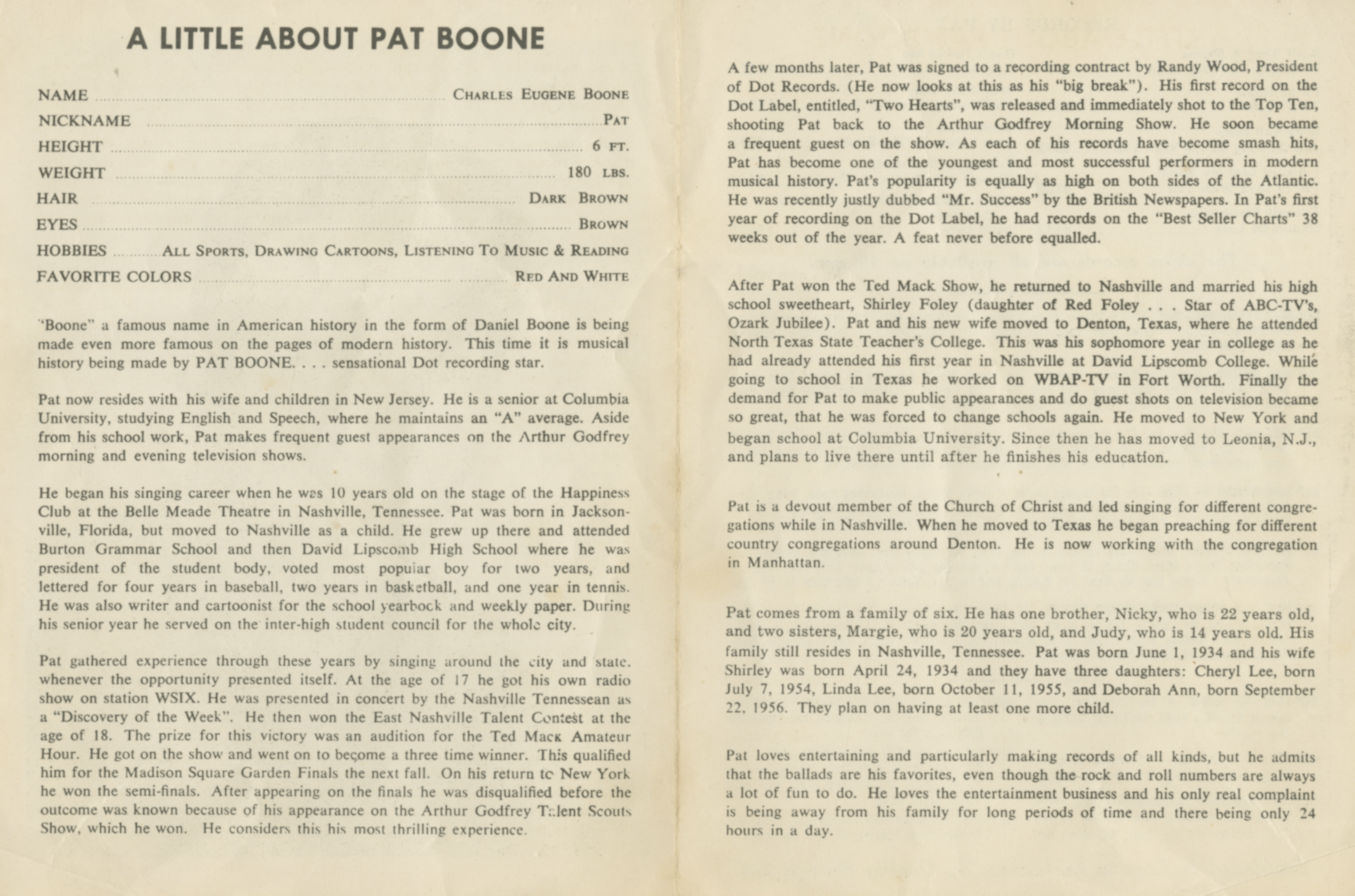 Pat BoonePat Boone Pat Boone American singer (born 1934) Not to be confused with Pat Boone (politician). Patrick Charles Eugene Boone[1] (born June 1, 1934) is an American singer, songwriter, actor, author, television personality, radio host, and philanthropist. One of the best-selling American recording artists of the 1950s and early 1960s, he has sold nearly 50 million records, charted 38 Top 40 hits in the United States, and appeared in numerous feature films.[2] Quick facts Background information, Born ... Pat Boone Boone in 2022 Background information Born Patrick Charles Eugene Boone (1934-06-01) June 1, 1934 (age 91) Jacksonville, Florida, U.S. Origin Nashville, Tennessee, U.S. Genres Pop country gospel vocal jazz Occupations Singer actor composer Works Pat Boone discography Years active 1953–present… (Source: Wikipedia)