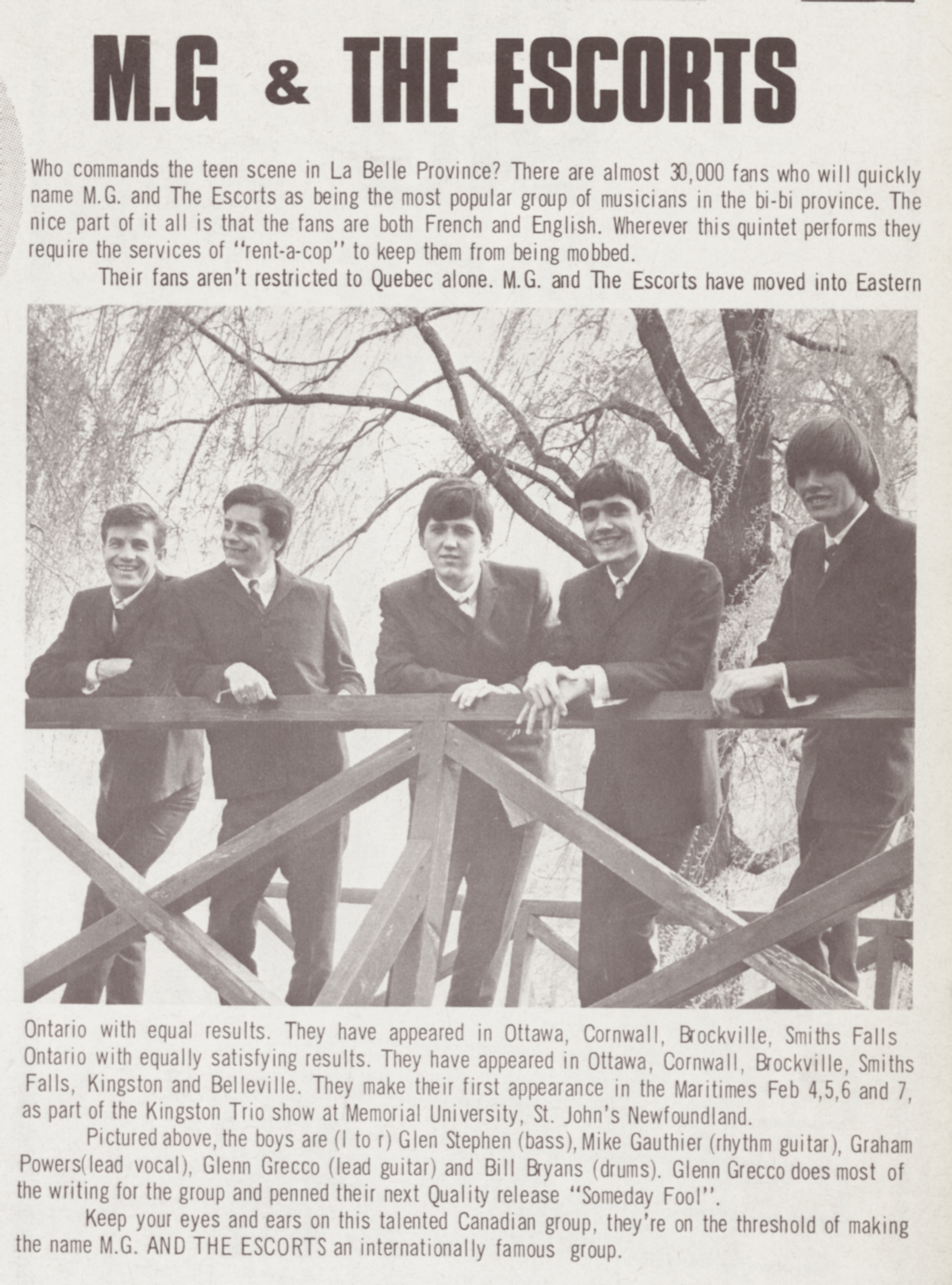 M.G. & The EscortsBilly Bryans Billy Bryans Musical artist William Taylor Bryans[3] (September 15, 1947 – April 23, 2012) was a Canadian percussionist, songwriter, music producer and DJ, known as one of the founders of The Parachute Club, among other accomplishments in music. As a producer, he worked on projects for artists as diverse as Dutch Mason, Raffi, Lillian Allen and the Downchild Blues Band.[1] He was born in Montreal, but spent most of his adult life in Toronto, and was particularly supportive of world music as both a promoter and publicist, focusing on bringing Caribbean, Cuban and Latin American music to a wider audience. Quick facts Born, Died ... Billy Bryans Born William Taylor Bryans (1947-09-15)September 15, 1947[1] Montreal, Quebec, Canada Died… (Source: Wikipedia)