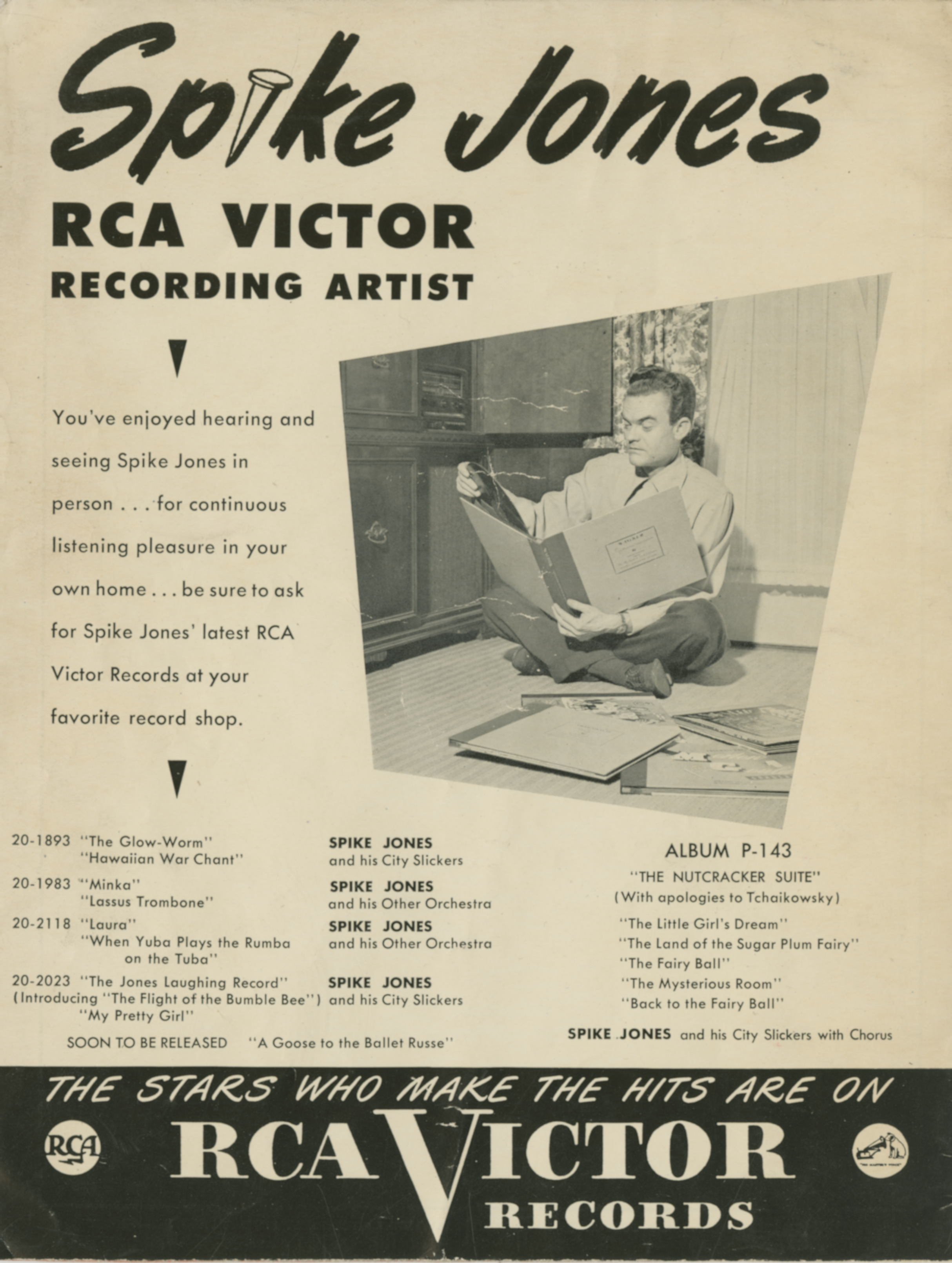 Spike JonesSpike Jones Spike Jones American actor, comedian, musician, bandleader and conductor (1911–1965) Not to be confused with the filmmaker Spike Jonze. For other people named Spike Jones, see Spike Jones (disambiguation). Lindley Armstrong "Spike" Jones (December 14, 1911 – May 1, 1965)[1] was an American musician, bandleader and conductor specializing in spoof arrangements and satire of popular songs and classical music. Ballads receiving the Jones treatment were punctuated with various sound effects, including gunshots, whistles, cowbells, hiccups, burps, sneezes, animal sounds and outlandish and comedic vocals. Jones and his band recorded for RCA Victor under the title Spike Jones and His City Slickers from the early 1940s to the mid-1950s, and they toured the United States and Canada as "The… (Source: Wikipedia)