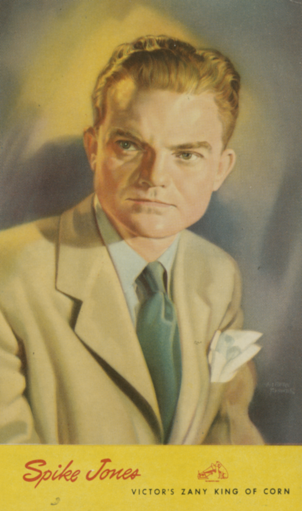 ![]() Photo portrait of American bandleader Spike Jones in a suit holding a straw hat. Image by Photographer unknown. Distributor also unknown; probably either Spike Jones or his record label, RCA Victor., via Wikimedia Commons. Licensed Public domain |
