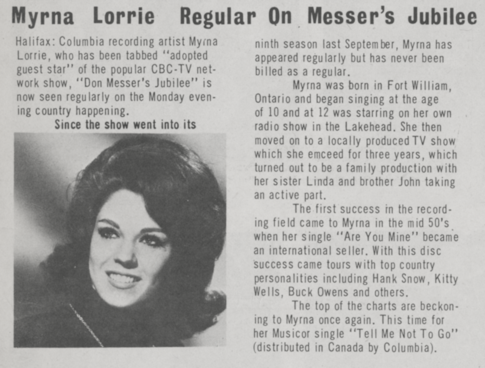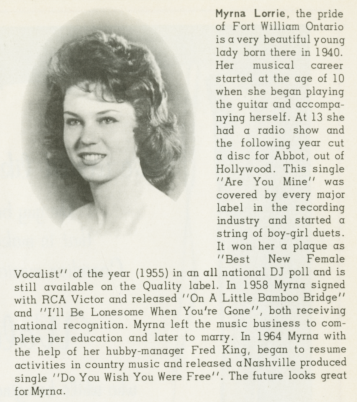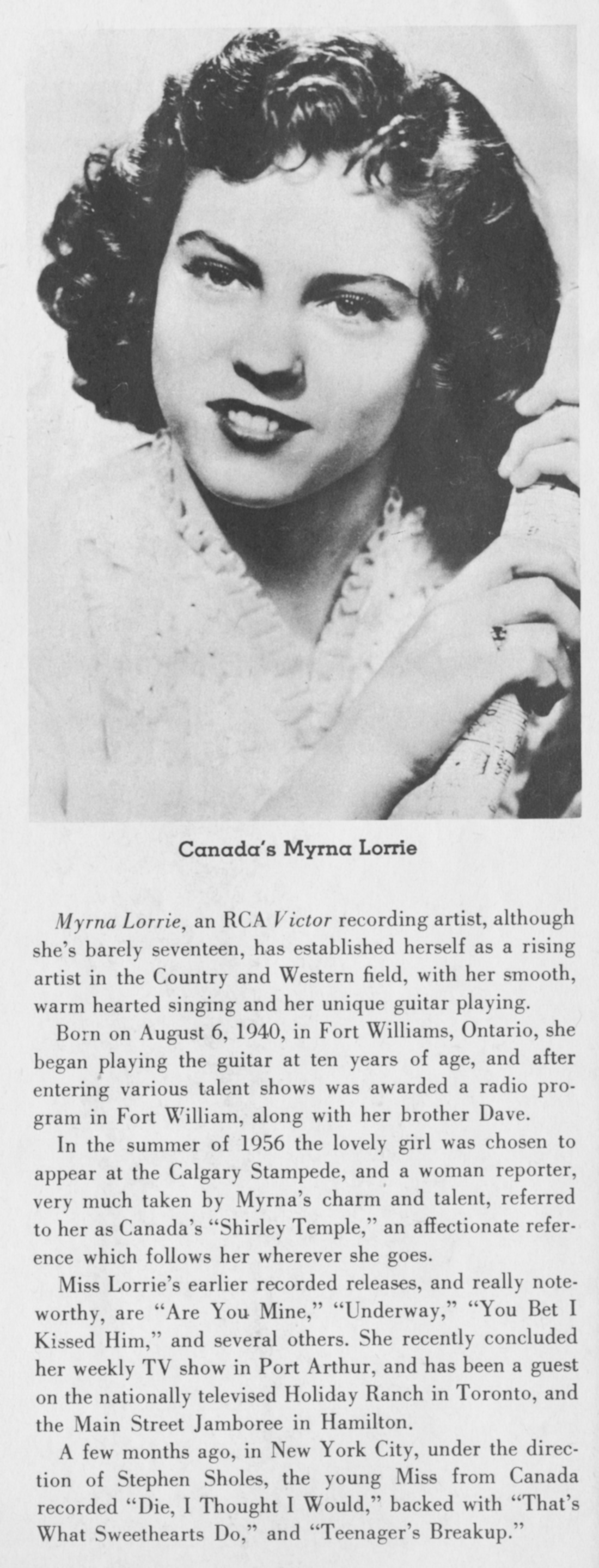 Myrna LorrieMyrna Lorrie Myrna Lorrie Canadian singer Myrna Lorraine Petrunka (born August 6, 1940), known professionally as Myrna Lorrie, is a Canadian country singer/songwriter/musician. Quick facts Born, Origin ... Myrna Lorrie Born Myrna Lorraine Petrunka (1940-08-06) August 6, 1940 (age 85) Cloud Bay, Ontario, Canada Origin Fort William, Ontario Genres Country Close Lorrie first sang publicly at age 11 on Fort William radio station CKPR on a program called School of the Air, whose host, Jack Masters, gave Lorrie her own radio show, Harmony Trails, when she was just 12. At age 14 she wrote and recorded the song "Are You Mine" with Buddy DeVal, which was released on Abbott Records and reached number 6 on the Billboard Chart. The song… (Source: Wikipedia)