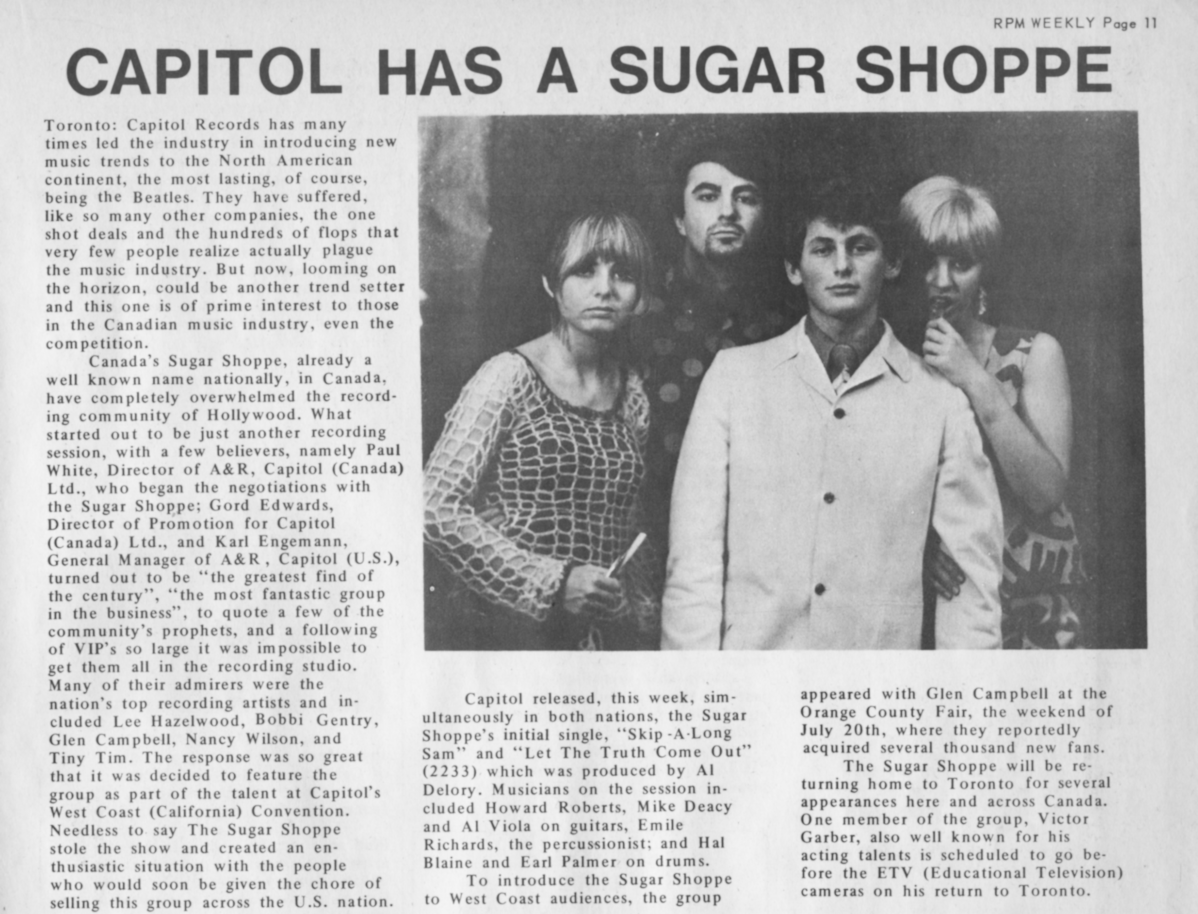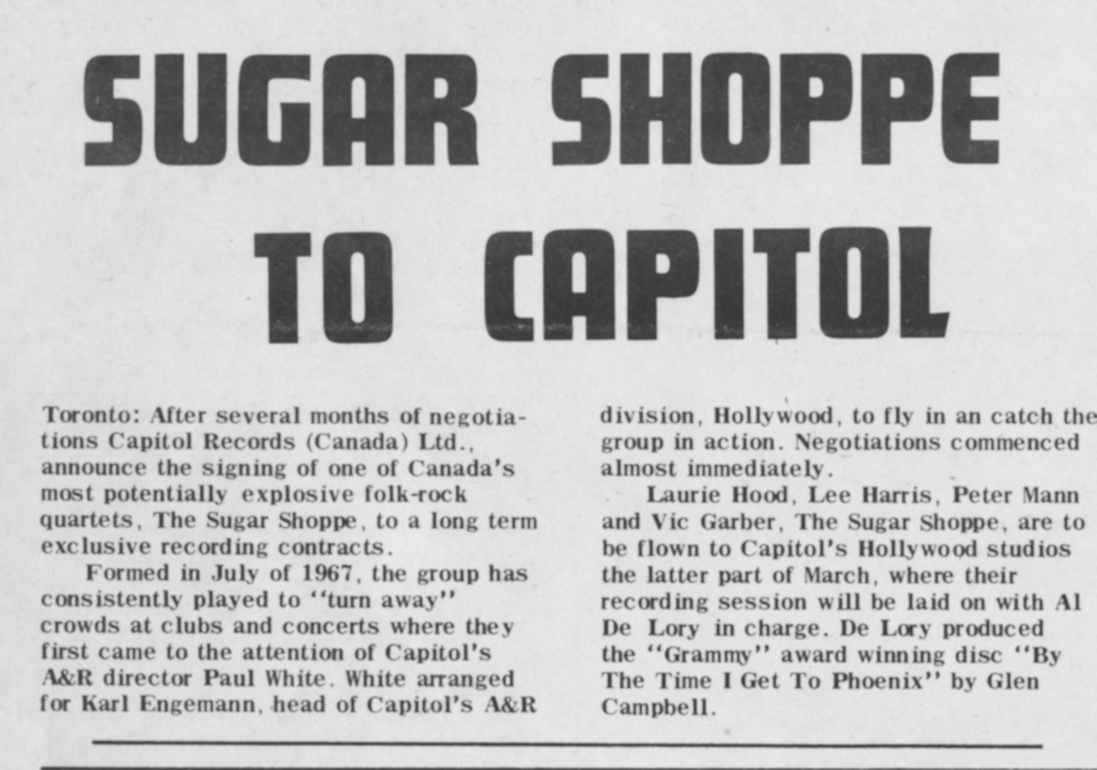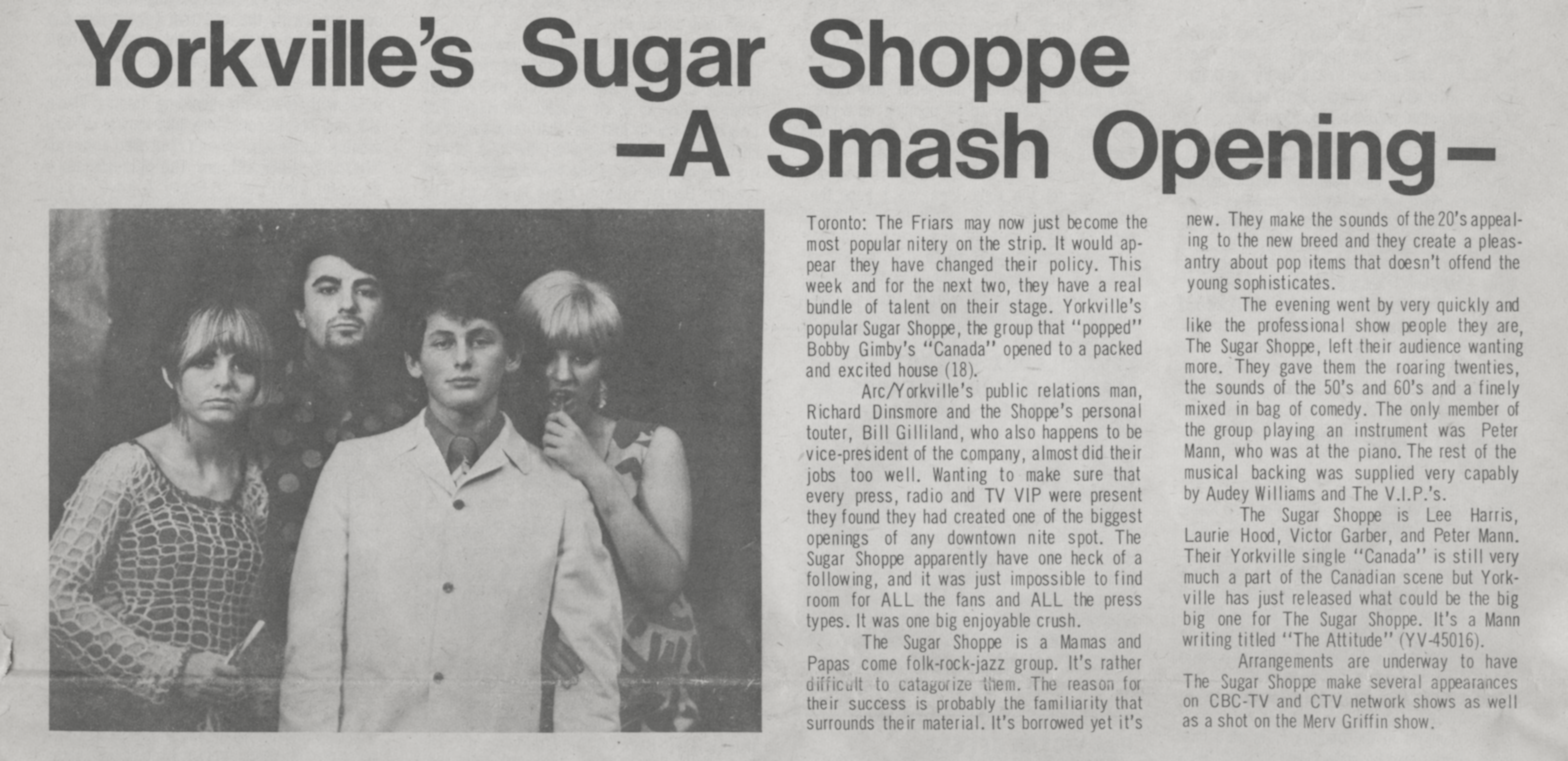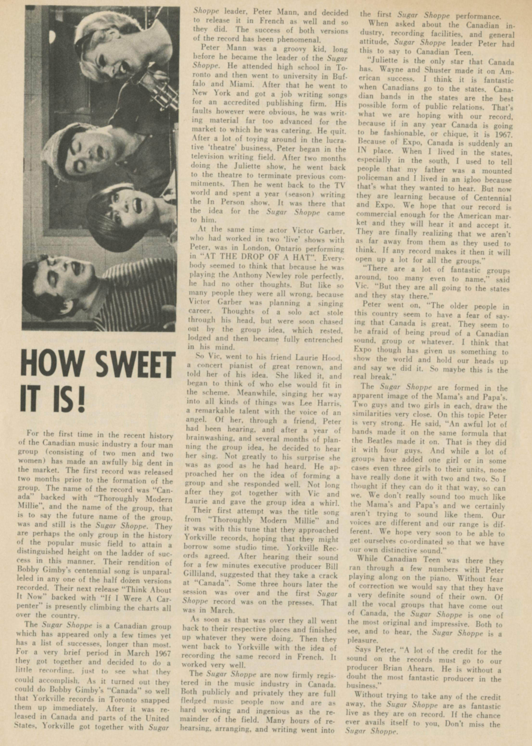 The Sugar ShoppeThe Sugar Shoppe The Sugar Shoppe Add article description The Sugar Shoppe was a Canadian sunshine pop vocal group that recorded in the 1960s and featured actor Victor Garber. Quick facts Origin, Genres ... The Sugar Shoppe Origin Toronto, Ontario, Canada Genres Sunshine pop[1] Years active 1967–1970 Labels Yorkville, Capitol, Epic Past members Peter Mann Laurie Hood Victor Garber Lee Harris Close History The group was formed in Toronto by lead singer, songwriter and pianist Peter Mann (October 9, 1940 – December 7, 2021). Born in New York City, he grew up in Miami, Florida, before working as an arranger and relocating to Canada in 1965. There, he met University of Toronto School of Music student and singer Laurie Hood,… (Source: Wikipedia)