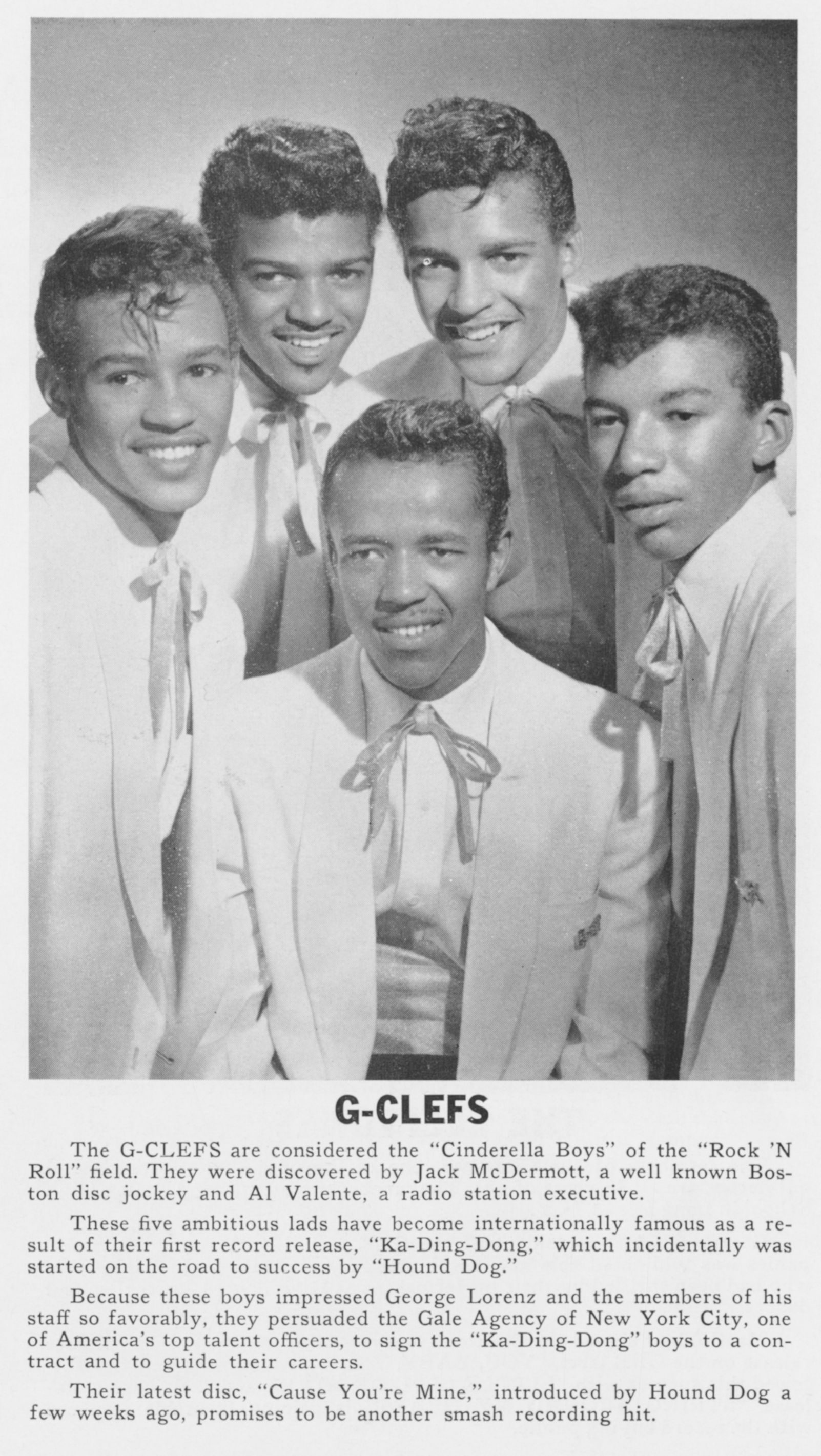 The G-ClefsThe G-Clefs The G-Clefs Add article description The G-Clefs were an American doo-wop/rhythm and blues vocal group, from Roxbury, Massachusetts, United States. The G-Clefs consisted of four brothers and a fifth member who was a childhood friend. They first sang together at St Richard's Catholic Church, in their hometown of Roxbury.[1] They were subsequently discovered by a talent scout named Jack Gold, who encouraged them to perform professionally.[2] They began performing in greater Boston in the early 1950s.[3] They scored two Top 40 hits in the United States: their version of "Ka-Ding-Dong" released in 1956 single, featuring Freddy Cannon on guitar, peaked at No. 24 on the Billboard Hot 100; it was the first national hit for their Boston-based label,… (Source: Wikipedia)