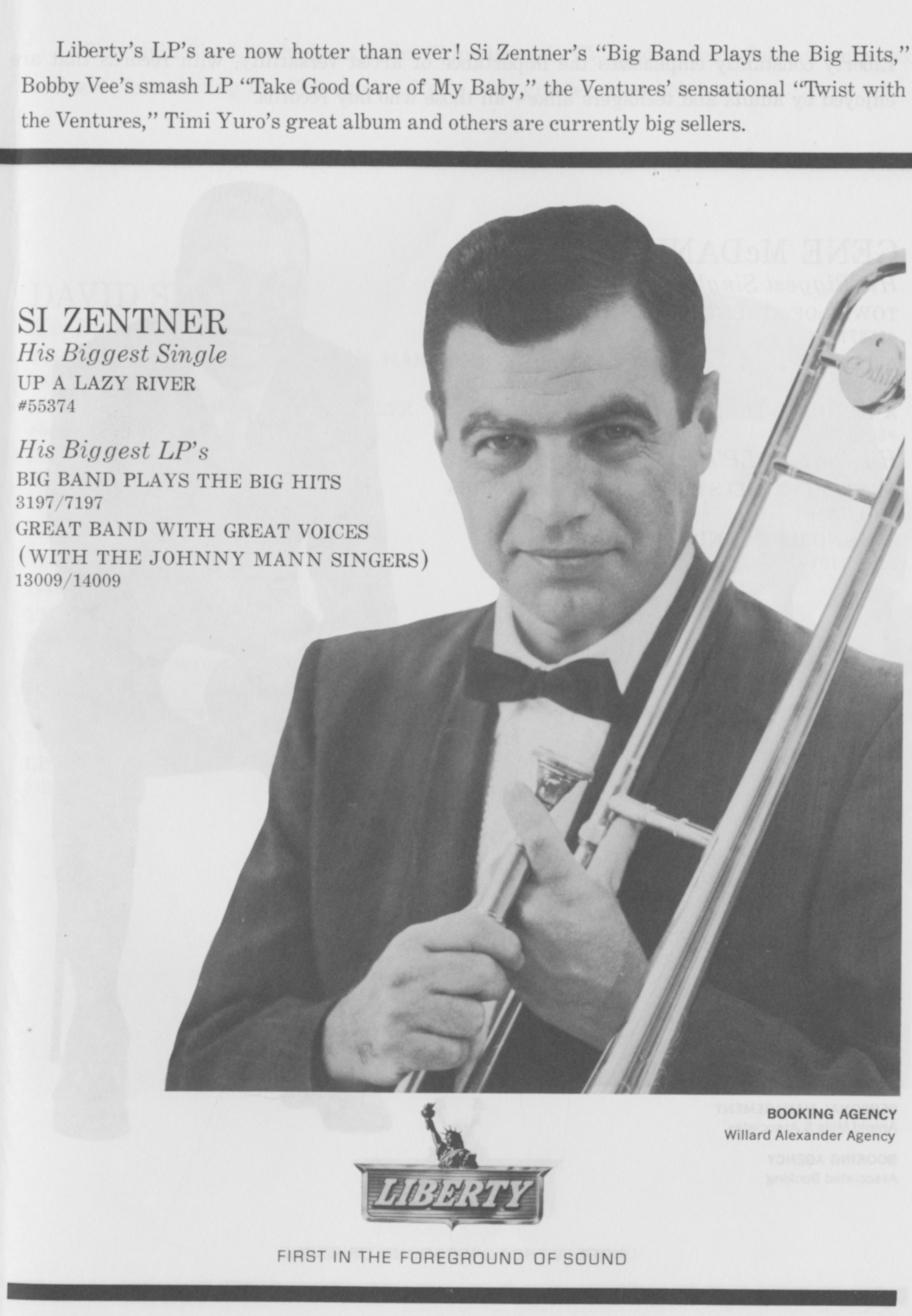 Zenter Si And His OrchestraSi Zentner Si Zentner American jazz trombonist (1917–2000) Simon Hugh Zentner (June 13, 1917 – January 31, 2000) was an American jazz trombonist and big-band leader.[1] Zentner, c. 1965 Zentner was born in New York City, United States. He played in the bands of Les Brown, Harry James, and Jimmy Dorsey in the 1940s, then moved to Los Angeles, where he worked as a studio musician.[1] He also landed a job with MGM from 1949 to the mid-50s, and was involved in the music for films such as Singin' in the Rain and A Star Is Born.[2] The Zentner band began recording for Liberty Records in 1959, recording numerous successful pop/jazz albums during the 1960s and touring steadily with a… (Source: Wikipedia)