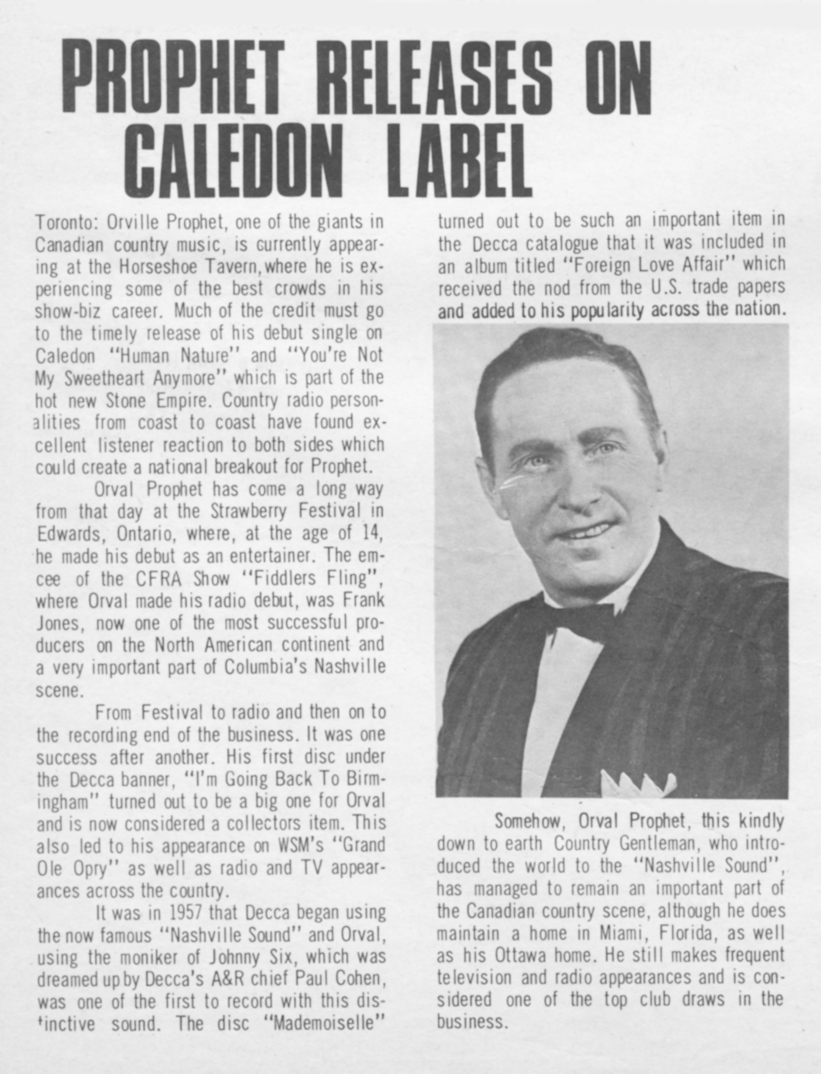Orval ProphetOrval Prophet Orval Prophet Musical artist Orval William Prophet (31 August 1922 – 4 January 1984) was among the first Canadian country music performers to achieve a career of international scope. Quick facts Also known as, Born ... Orval Prophet Also known as Orval Rex Prophet Johnny Six Born Orval William Prophet (1922-08-31)31 August 1922 Origin Edwards, Ontario, Canada Died 4 January 1984(1984-01-04) (aged 61) Genres country Occupation Singer-songwriter Instruments guitar[1] Years active 1944–1983 Labels Decca Close Early life Prophet was born in Edwards, Ontario, now part of Ottawa.[2] During his teens, he sang pop songs within his family and performed at church and community functions. He changed his focus to country music after he heard Hank Snow's music and… (Source: Wikipedia)