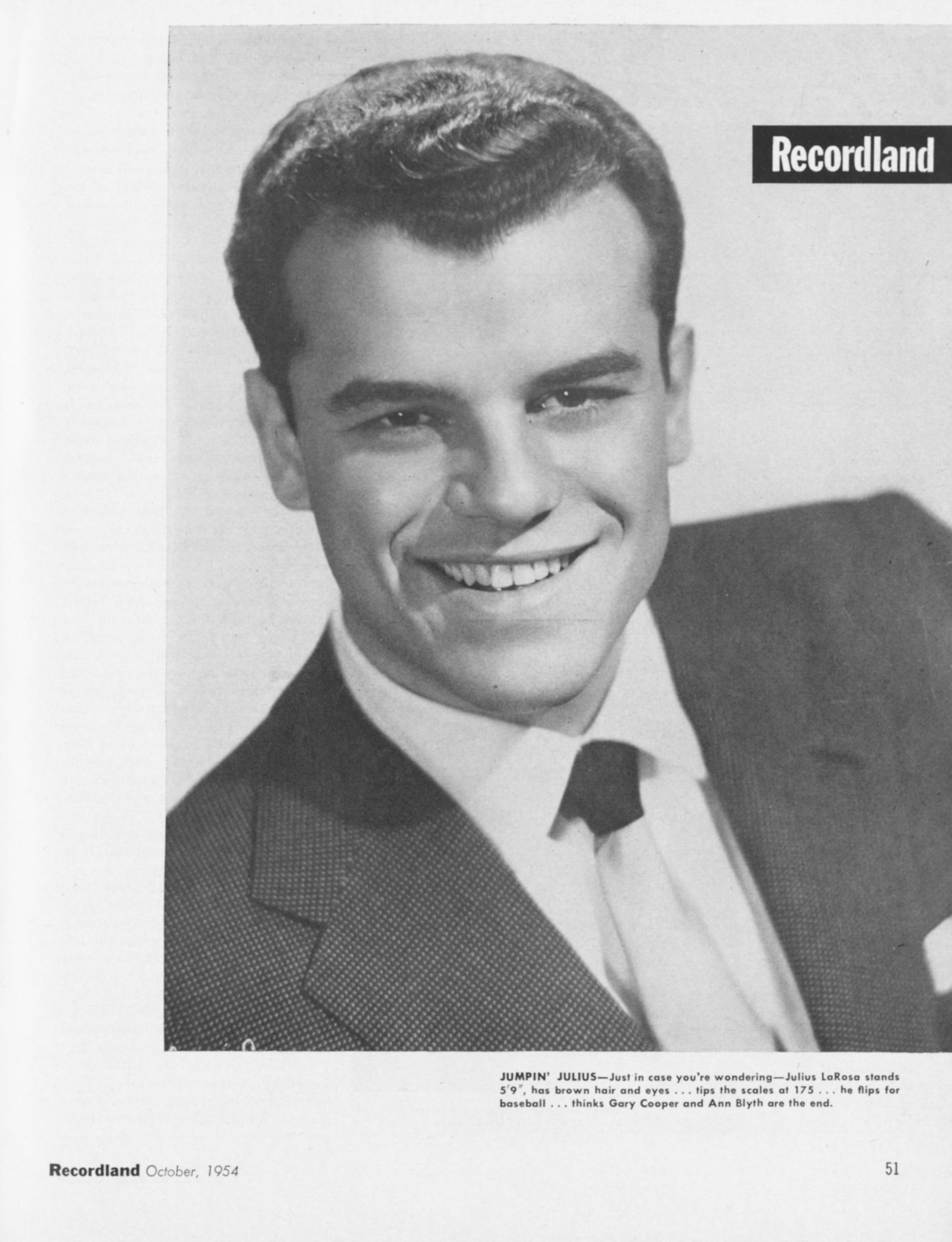 Publicity photo of singer Julius La Rosa. Image by General Artists Corporation (management); photographer: Maurice Seymour, Chicago., via Wikimedia Commons. Licensed Public domain |