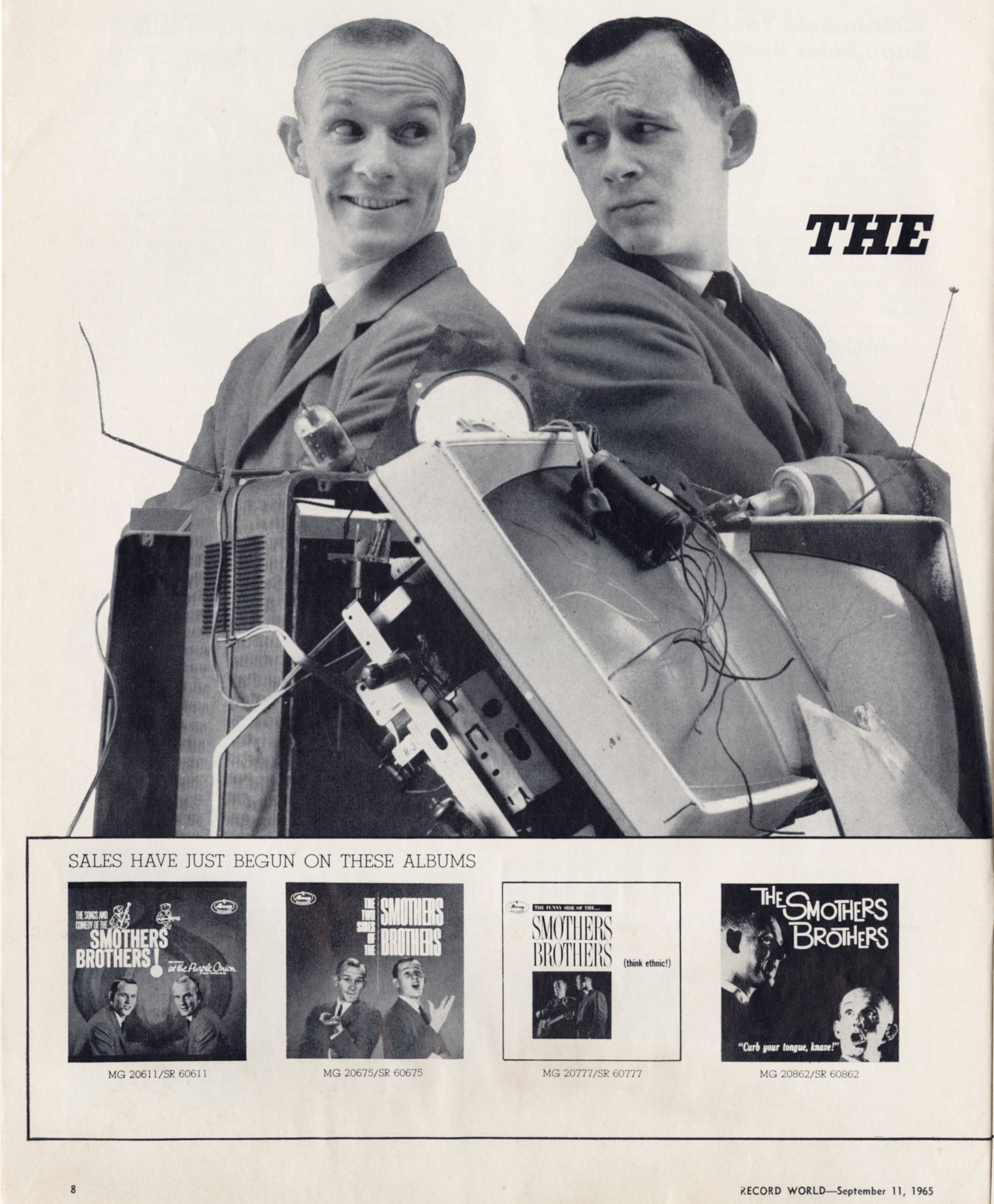 Publicity photo of Tom (left) and Dick (right) Smothers. Image by William Morris Agency, via Wikimedia Commons. Licensed Public domain |